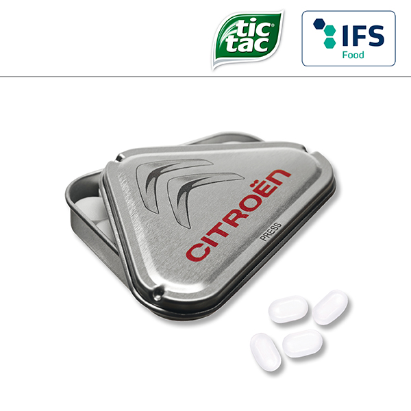 3-Eck-Drück-mich-Dose / Preise pro Stück inkl. Werbeaufdruck 3-farbig zzgl. Nebenkosten. Allgemeine Süßigkeiten-Beschreibung: Füllung: tic tac von Ferrero, Haltbarkeit ca. 9 Monate bei sachgerechter Lagerung- 3-Eck-Drück-mich-Dose für Ihre Süße Werbung mit Geschmack.