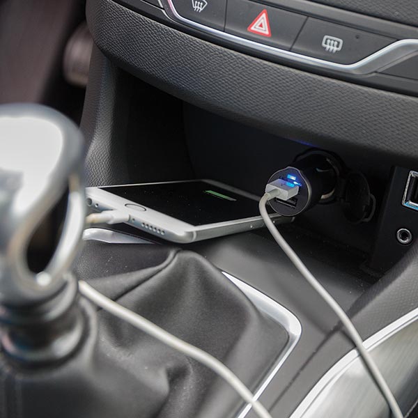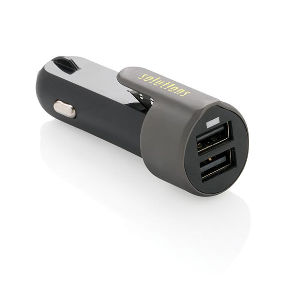 Dual USB Port Auto-Ladegerät mit dem Sie zwei Geräte zur selben Zeit laden können. Mit Gurtschneider und Notfallhammer. Output 5V/3A.