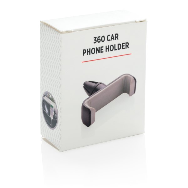 360 Grad universal einsetzbarer und flexibler Telefonhalter für das Auto. Der Ständer wird am Lüftungsfach befestigt und ist aus Hitze resistentem ABS Material, Silikon und Edelstahl Mechanismus, um den Halt zu gewährleisten.
