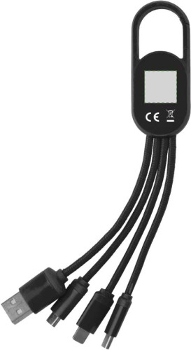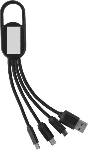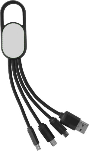 4-in-1 Ladekabelset mit einem Haken. Das Set hat einen USB-, USB-C-, Mikro-USB- und Lightning-Stecker (nur einseitig). Nach der Lasergravur leuchtet das Logo auf, wenn das Kabel in Gebrauch ist.