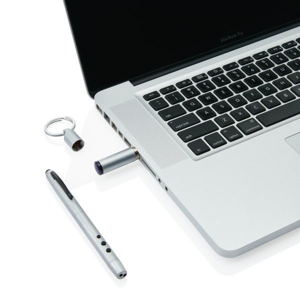Silberner 4-in-1 Messingstift mit Presenter, Laserpointer, Stift mit schwarzer Mine und Stylus. Inkl. Empfänger aus Messing mit Schlüsselanhänger und 6 Knopfbatterien.