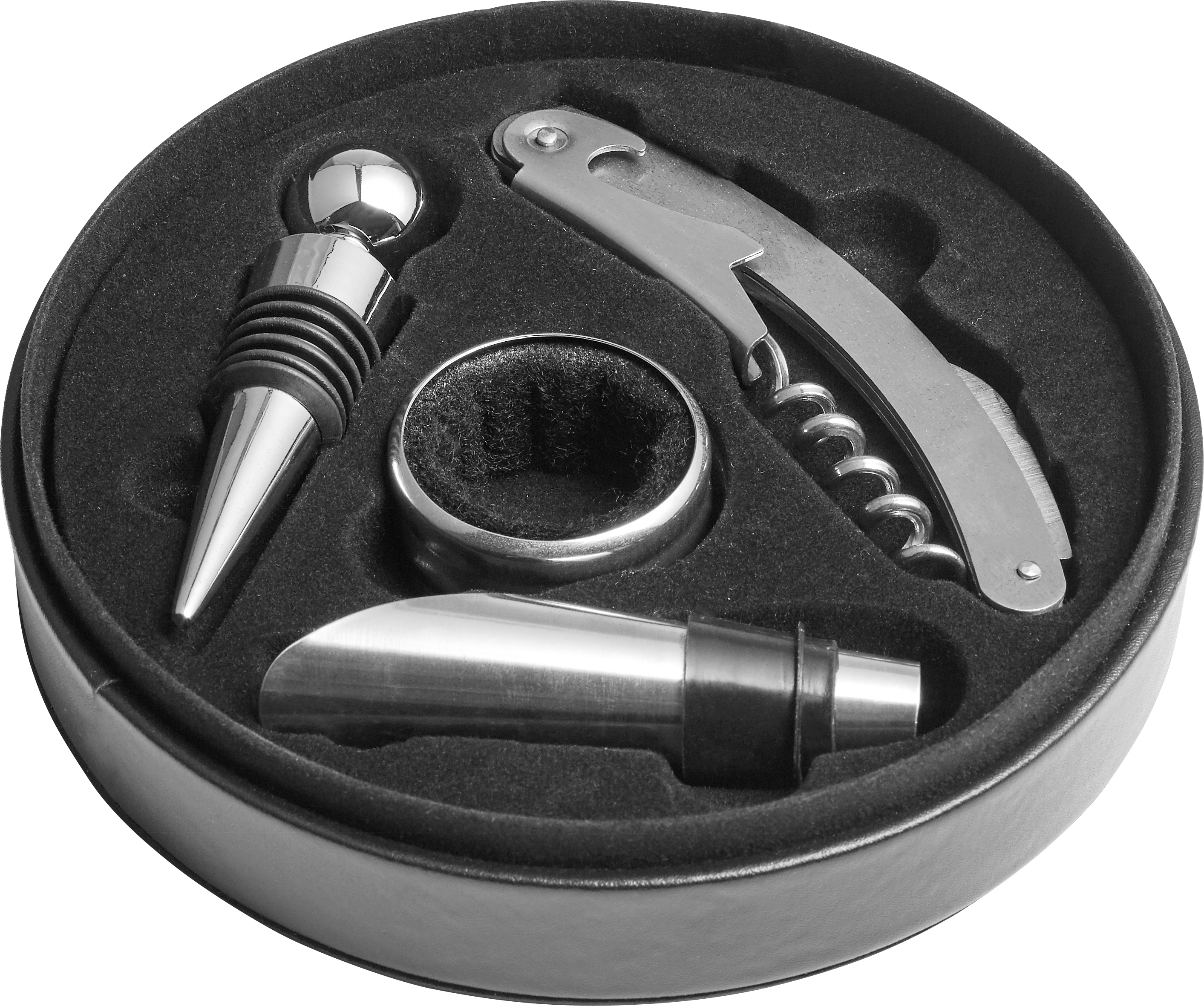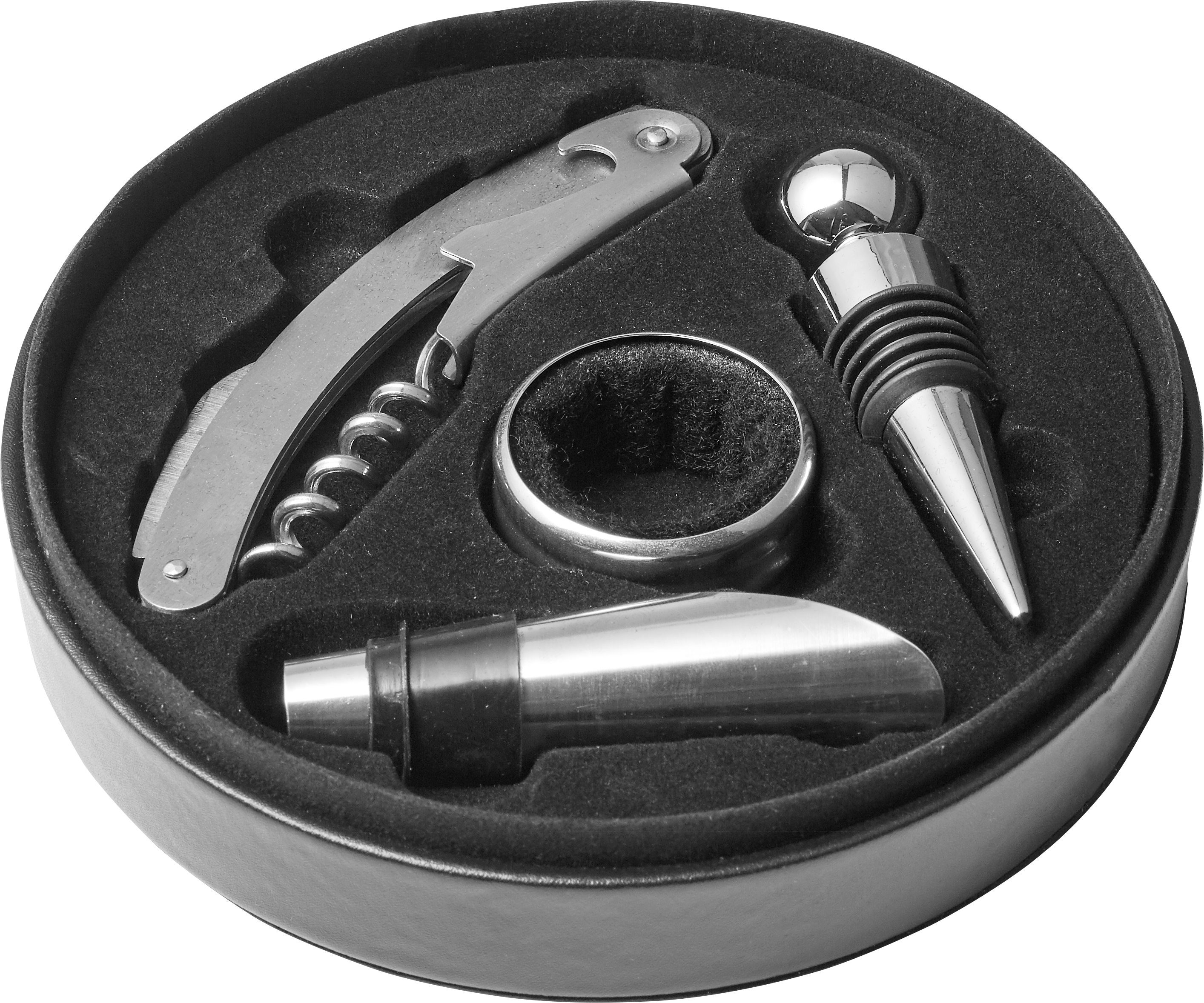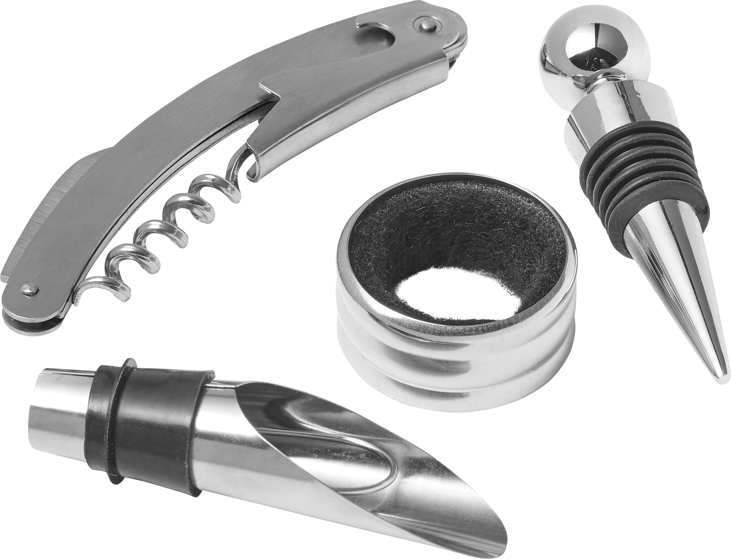 4-teiliges Weinset “Cabernet“, bestehend aus einem Weinverschluss, einem Korkenzieher, einem Tropfring und einem Ausgießer. Alle Artikel sind in einer Geschenkbox aus Kunststoff verpackt.
