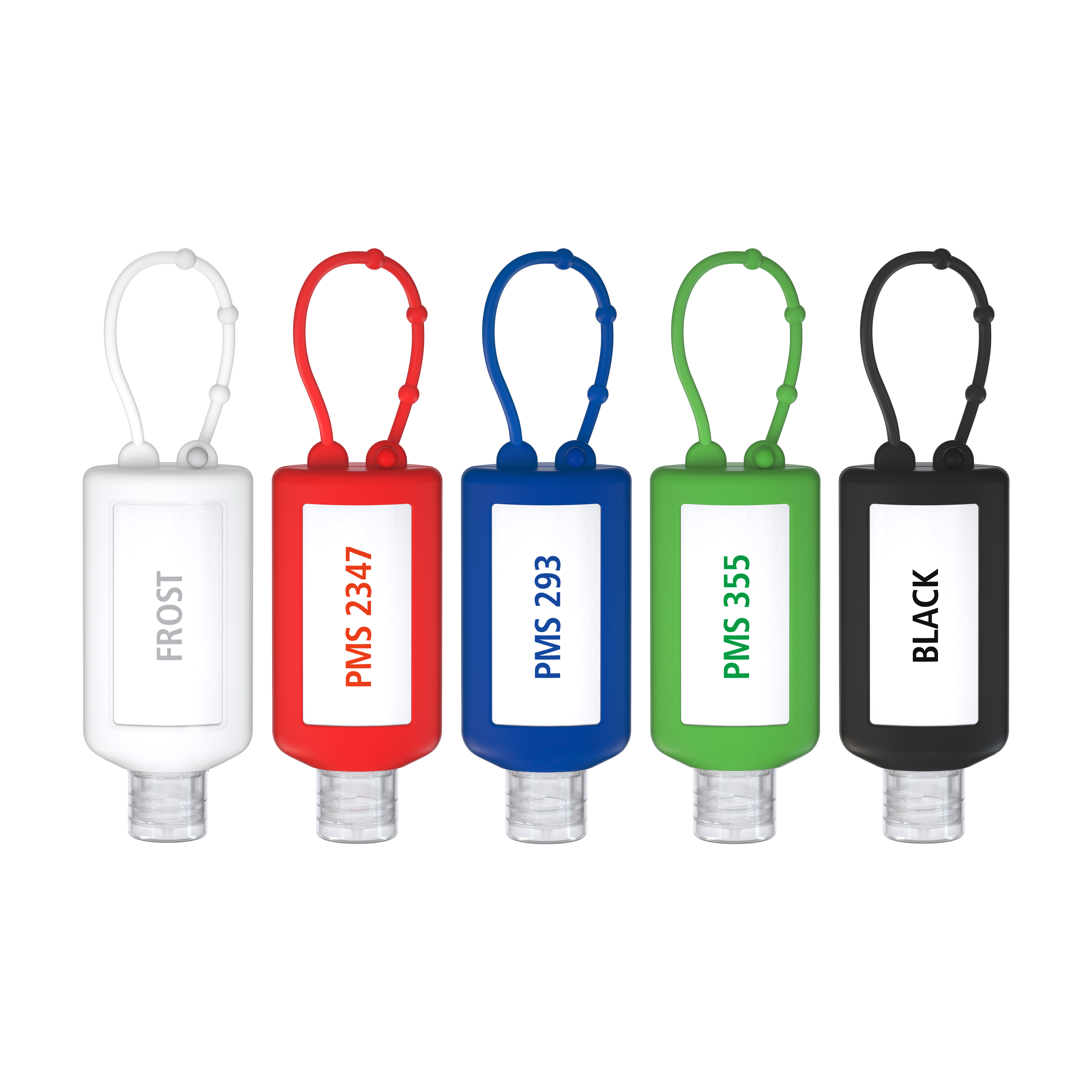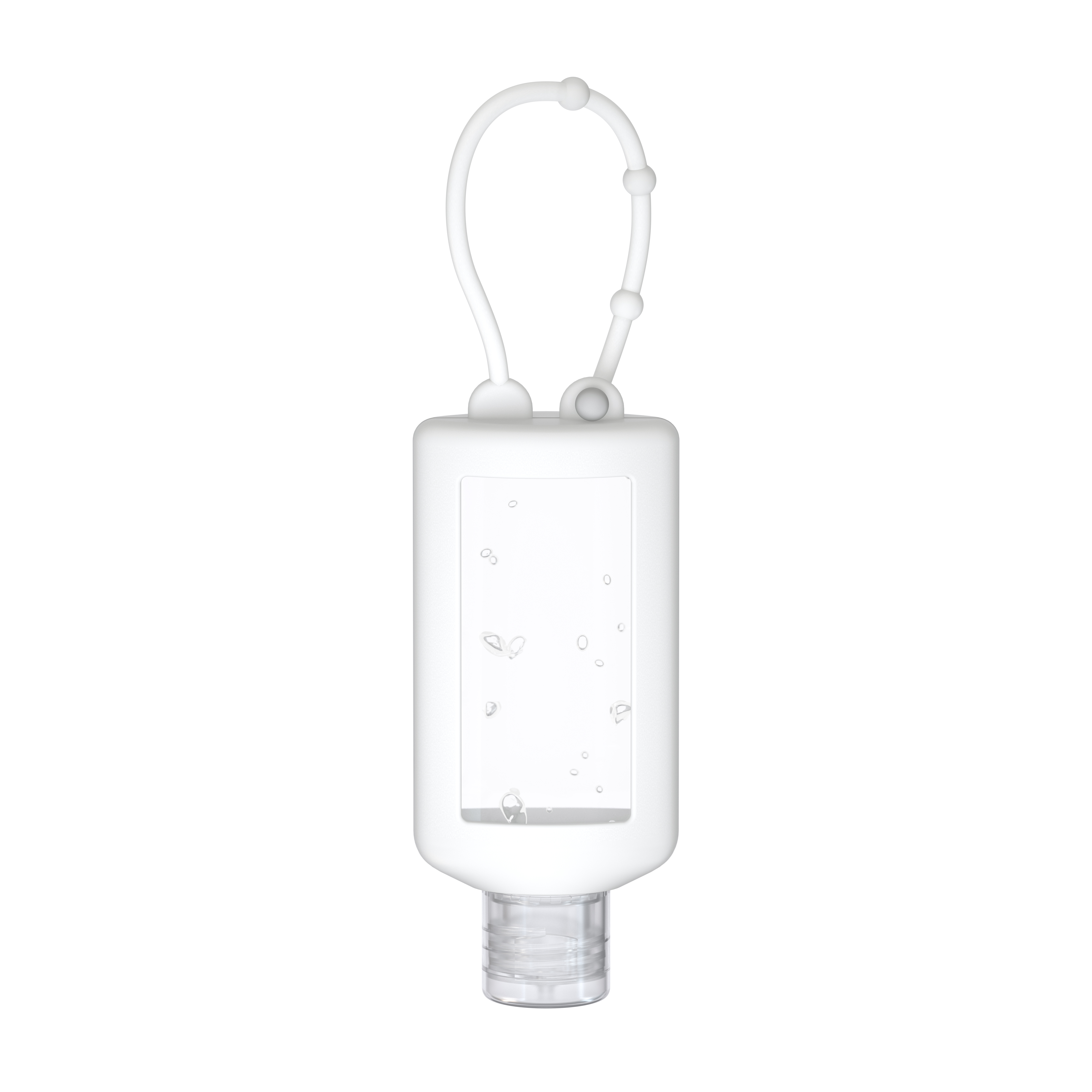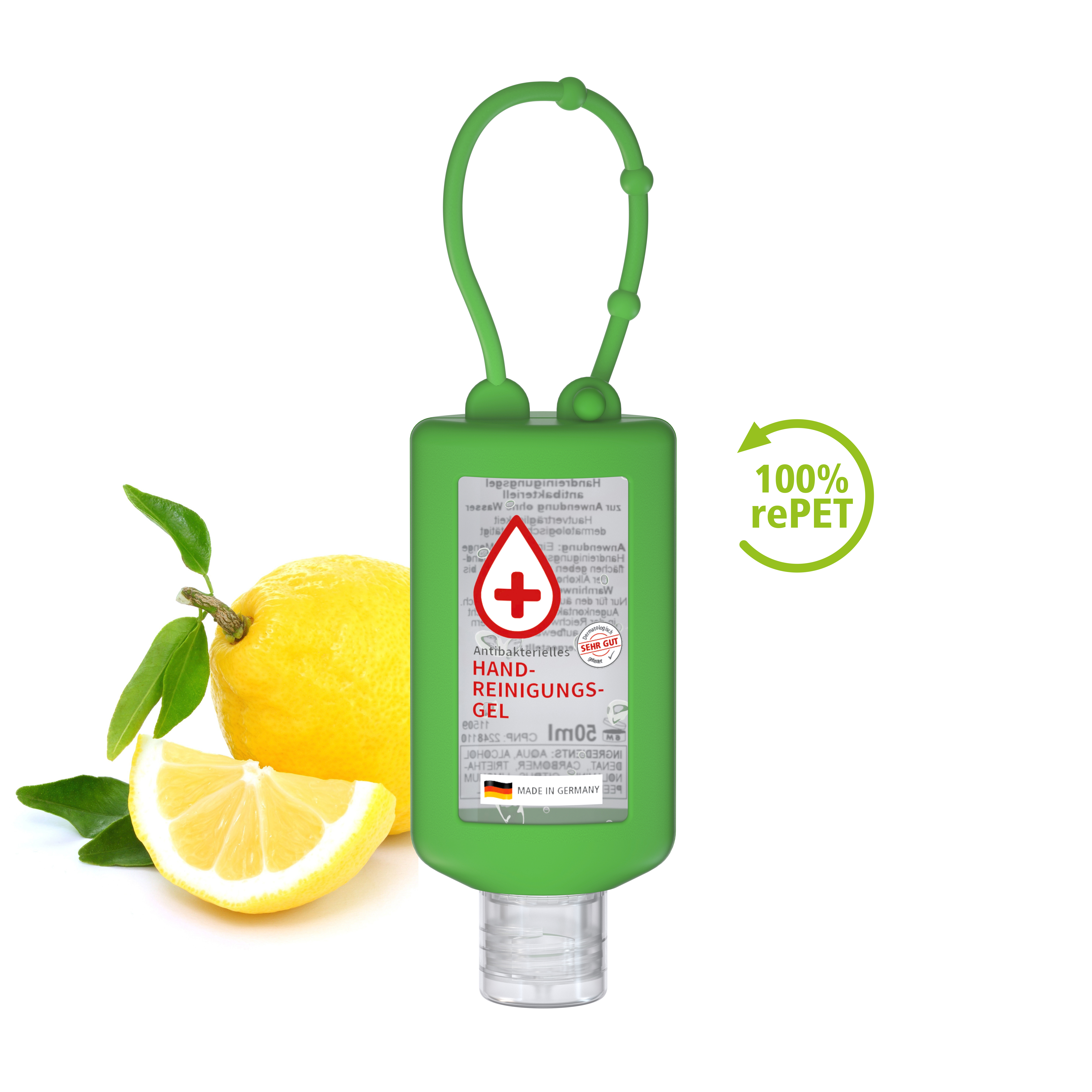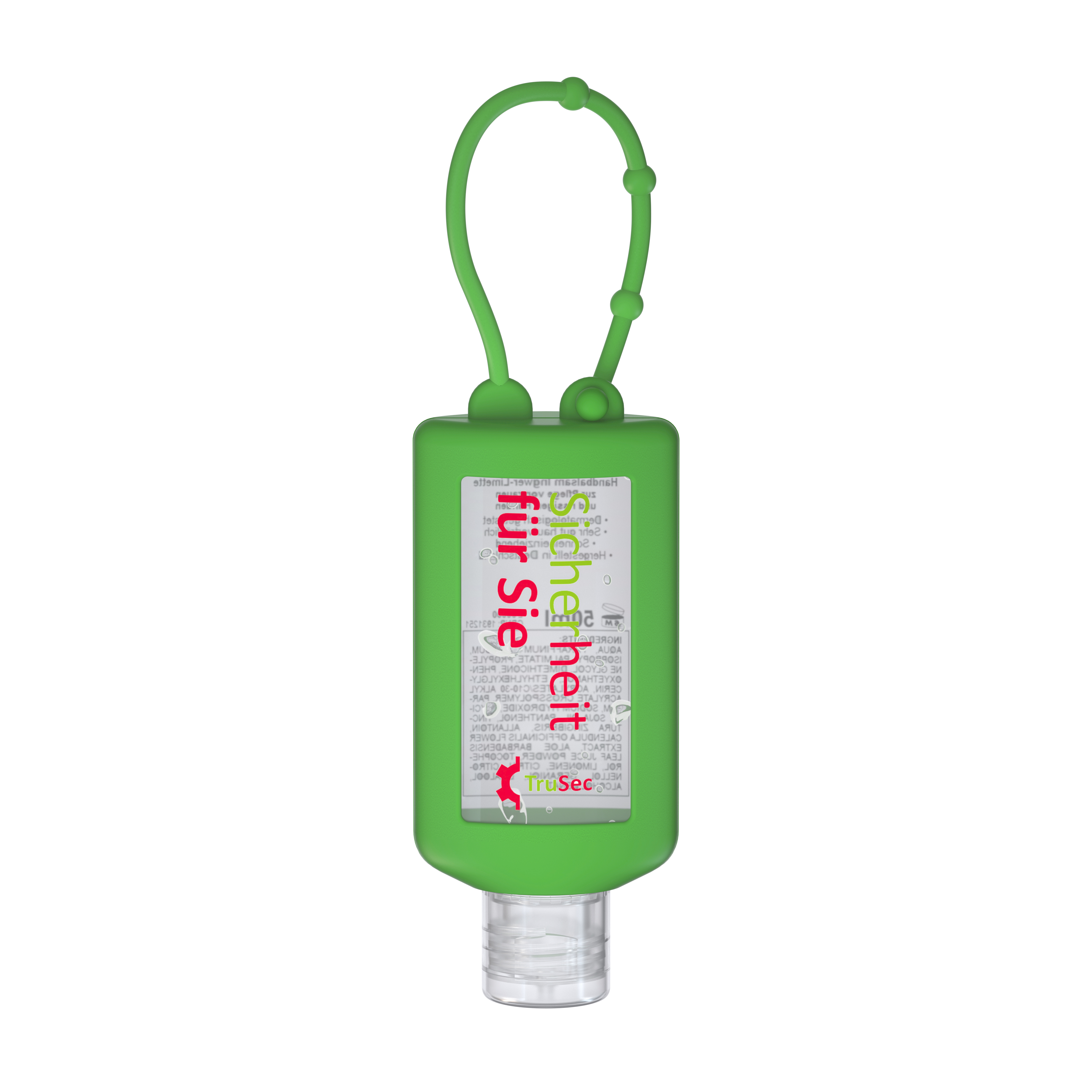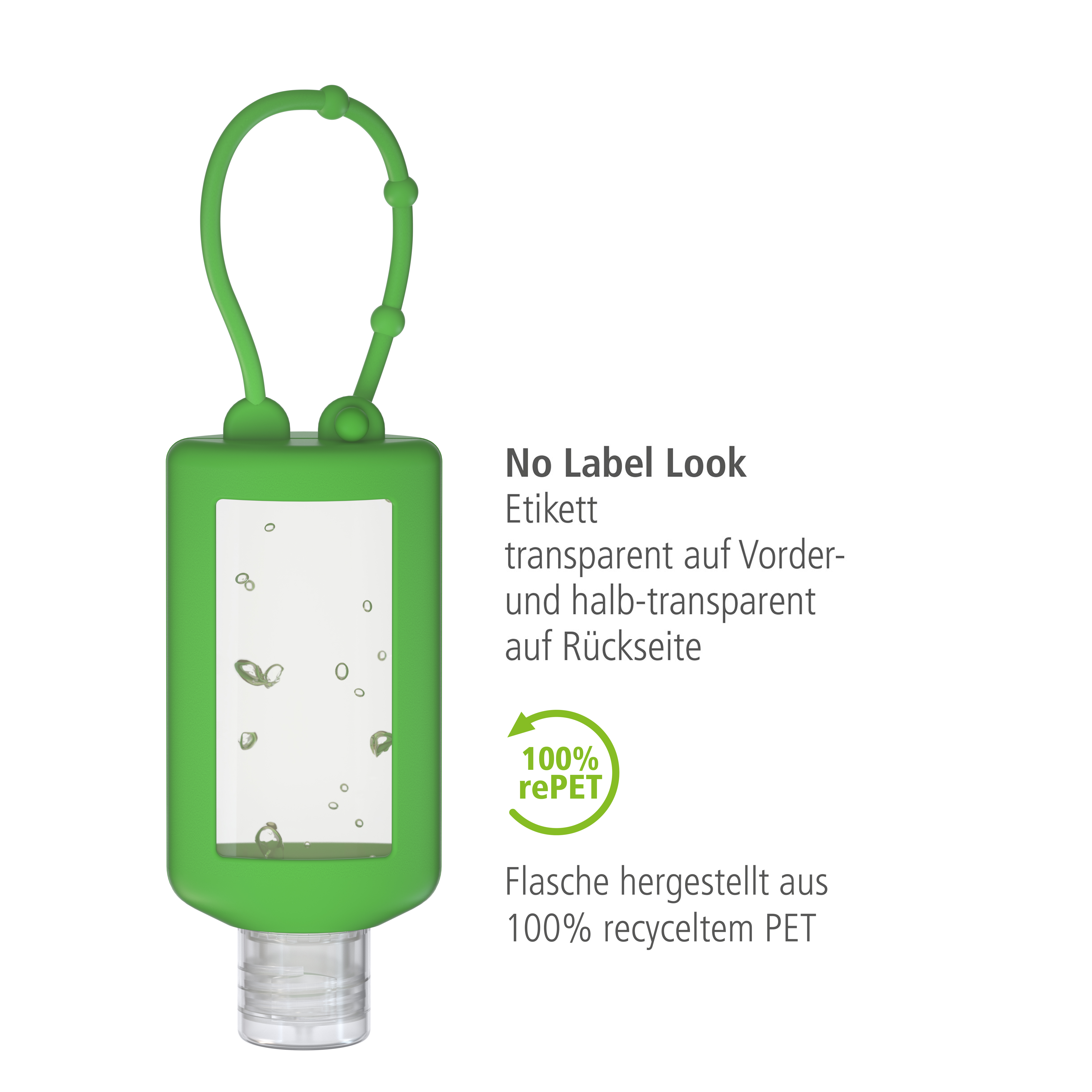 Praktische Kosmetikflasche zum Anhängen! Das Fläschchen mit Silikonhülle ist nicht nur optisch ein echter Hingucker! Raffiniert mit Schlaufe zum Anhängen ans Handgepäck, an den Rucksack oder an den Kinderwagen. 50 ml Flasche kristallklar; Klappdeckel natur-transparent; Silikonhülle und Schlaufe in grün. Hygiene ist für jedermann Thema: Das antibakterielle Handreinigungsgel ist der ideale Begleiter im Alltag. Prompt und einfach ohne Wasser anwendbar: Die Hände fühlen sich sofort sauber und gepflegt an. • Vegan • pH-hautneutral• Ohne Parabene• Ohne Konservierungsstoffe• Dermatologisch getestet „Sehr gut hautverträglich“• Hergestellt in Deutschland. Dekoration: No Label Look: Etikett PP (transparent) auf Vorder- und Rückseite, Druck 4c CMYK. Rückseite mit halbtransparentem Frost-Druck, um die Lesbarkeit der Texte zu gewährleisten. Das Produkt enthält ca. 57% (v/v) Ethanol.