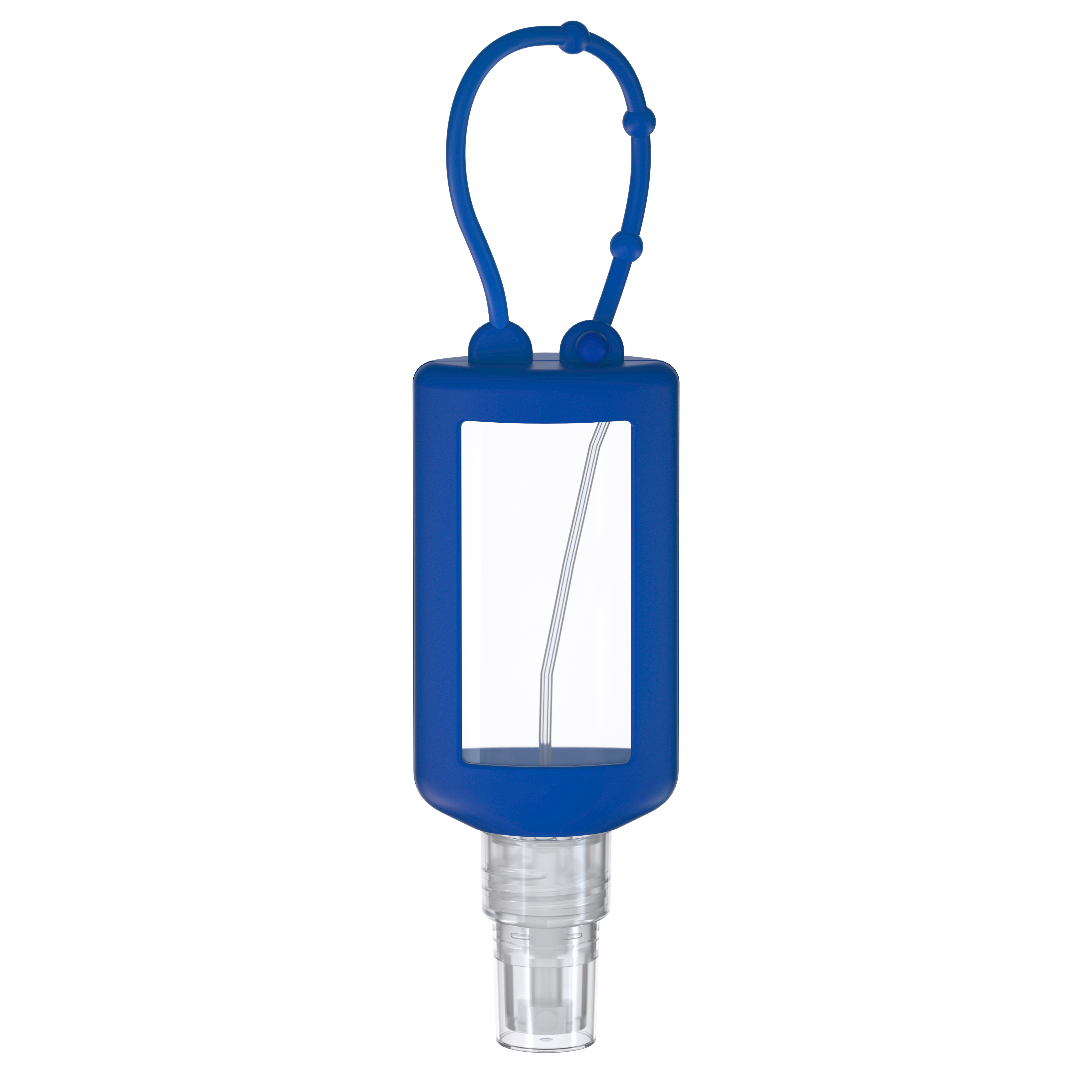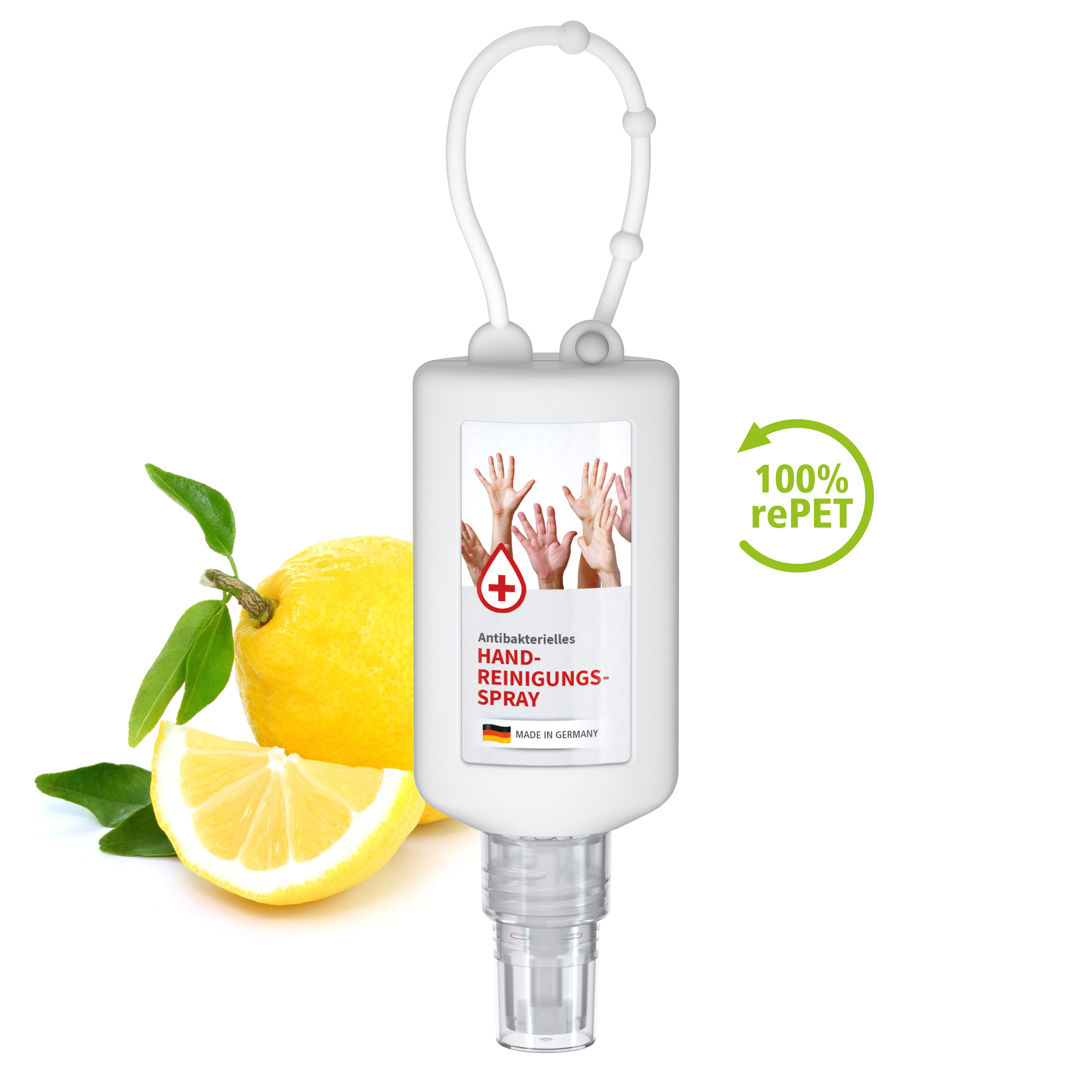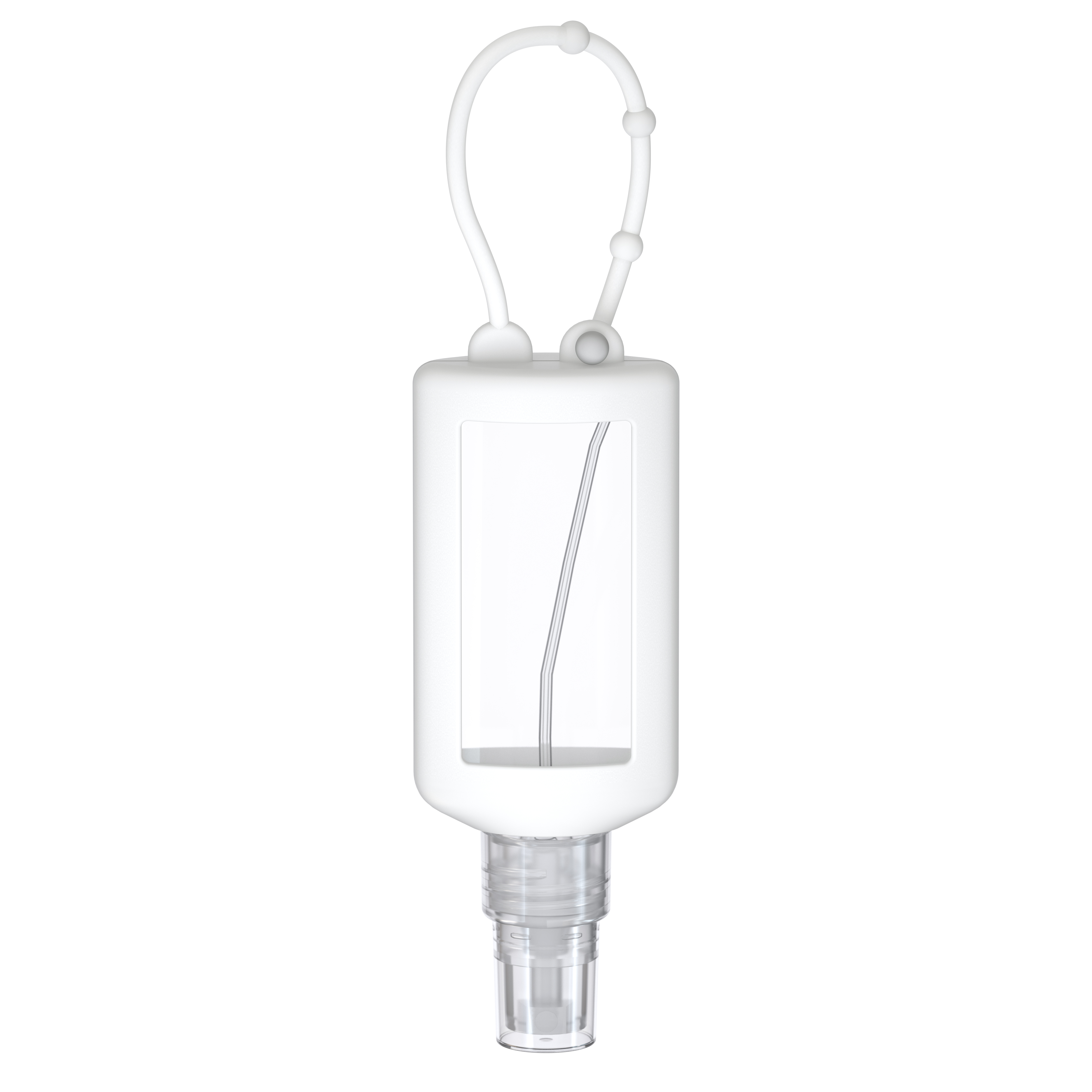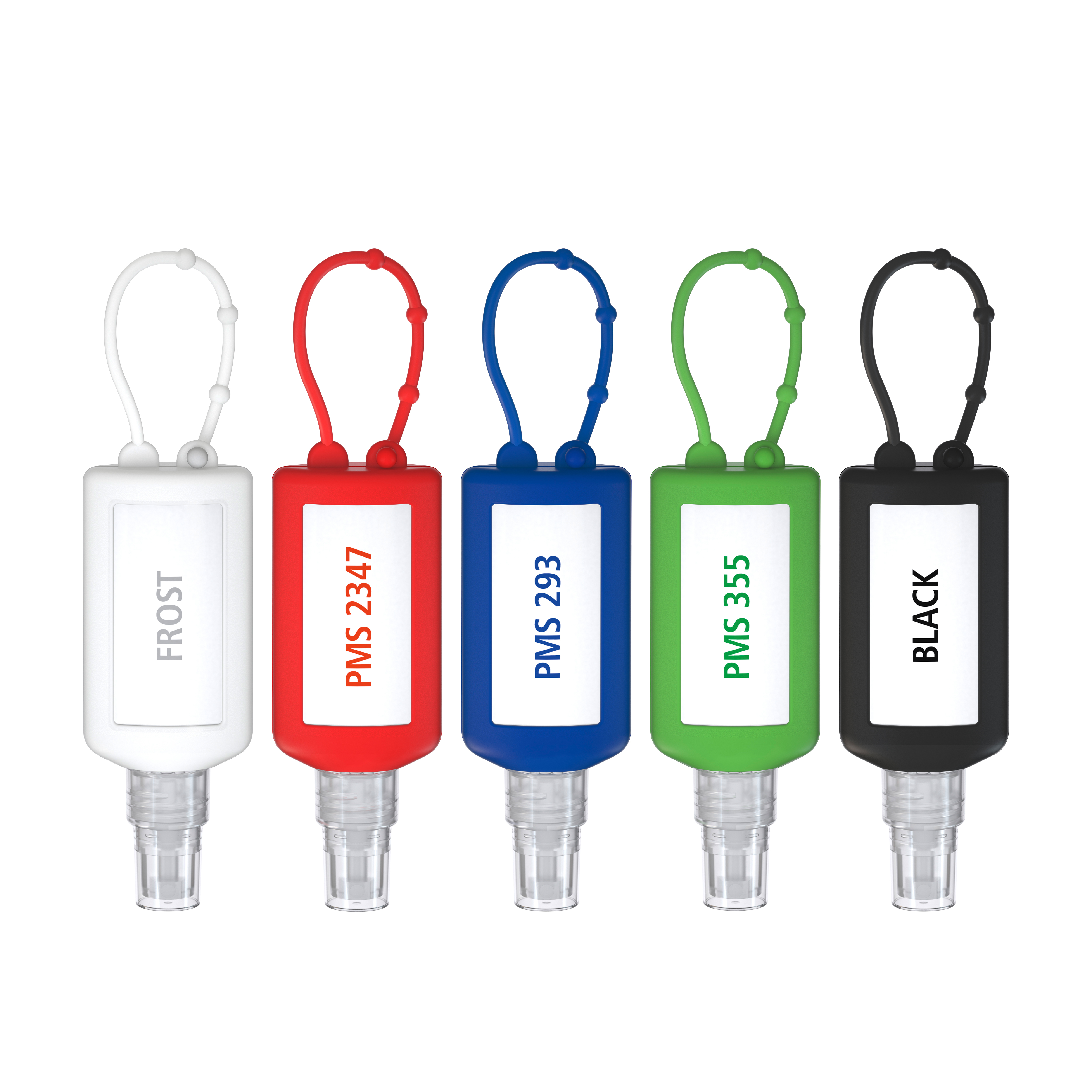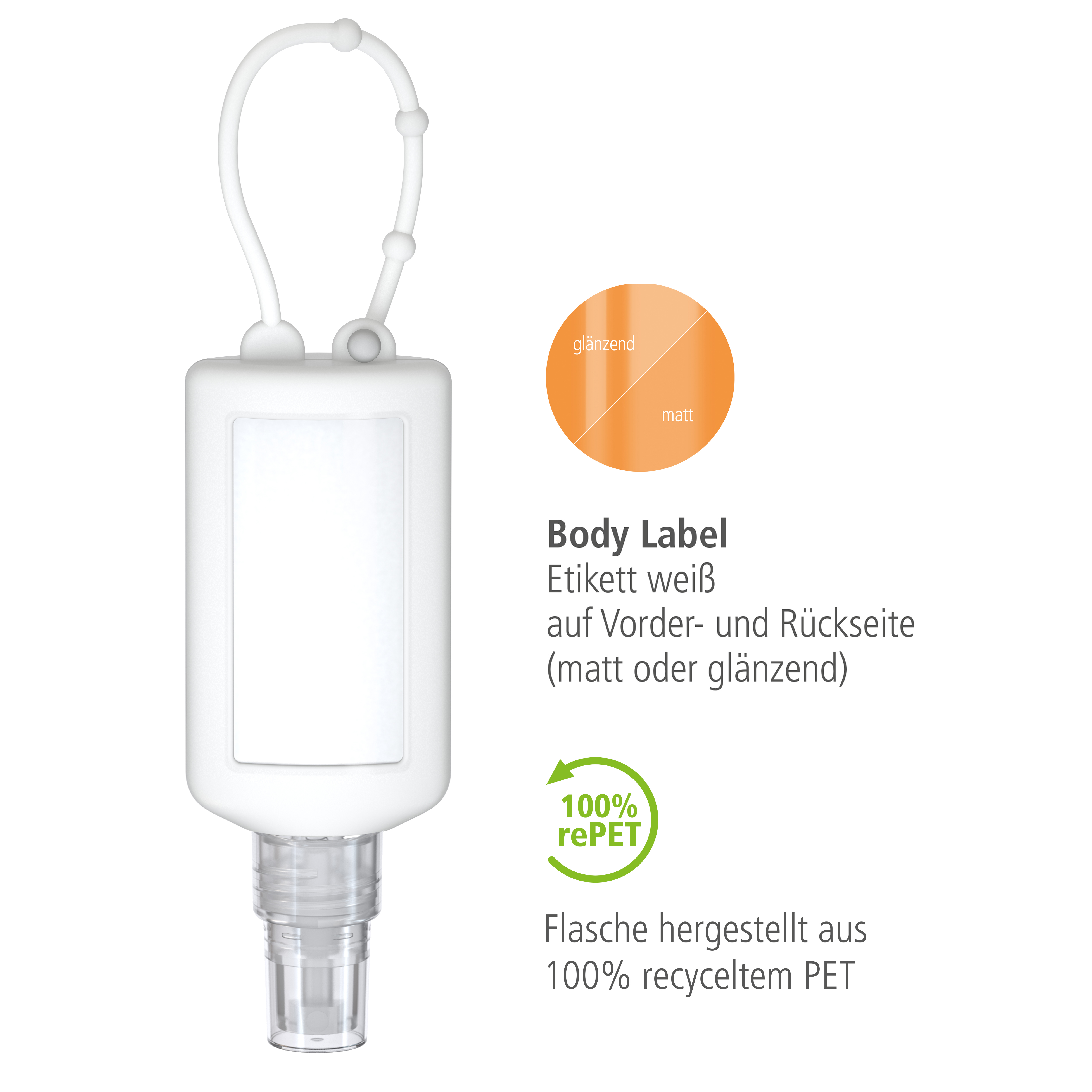 Praktische Kosmetikflasche zum Anhängen! Das Spray mit Silikonhülle ist nicht nur optisch ein echter Hingucker! Raffiniert mit Schlaufe zum Anhängen ans Handgepäck, an den Rucksack oder an den Kinderwagen. 50 ml PET Flasche (kristallklar) mit transparentem Pumpaufsatz und Schutzkappe; Silikonhülle und Schlauf in frost. Handreinigungsspray, antibakteriell. Täglich kommen unsere Hände mit Schmutz in Kontakt. Besonders praktisch für unterwegs ist das Handreinigungsspray, antibakteriell: Dieses "flüssige Hygienetuch" ist einfach in der Anwendung, sparsam in der Dosierung und Ihre Hände fühlen sich frisch, gepflegt und geschmeidig an. • Vegan • pH-neutral, • Ohne Parabene • Ohne KonservierungsstoffeDermatologisch "sehr gut hautverträglich" getestet. Dekoration: Body Label: Etikett PE (weiß), Druck 4c CMYK. Wahlweise glänzend oder matt.Das Produkt enthält ca. 57% (v/v) Ethanol.