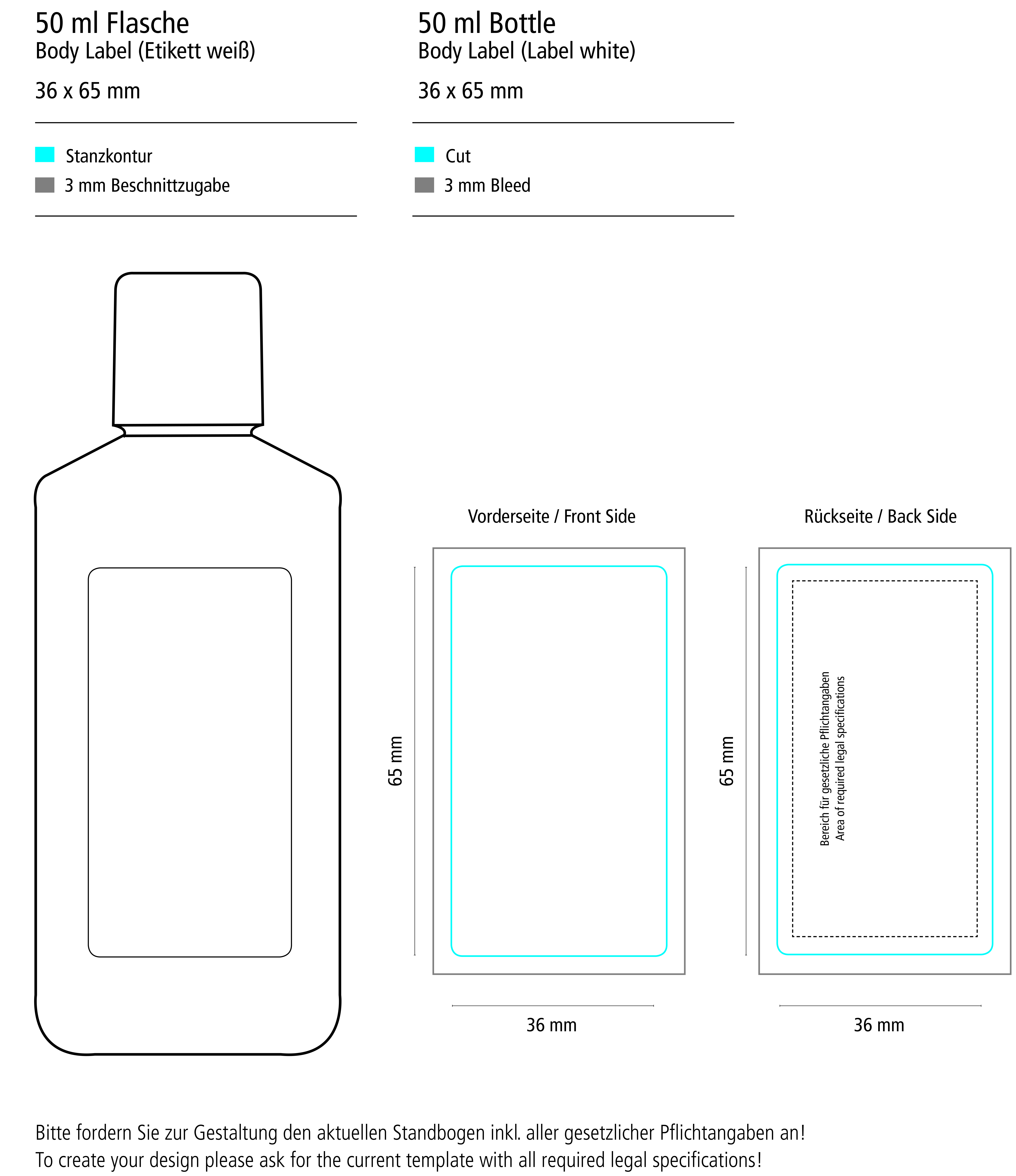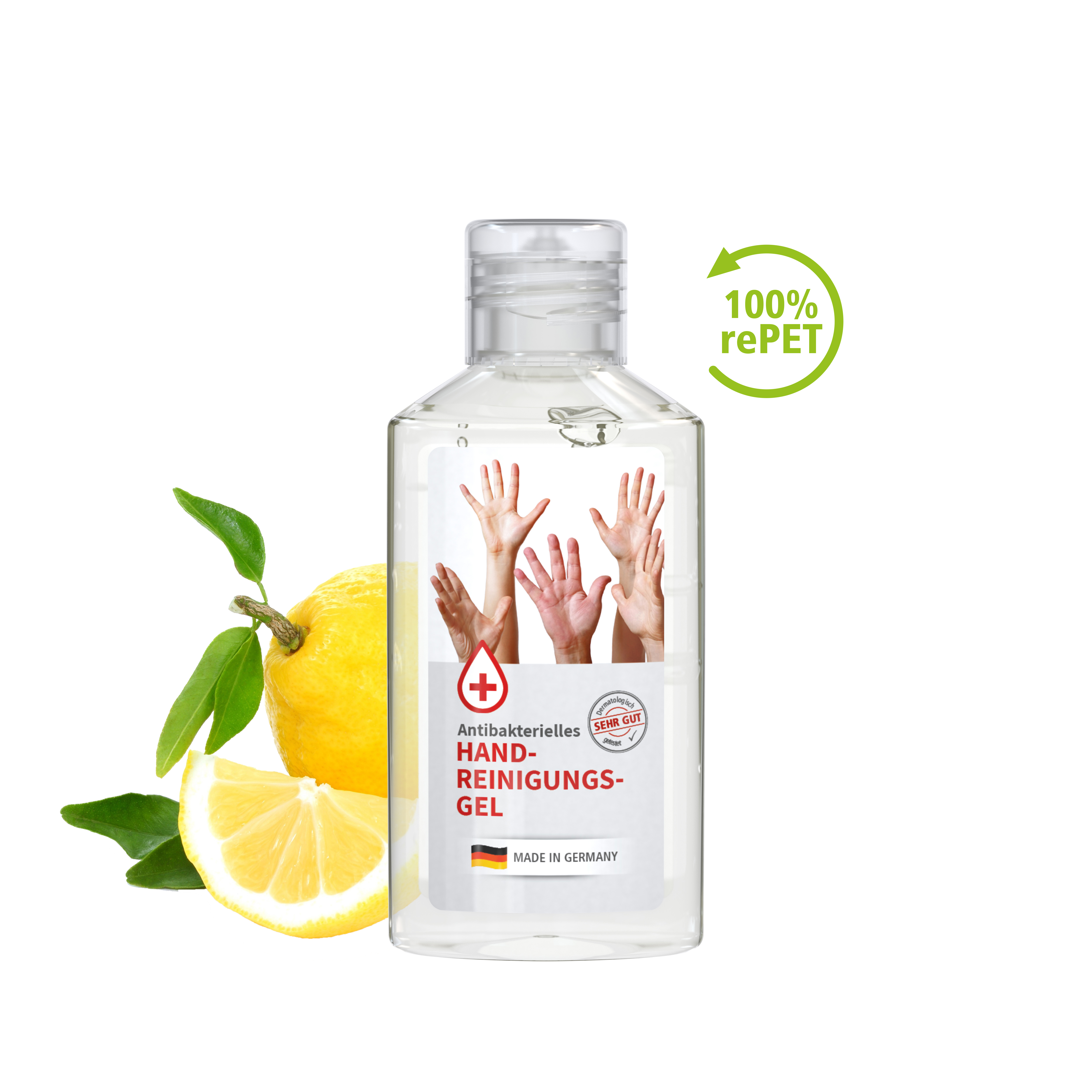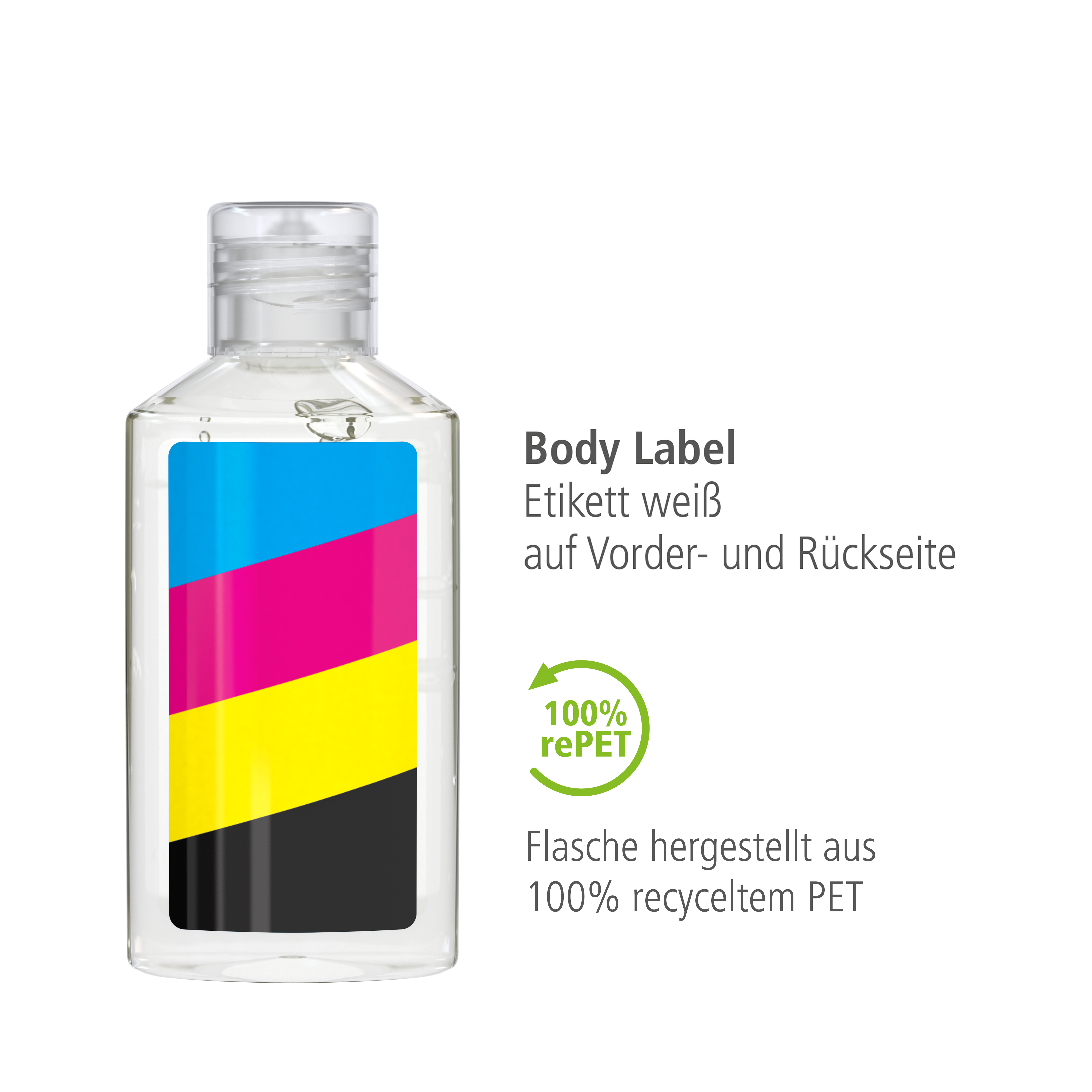 50 ml PET Flasche (kristallklar) mit Klappdeckel , (natur-gefrostet) Hygiene ist für jedermann Thema: Das antibakterielle Handreinigungsgel ist der ideale Begleiter im Alltag. Prompt und einfach ohne Wasser anwendbar: Die Hände fühlen sich sofort sauber und gepflegt an. • Vegan • pH-hautneutral• Ohne Parabene• Ohne Konservierungsstoffe• Dermatologisch getestet „Sehr gut hautverträglich“• Hergestellt in Deutschland. Dekoration: Body Label: Etikett PE (weiß) auf Vorder- und Rückseite, Druck 4c CMYK. Das Produkt enthält ca. 57% (v/v) Ethanol.