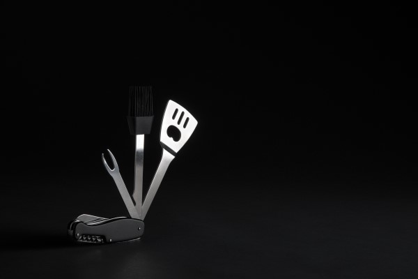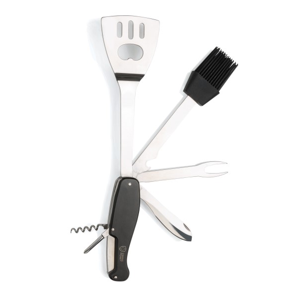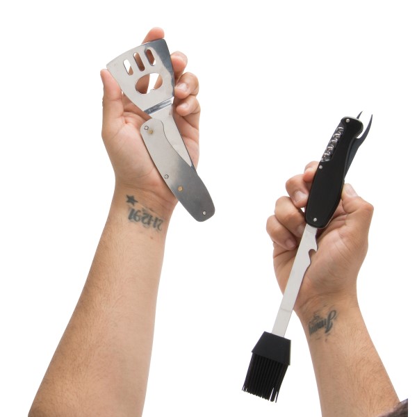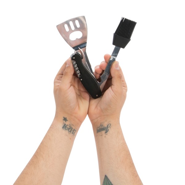 Einklappbares 7-in-1 Barbecue Set: Fleischgabel, Wender, Messer, Pinsel, Kapselheber, Korkenzieher, Kreuzschraubendreher.