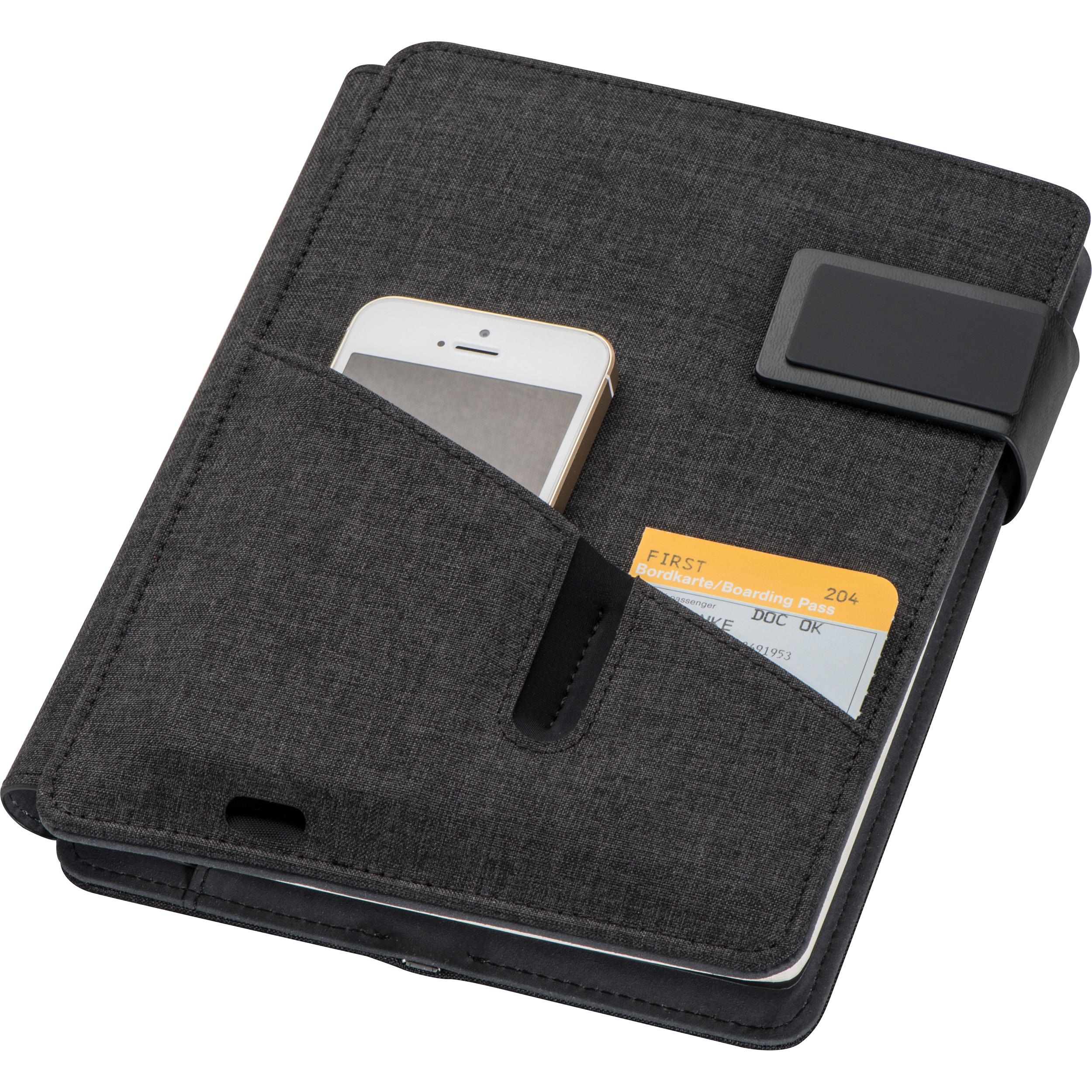 Powerbank Mappe A5 mit integrierter Powerbank (4.000 mAh), Notizbuch (128 Seiten) und Einsteckfach auf der Vorderseite. Ihre Werbung drucken wir auf die Vorderseite.