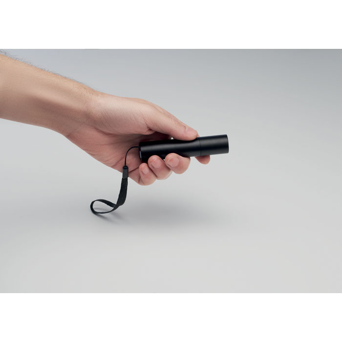 Wiederaufladbare Taschenlampe mit 110 Lumen, 3 Lichtmodi und Zoomfunktion. Aluminium. Handschlaufe. Inkl. 400mAh-Akku und Ladekabel.