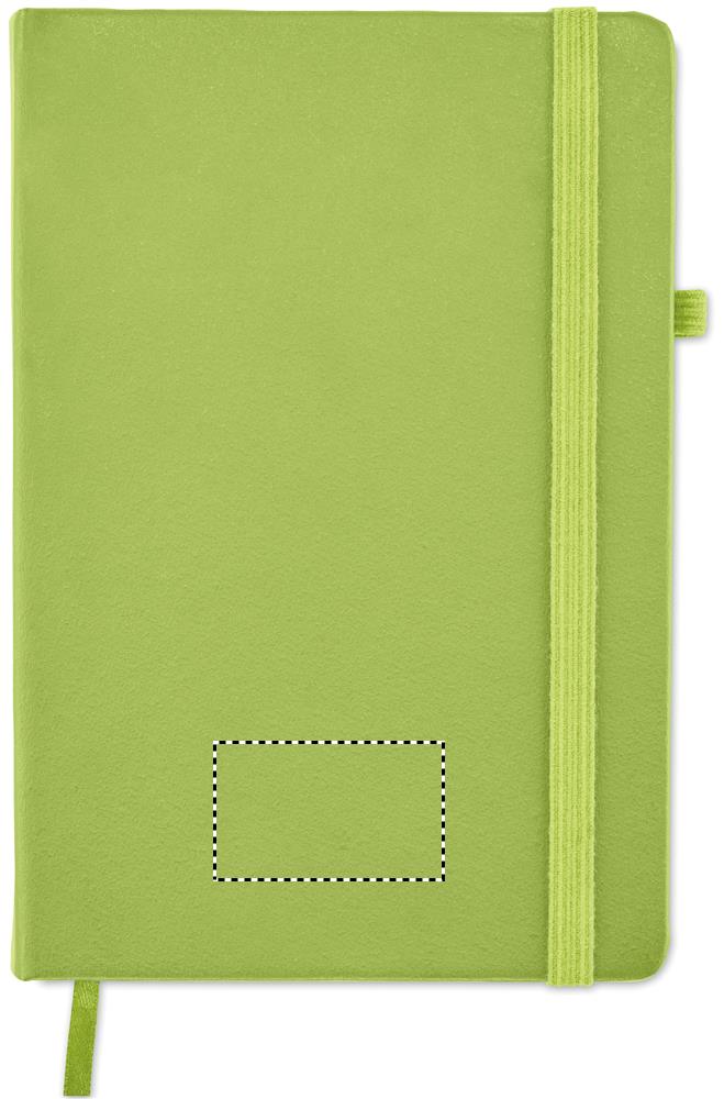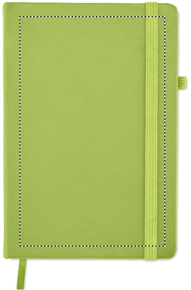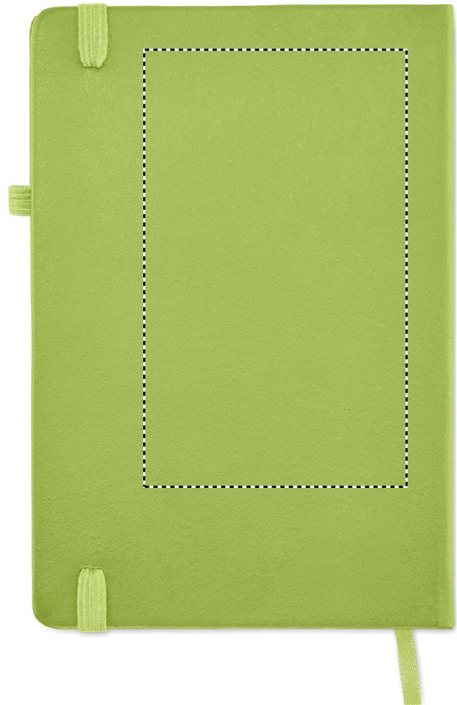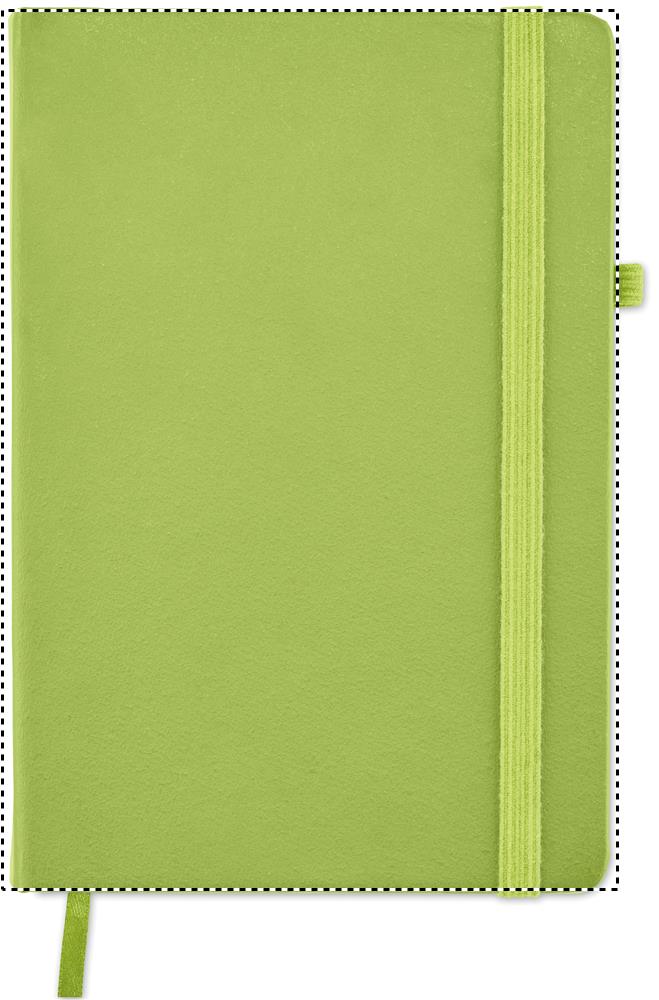 DIN A5 Notizbuch mit Hardcover aus 70% recyceltem Pre-Consumer-Leder und 30% PU-Latex. 96 Blatt (192 Seiten) liniertes Recyclingpapier. Mit farblich passendem elastischen Baumwoll Verschlussband und Stiftschlaufe.