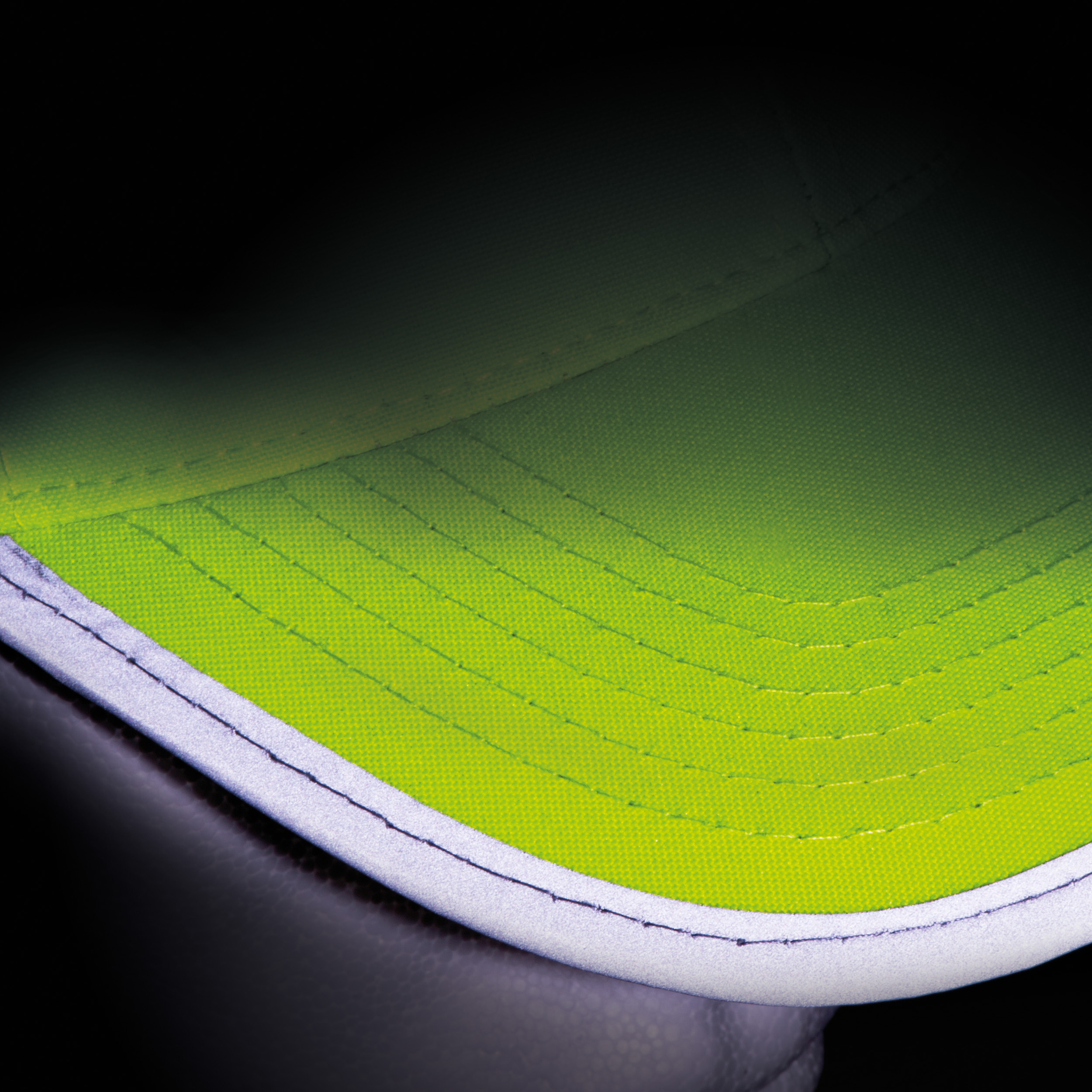6 Panel Baseballcap für Erwachsene aus Polyester mit reflektierender Borte und Klettverschluss. AZO-frei gefärbt. Diese Mütze wird mit Ihrem Logo auf der Stirnseite bedruckt.