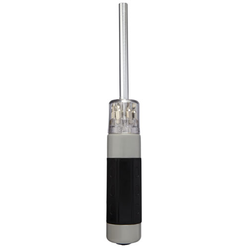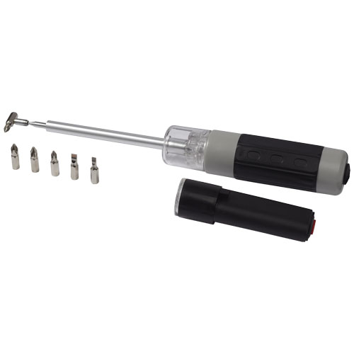 Allzweck-Schraubendreher mit Taschenlampe. Allzweck-Schraubendreher mit integriertem, magnetischem Aufhebe-Werkzeug und abnehmbarer Taschenlampe. Beinhaltet die folgenden Schraubendreher-Bits: PH1, PH2, PZ1, PZ2 und SL4, SL5. Batterien sind enthalten und eingelegt. Verpackt in einer STAC-Geschenkschachtel. %%%. ABS und Stahl.