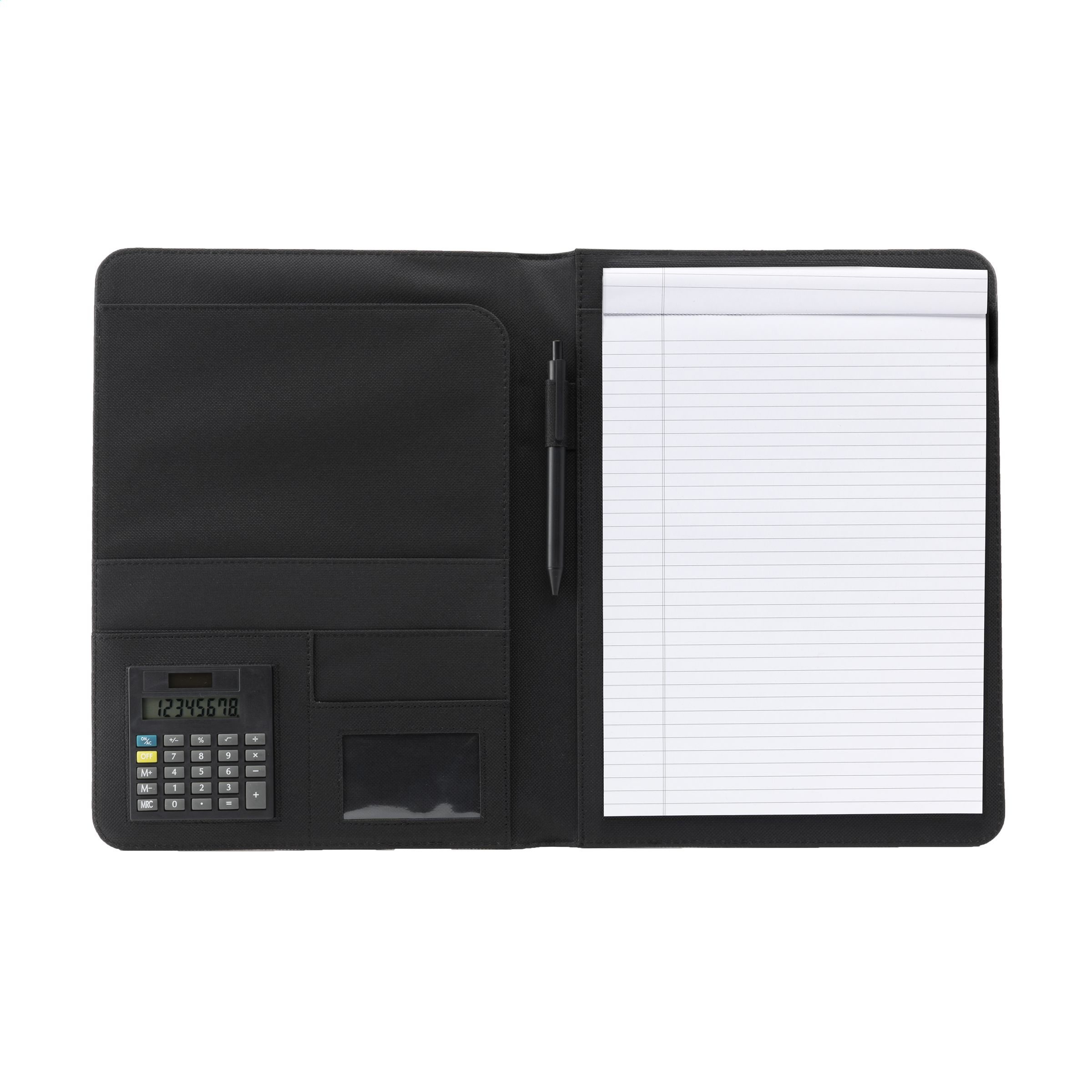 Schreibmappe/Dokumentenmappe aus 600 D Polyester/Lederimitat im DIN A4-Format. Inkl. herausnehmbarem Dualpower-Solarrechner (inkl. Zellbatterie), Schreibblock und Kugelschreiber.