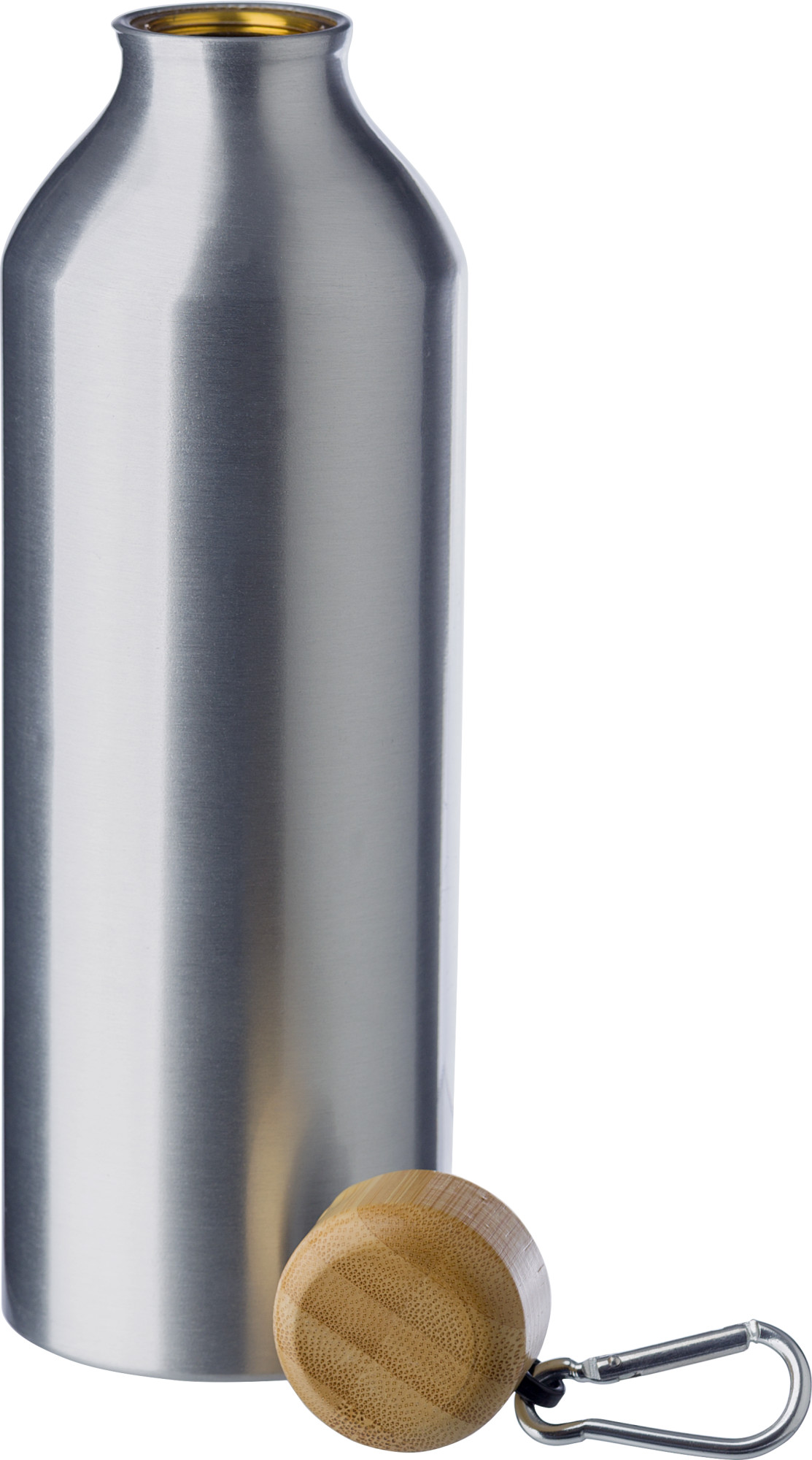 Aluminium-Trinkflasche (750 ml) mit Bambusdeckel. Inklusive Karabinerhaken. Nicht für warme Getränke oder Getränke mit Kohlensäure geeignet. Nur für kaltes Wasser.