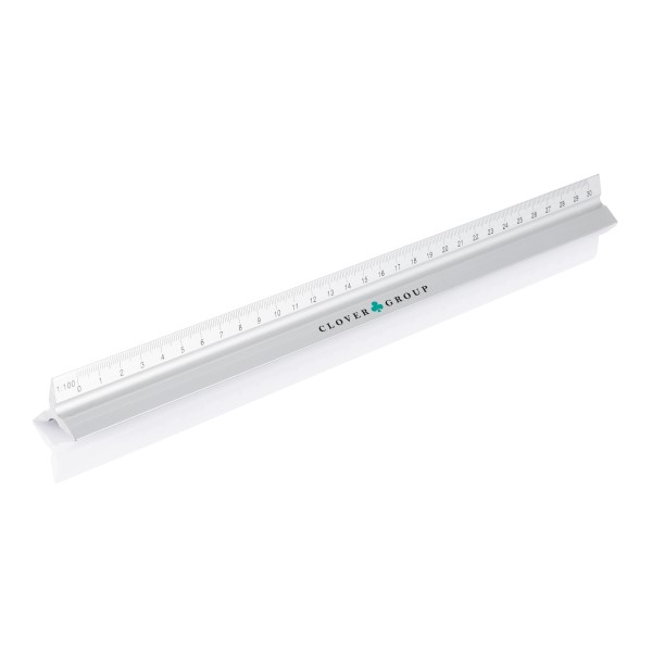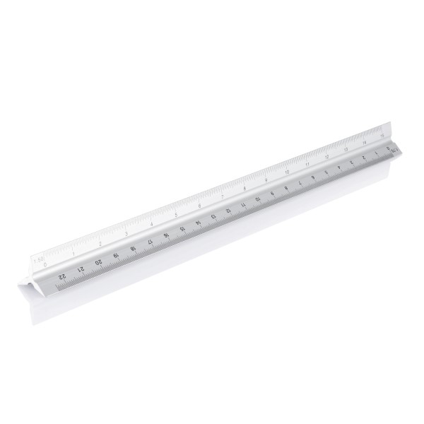 Aluminiumlineal mit 5 verschiedenen Skalen (1:20, 1:25, 1:50, 1:75 und 1:100); 1 Seite ist für die Werbeanbringung vorgesehen.