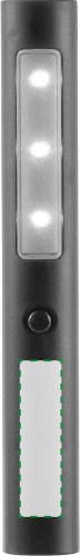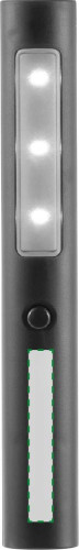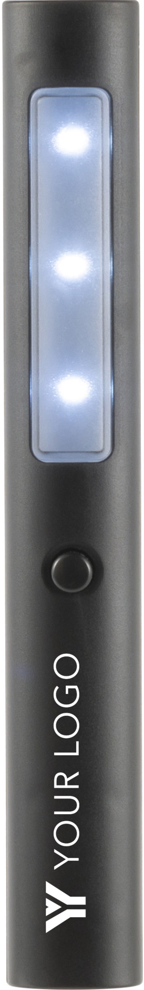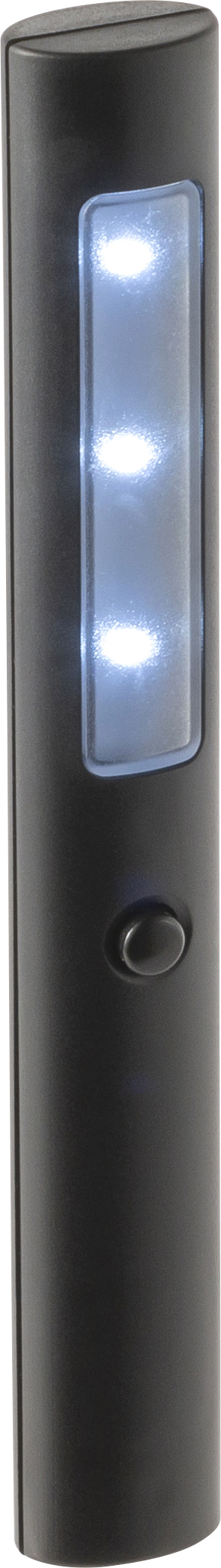Arbeitslampe aus ABS-Kunststoff mit drei LED Lichtern und zwei Magneten auf der Rückseite. Licht-Einstellungen: blinkend und konstant.