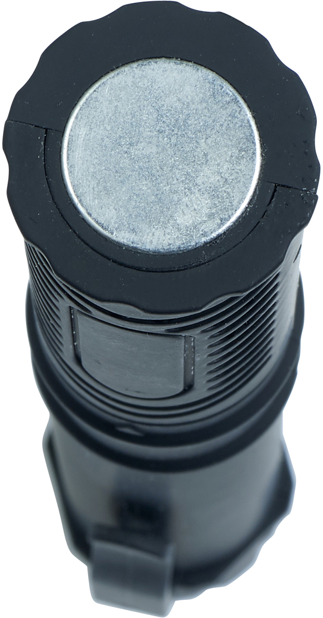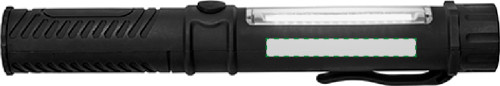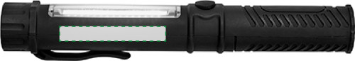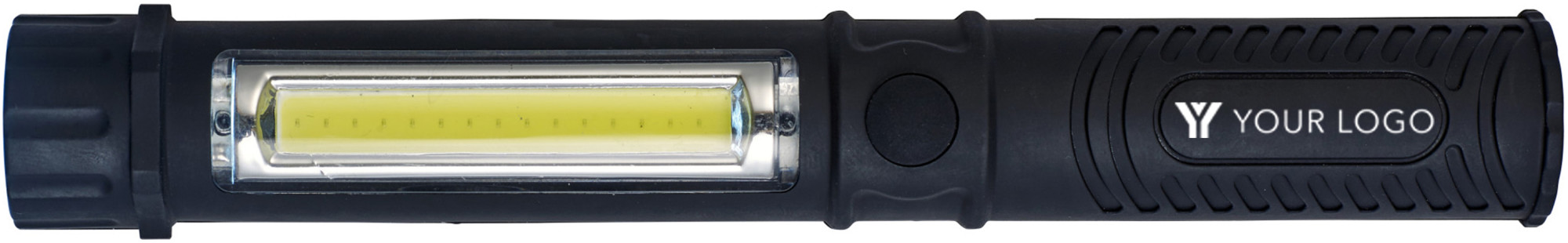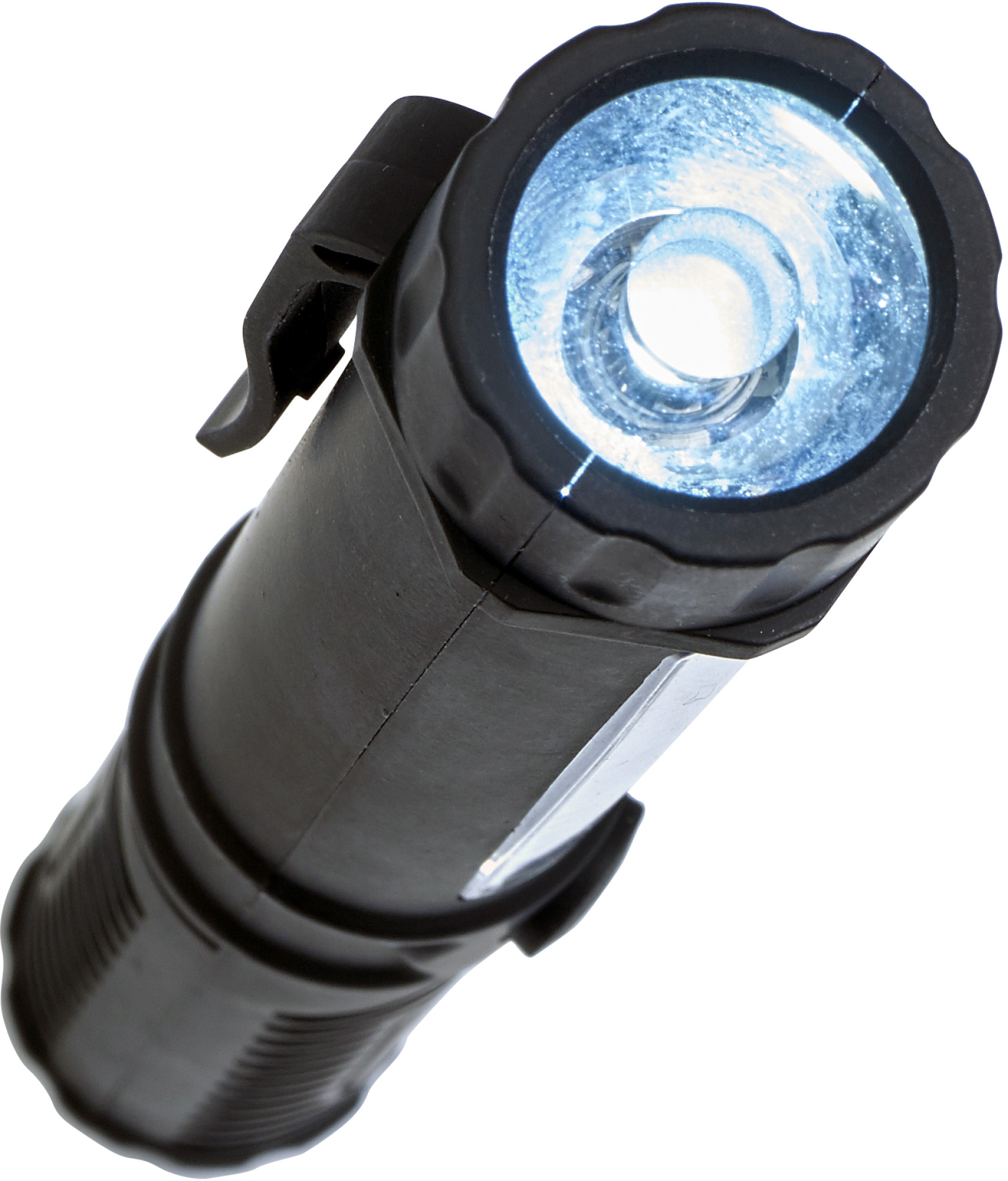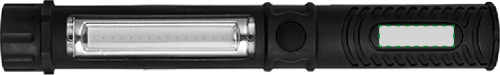 Arbeitslampe aus Kunststoff, mit runder COB-Leuchte vorne und einem COB-Leuchtstreifen an der Seite, Magnet und Kunststoffclip.