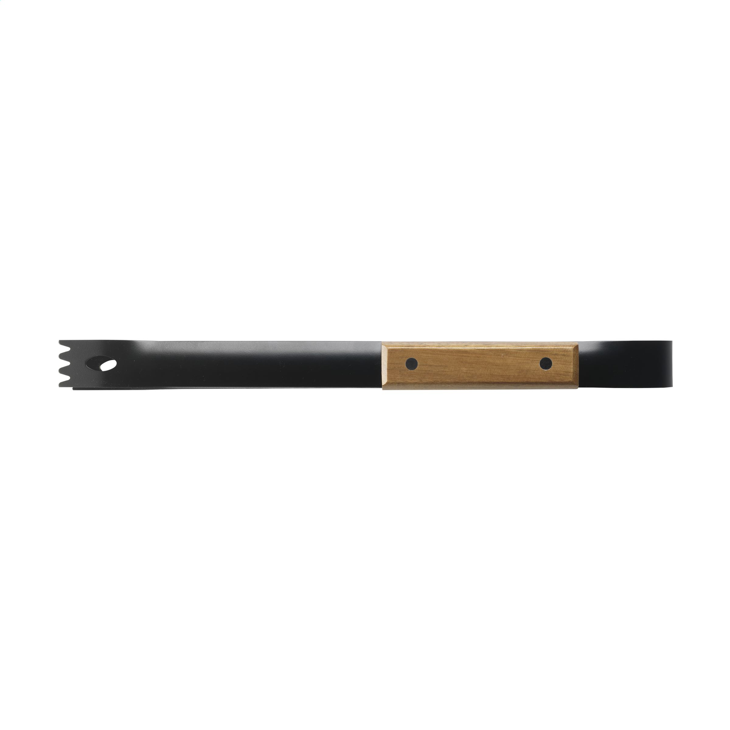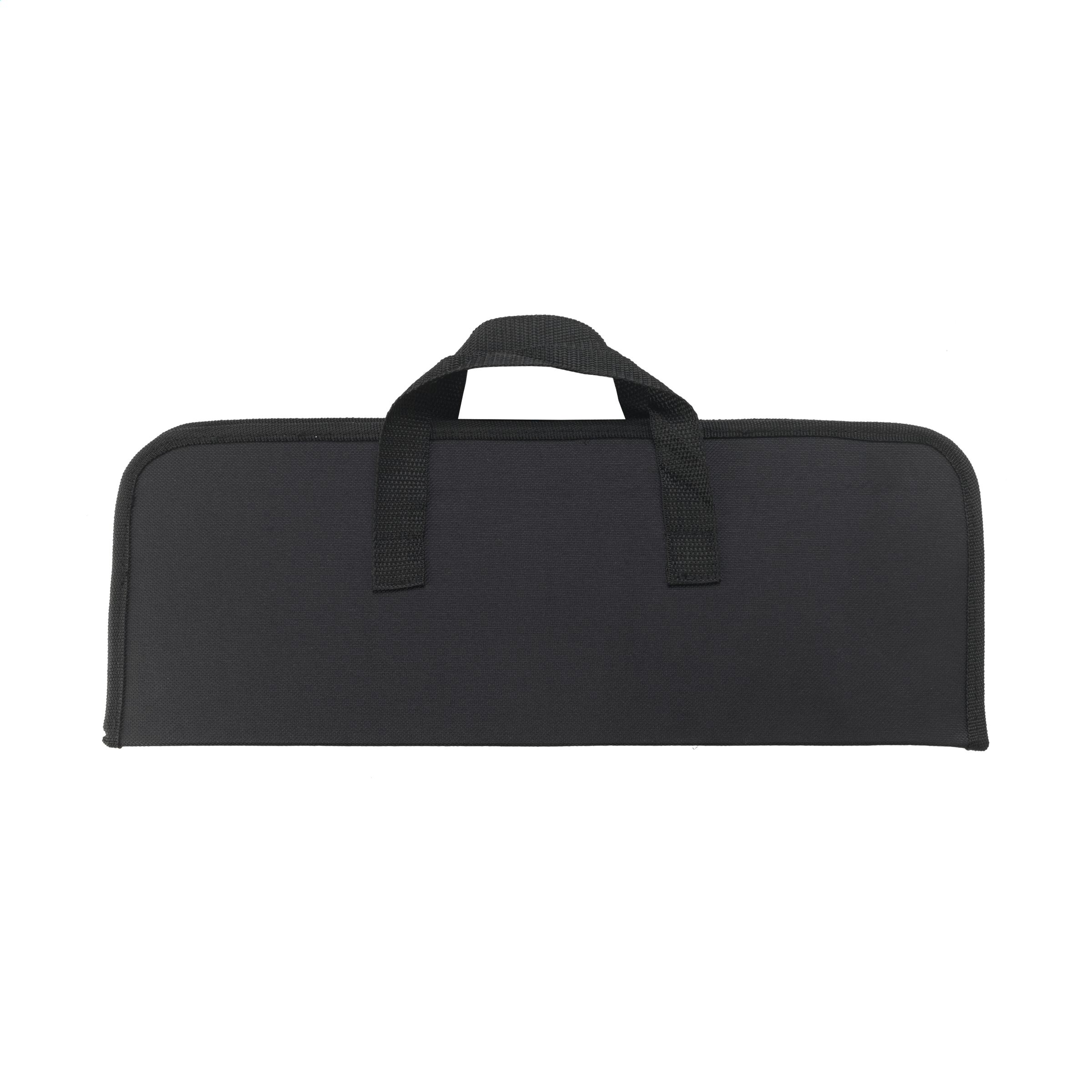 4-teiliges Barbecue-Set: Spatel, Gabel, Messer und Fleischzange. Der Edelstahl hat eine schöne schwarze Beschichtung und die Accessoires haben Griffe aus Akazienholz. Dieses schicke Set wird in einer 600D Nylontasche geliefert.