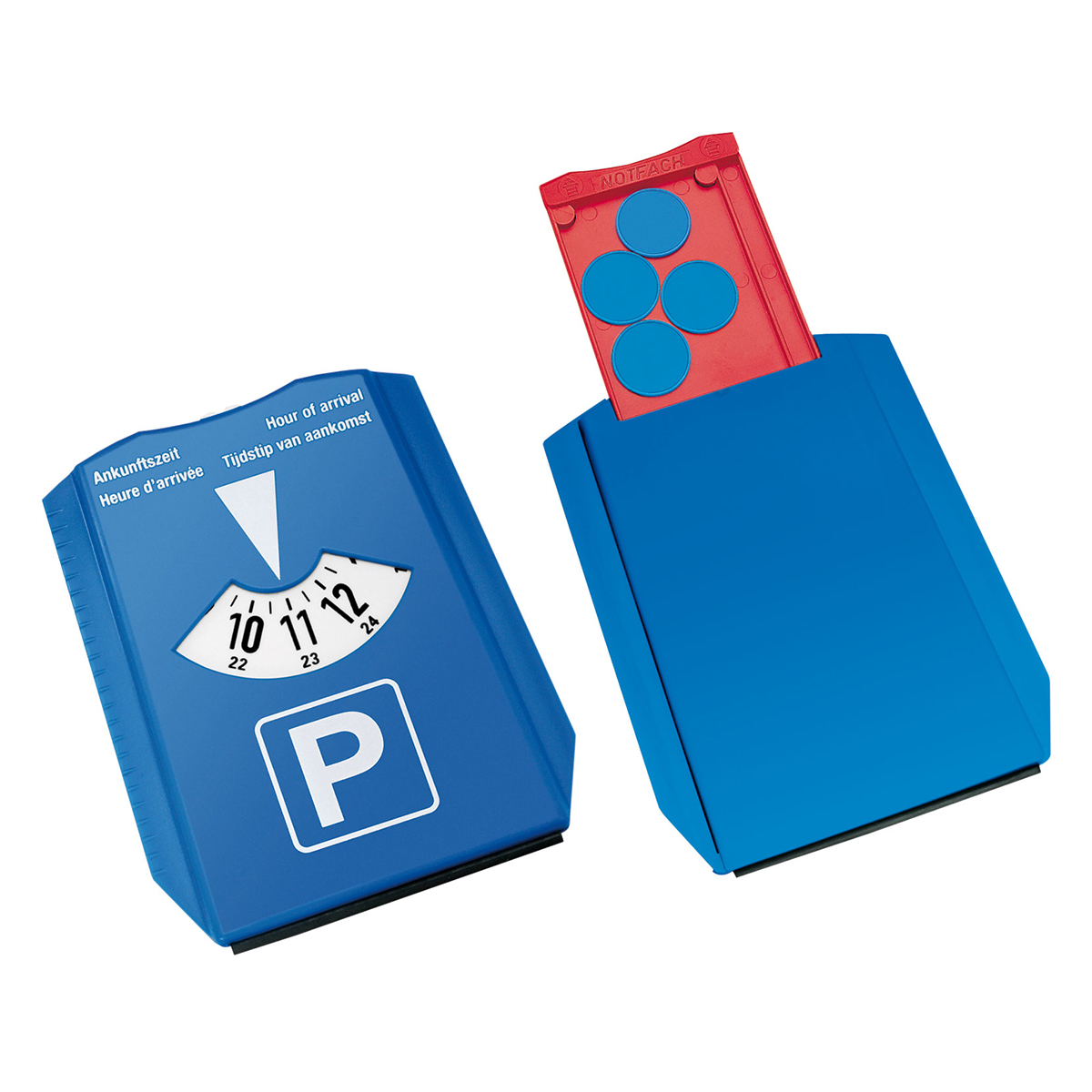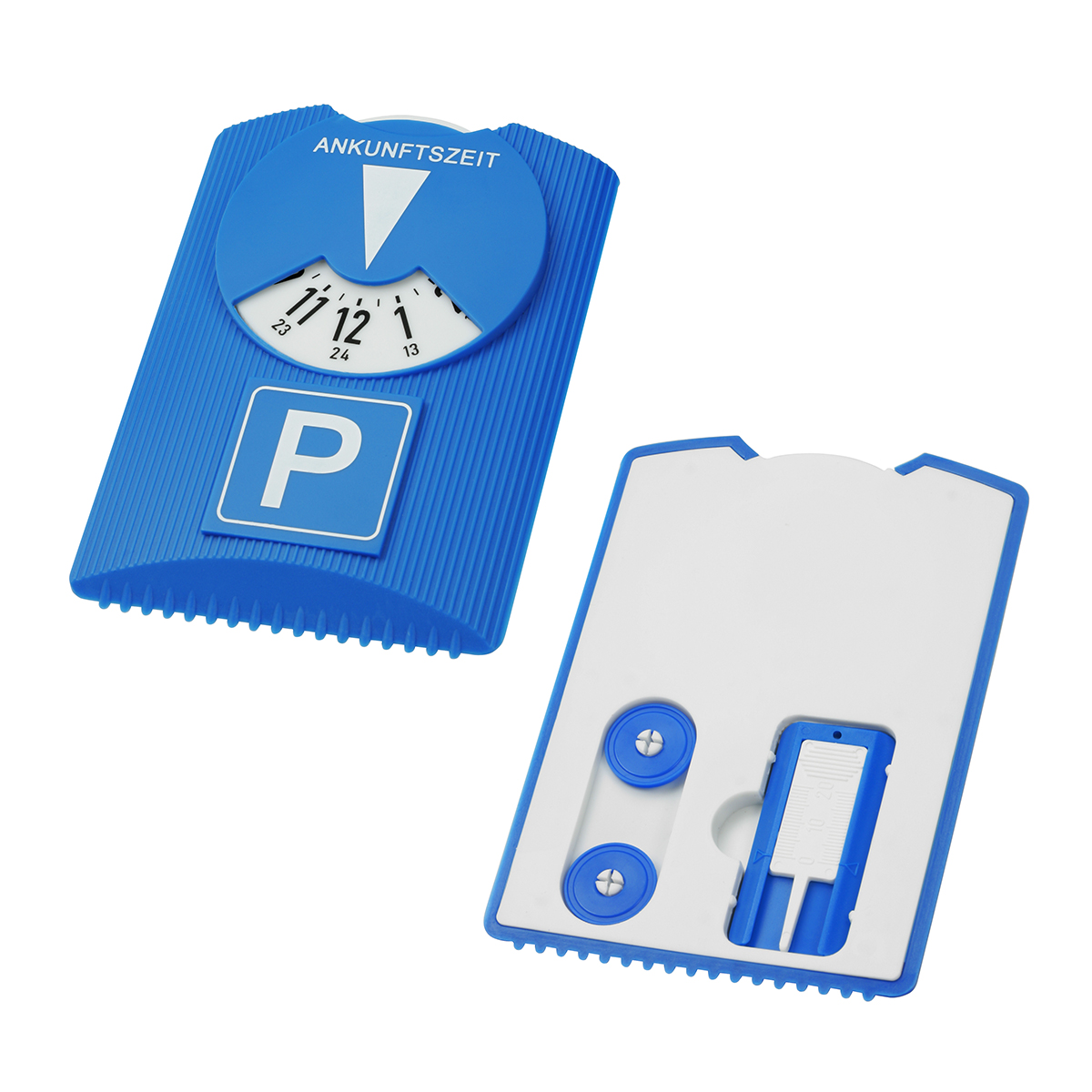 Parkscheibe mit Eiskratzer, Gummiwischer, Einkaufswagen Chip und Reifenprofilmesser. Großer weißer Logobereich auf der Rückseite. „Ankunftszeit“ auf der Vorderseite in den Sprachen Niederländisch, Englisch, Französisch, Deutsch und Italienisch. Vorschriften können sich je nach Ort unterscheiden.