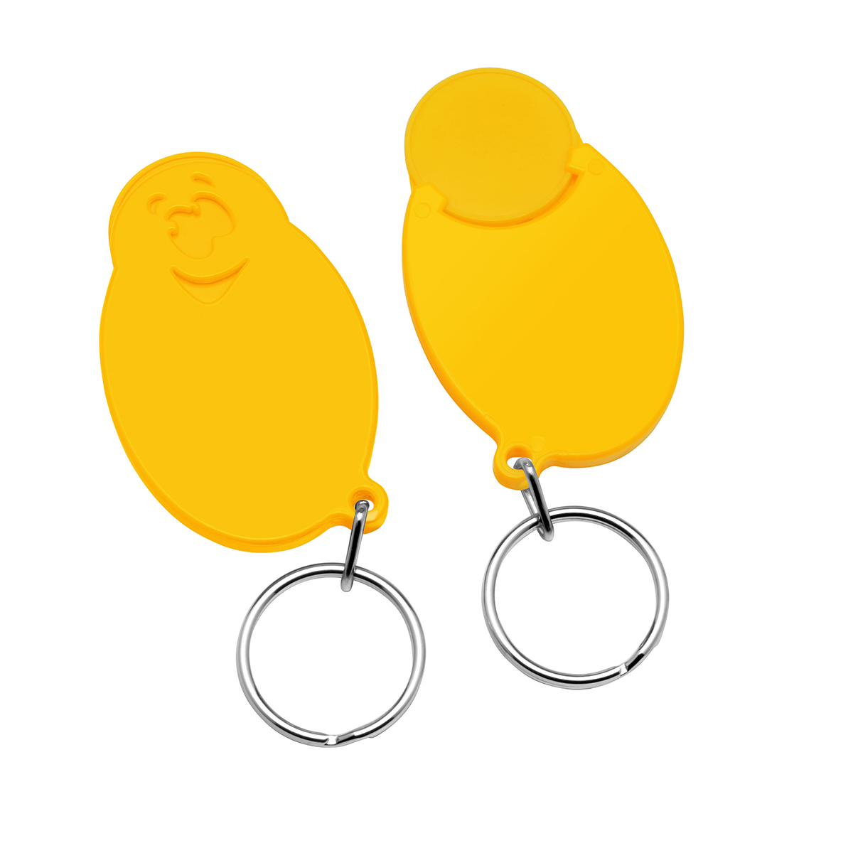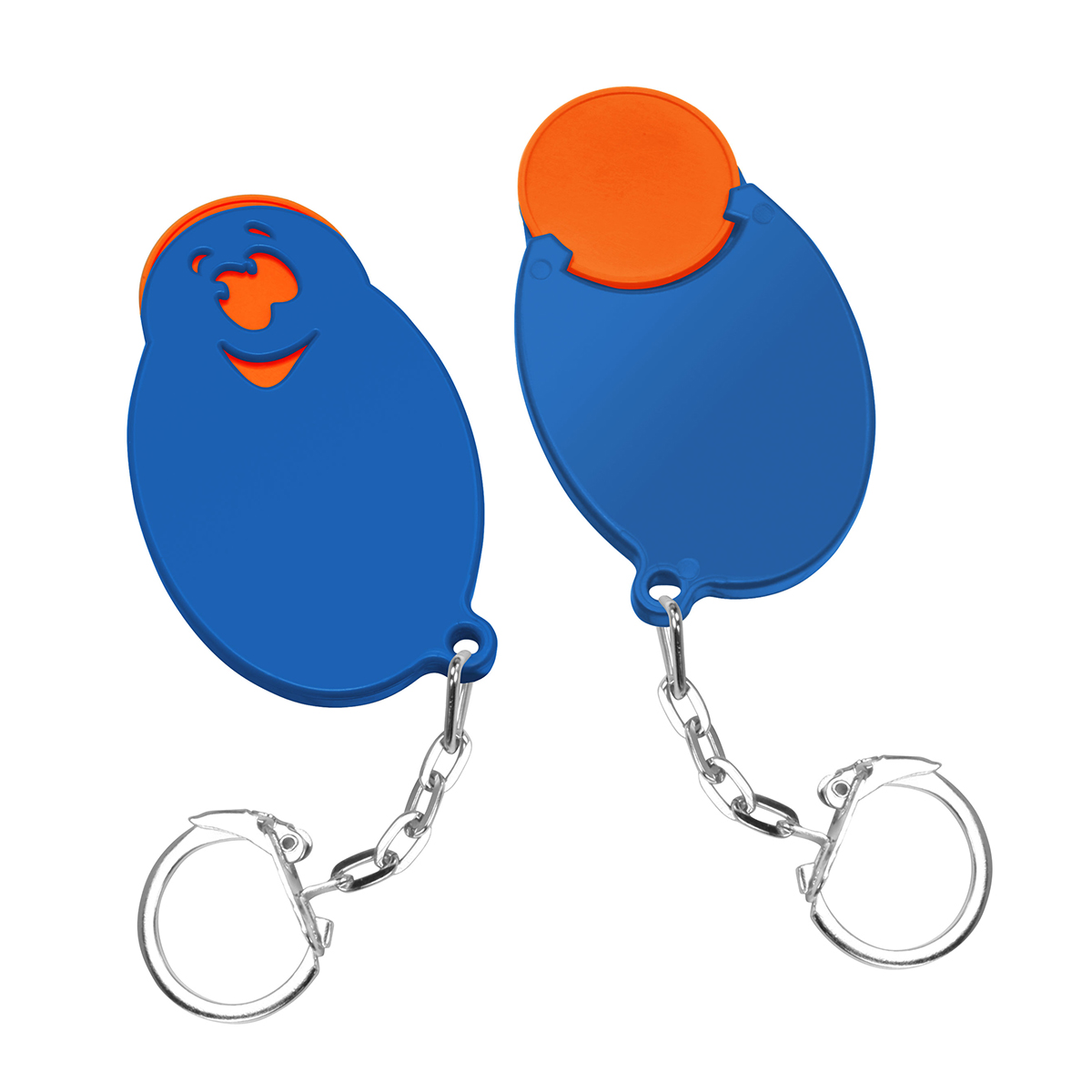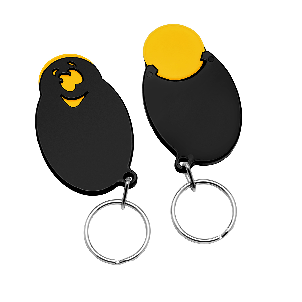Chiphalter mit 1€-Chip "Gesicht", mit Schlüsselring. Farbkombinationen möglich. Druckkosten pro Position.