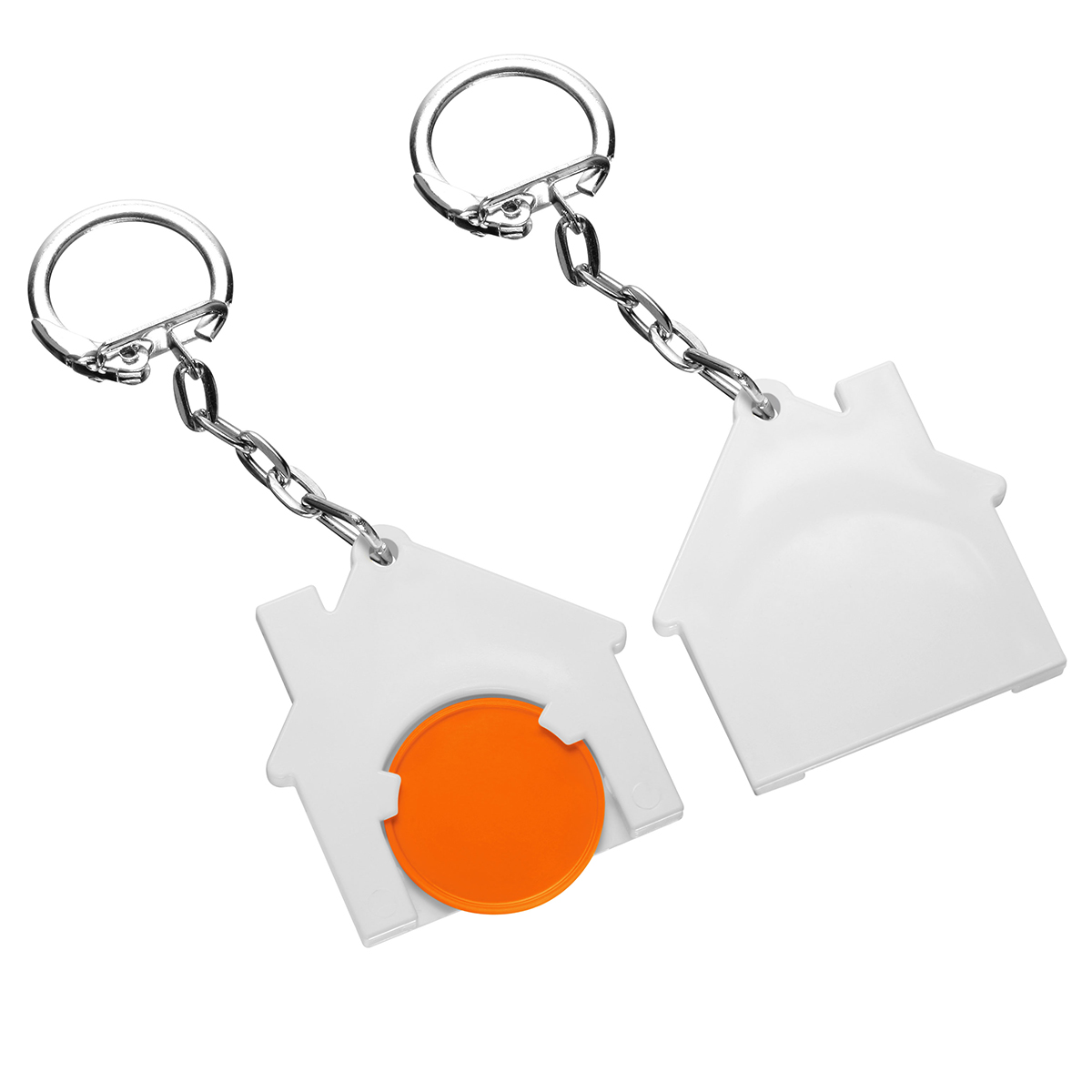 Chiphalter mit 1€-Chip "Haus", mit Schlüsselring. Farbkombinationen möglich. Druckkosten pro Position.