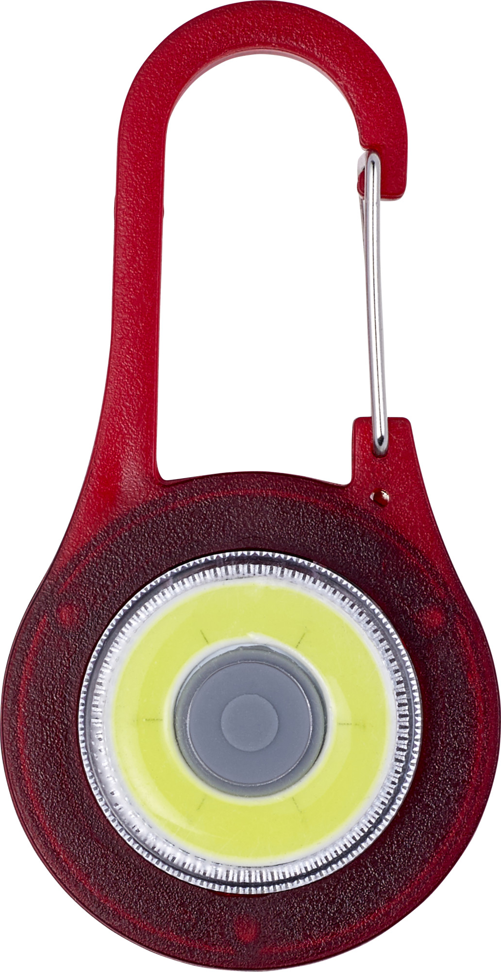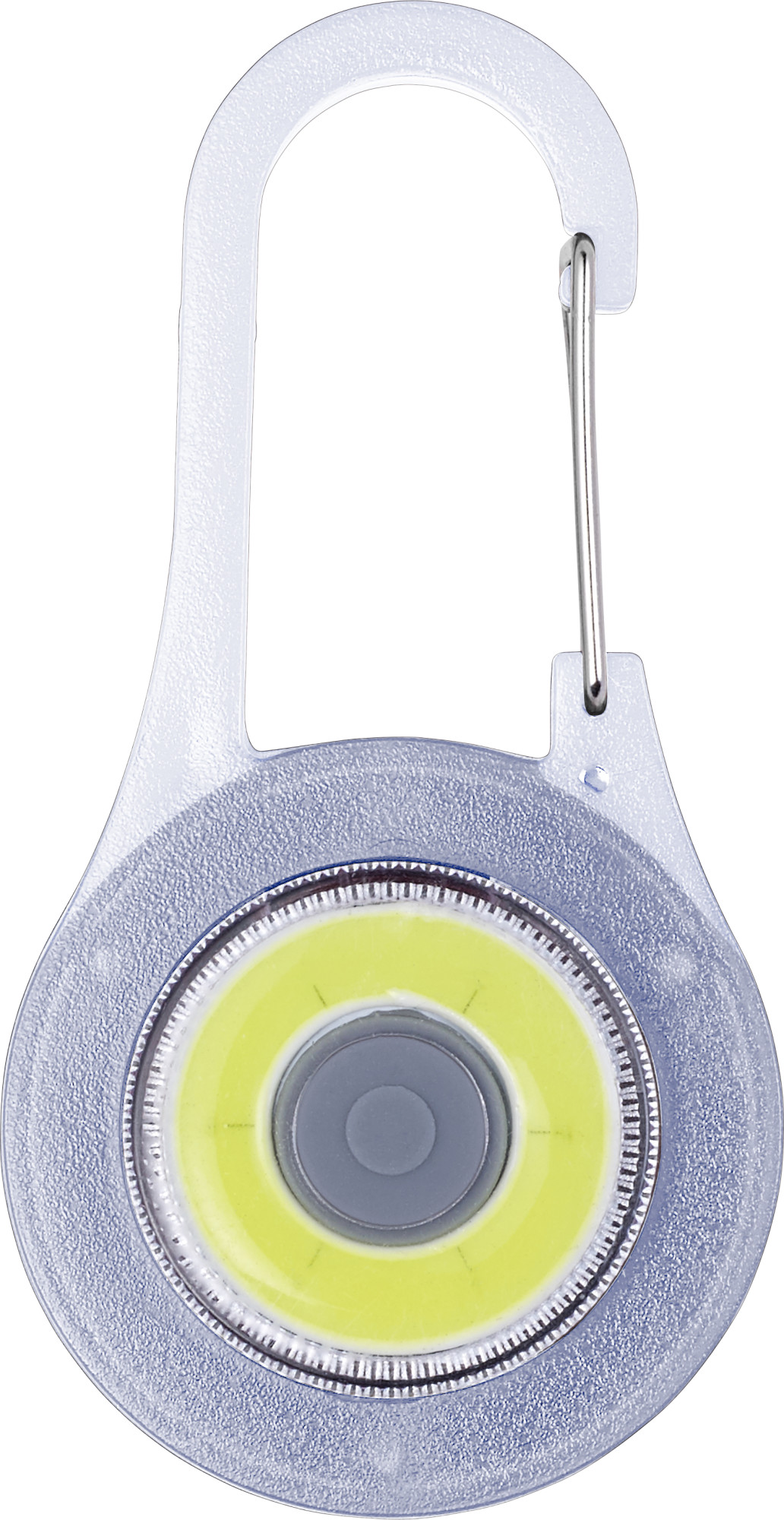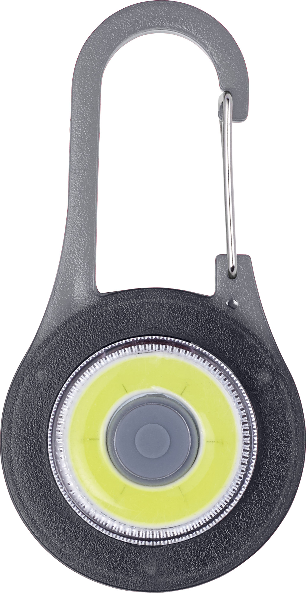 Karabinerhaken aus ABS-Kunststoff mit COB LED Licht. Dank des Druckknopfs kann man zwischen drei Licht-Einstellungen wechseln: hell, heller und blinkend.