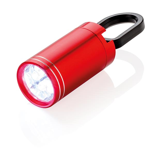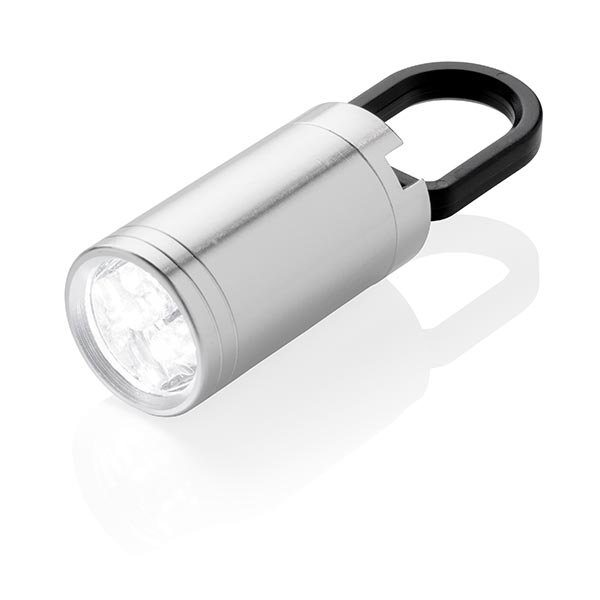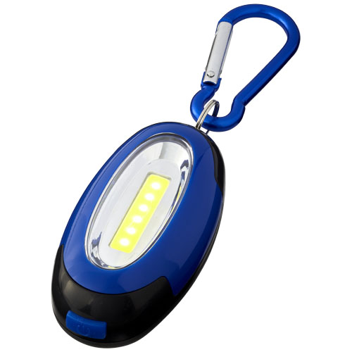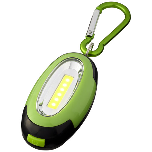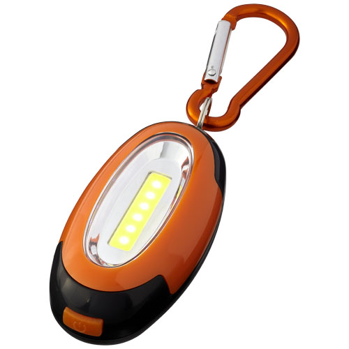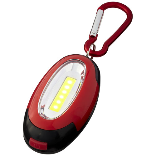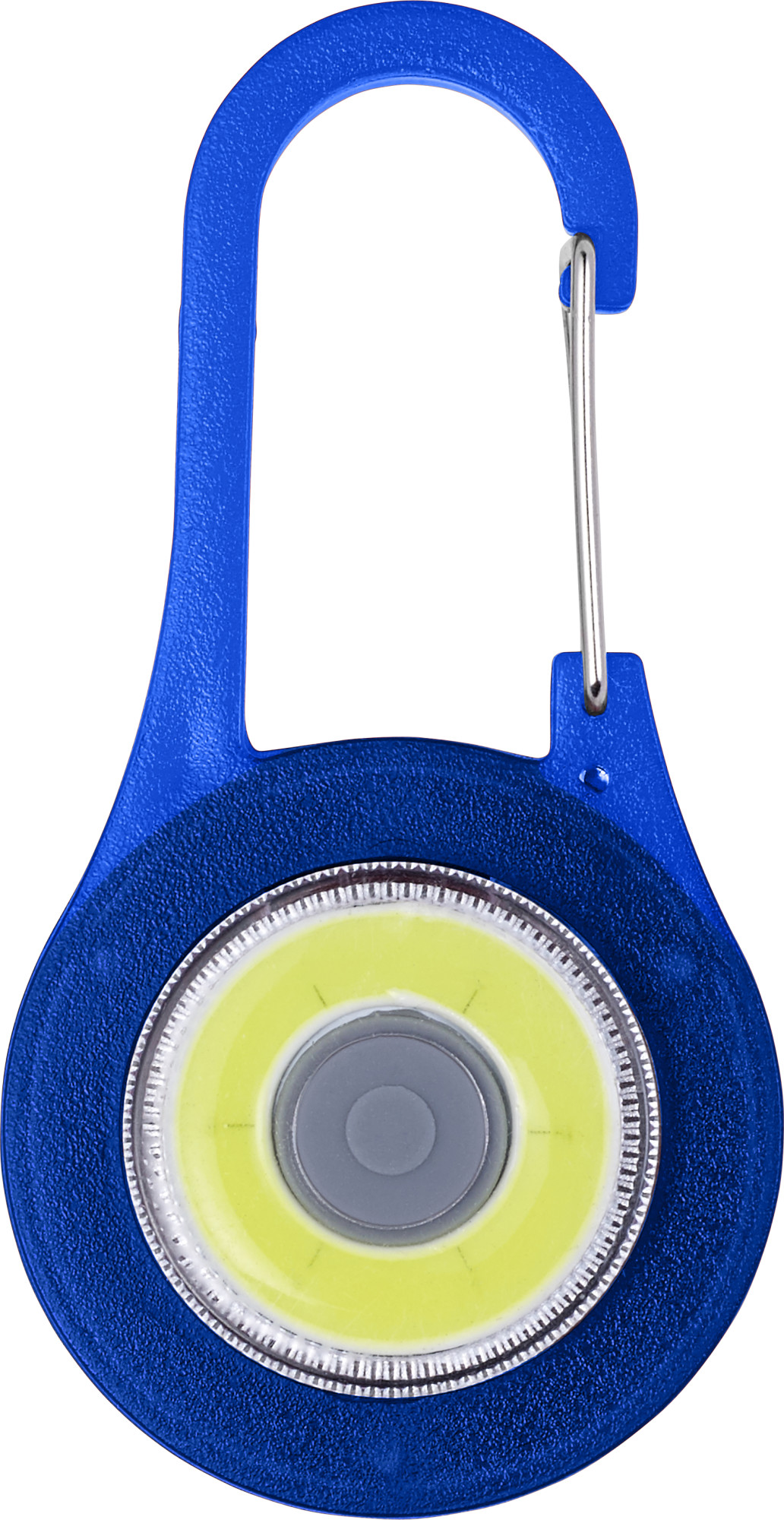 Karabinerhaken aus ABS-Kunststoff mit COB LED Licht. Dank des Druckknopfs kann man zwischen drei Licht-Einstellungen wechseln: hell, heller und blinkend.