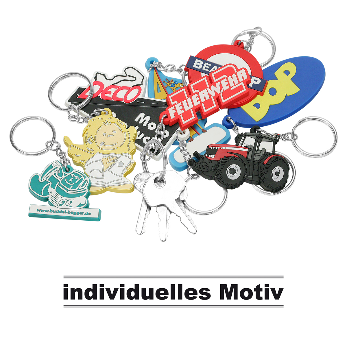 Soft-PVC-Schlüsselanhänger, phthalatfrei nach EU 2005/84/E4, in Form und Farbe individuell gestaltbar, inkl. 1- bis 4-farbigem 2D-Design der Vorderseite, mit Schlüsselring oder Gliederkette. ca. 3,8 bis 4,2 mm stark. Keine Lagerware, auftragsbezogene Fertigung. Andere Größen, Ausführungen und Farben auf Anfrage..