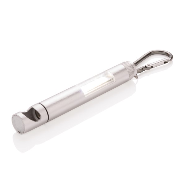 Schlüsselanhänger aus Aluminium, mit Flaschenöffner, Polyesterband, Schlüsselring und fünf kleinen Karabinerhaken in fünf verschiedenen Farben (Blau, Rot, Gold, Grün und Schwarz).