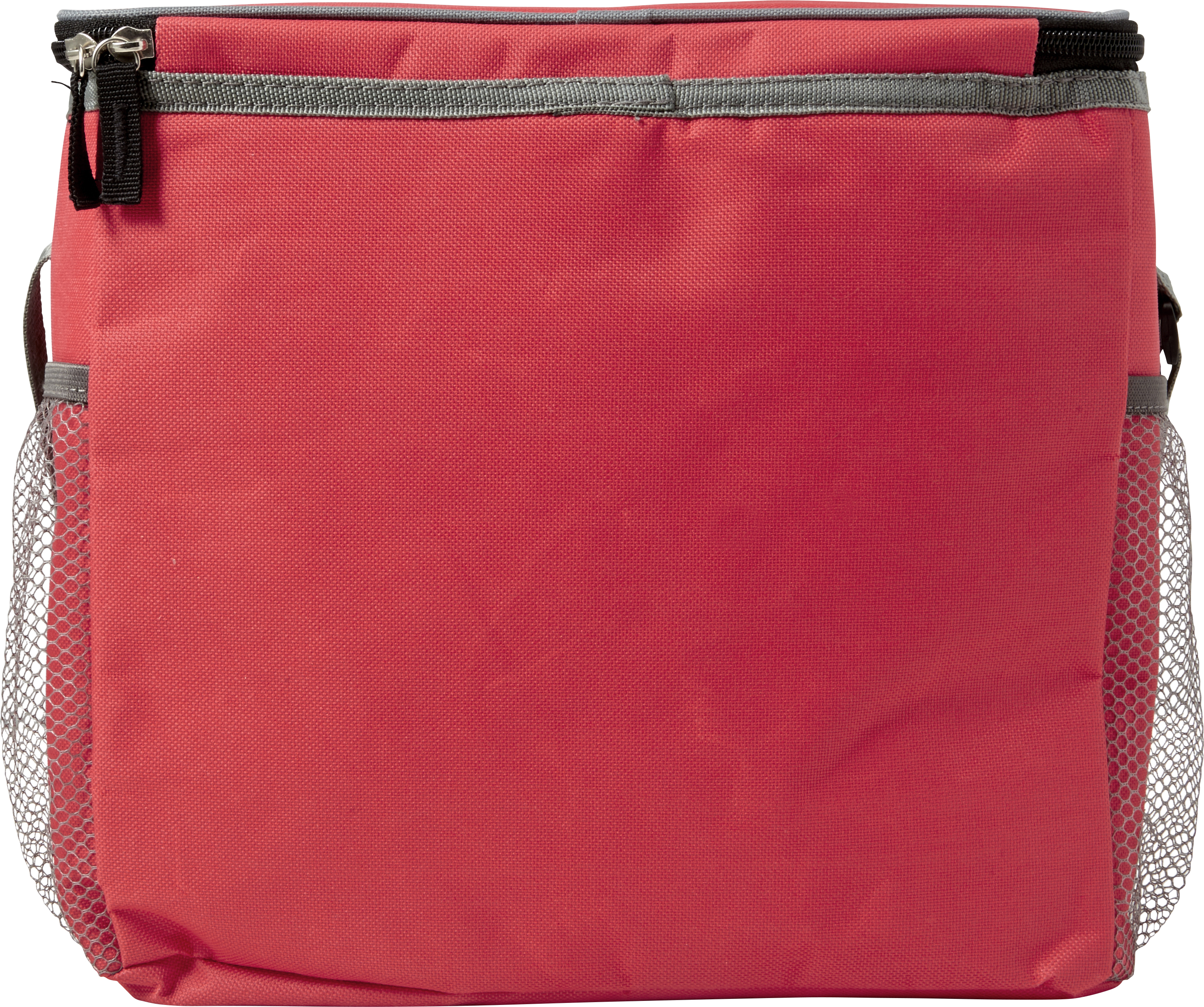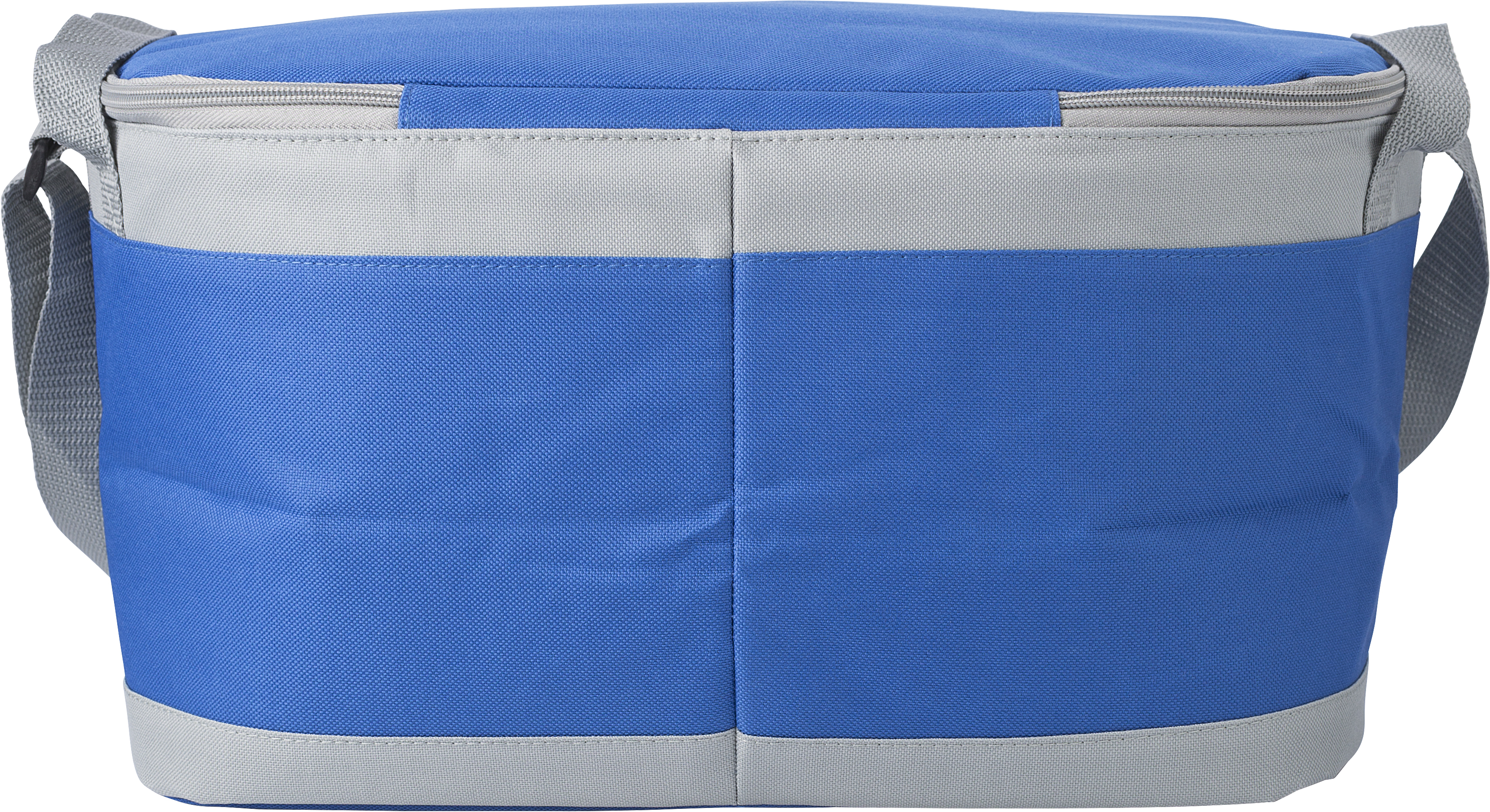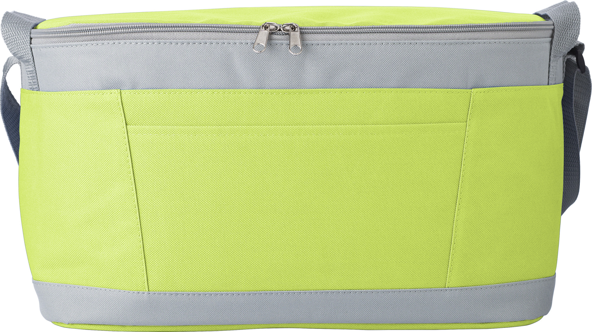 Kühltasche mit isolierender Aluminium-Folie für 6 Dosen. Außenseiten Non Woven mit weißen Absetzungen. 80 g/m². Isoliermaterial: Mit Aluminiumfolie laminierter Schaumstoff. Füllmenge 3L.