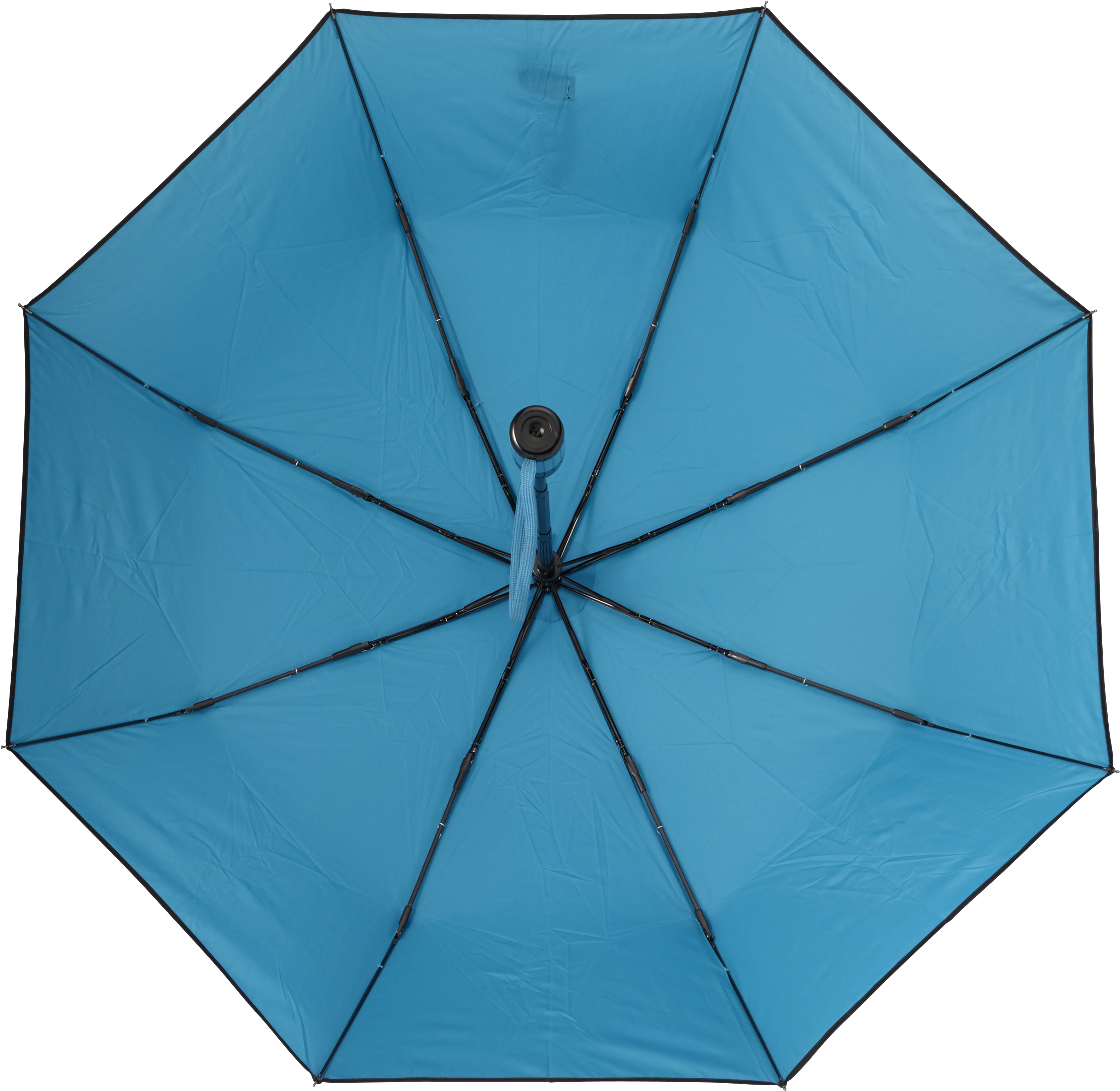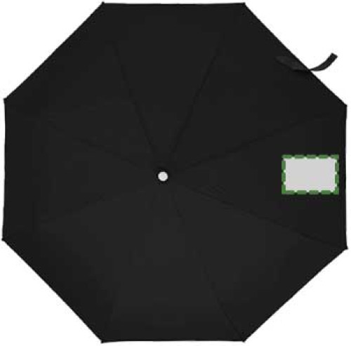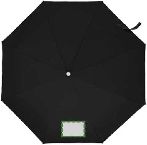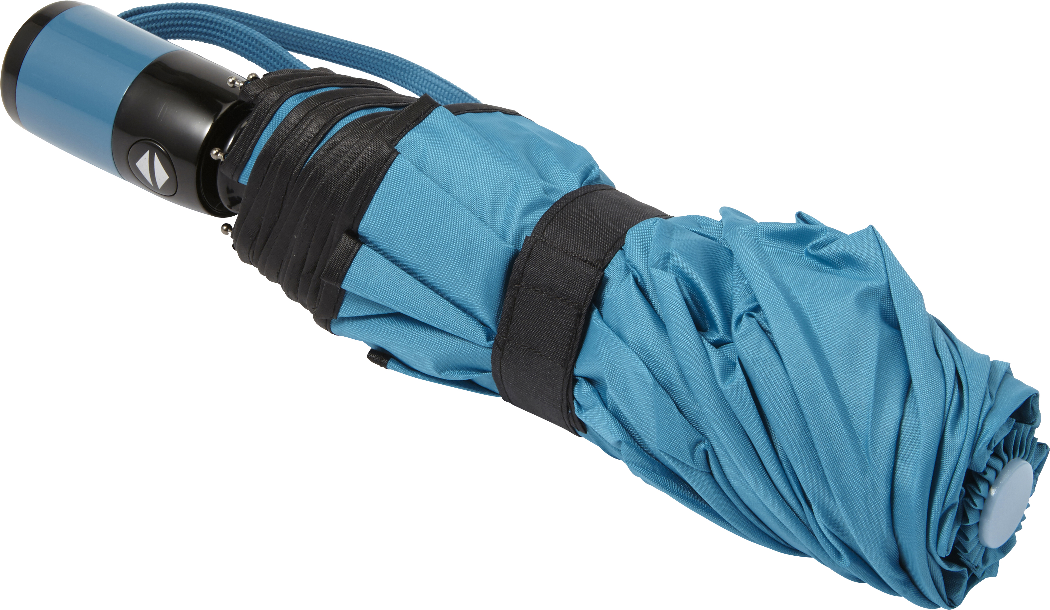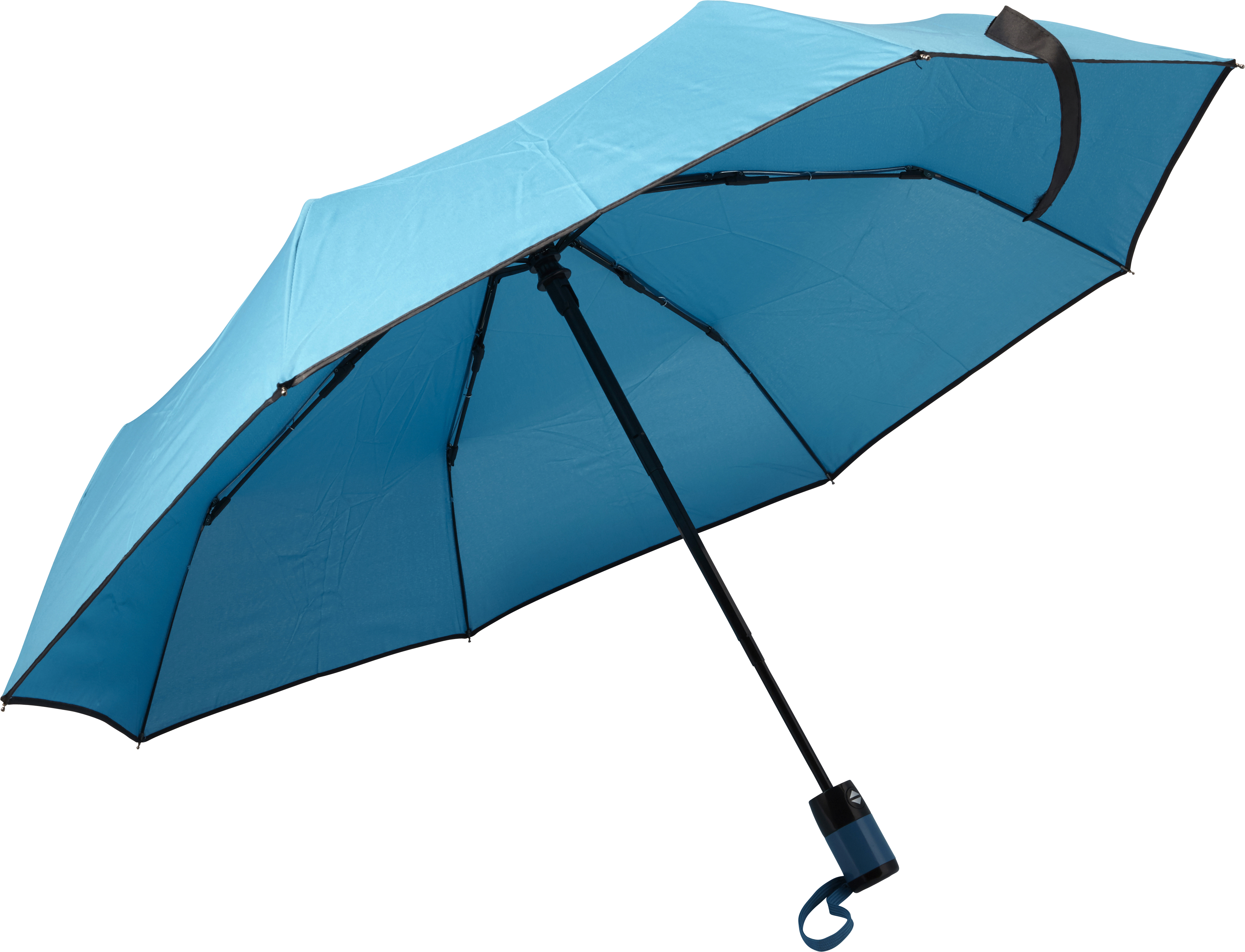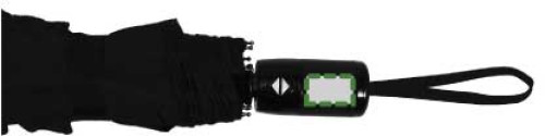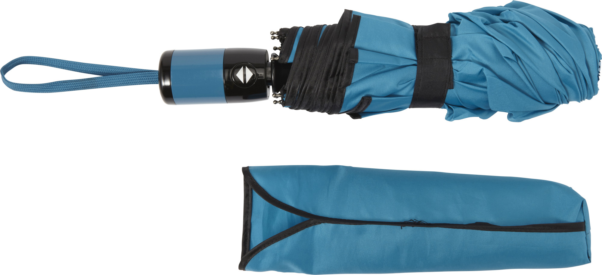 Automatik-Taschenschirm mit Schließfunktion, aus Pongee-Seide, mit Aluminiumschaft und -gestell, Kunststoffgriff, Griffschlaufe und Hülle.