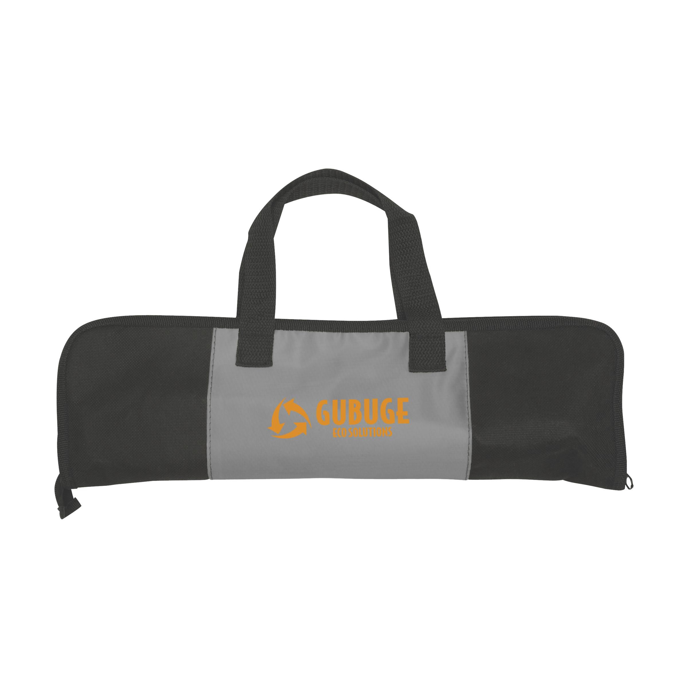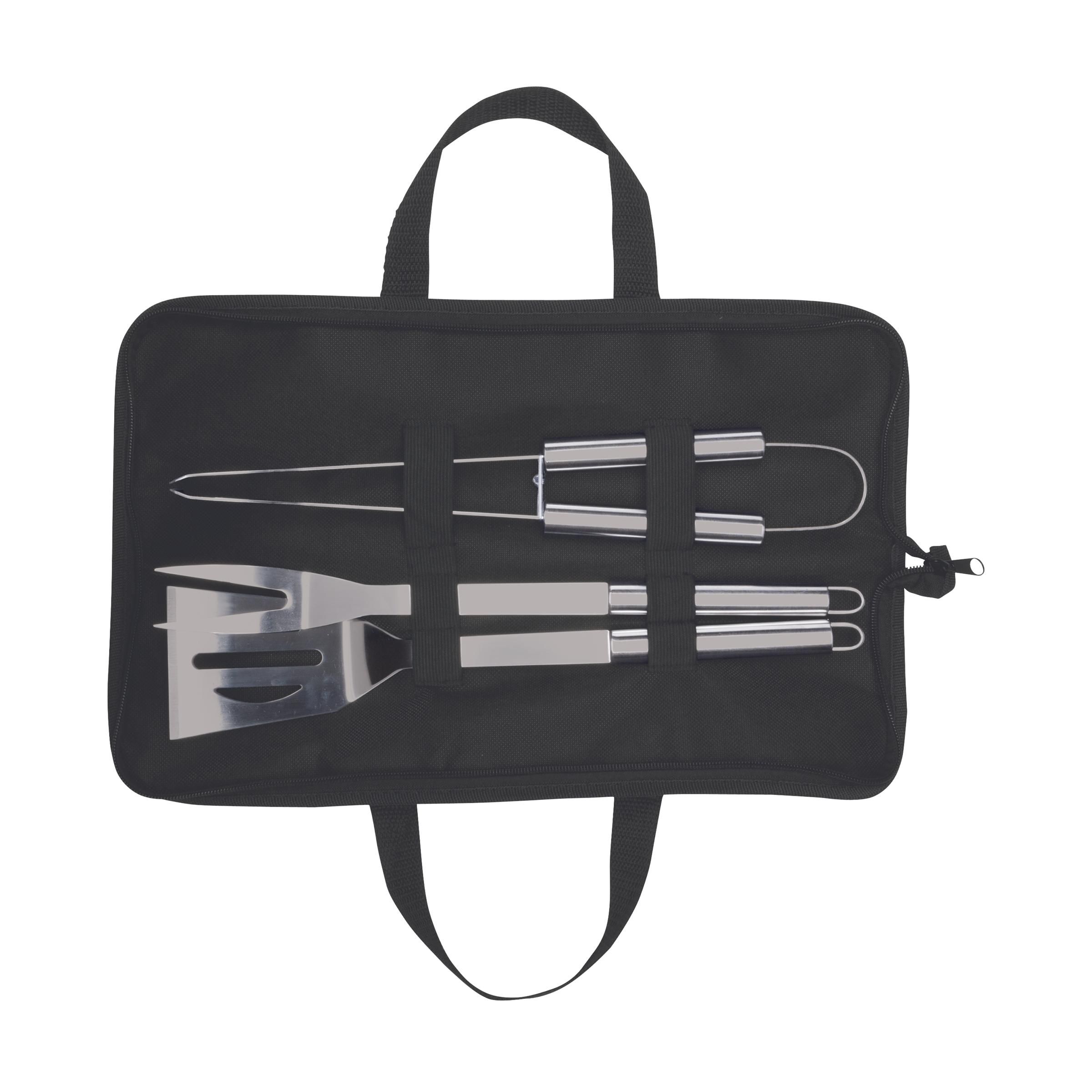 3-teiliges Barbecueset aus Edelstahl: Pfannenwender, Gabel und Fleischzange. In einem nonwoven Etui mit extra Einsteckfach aus Nylon auf der Vorderseite.