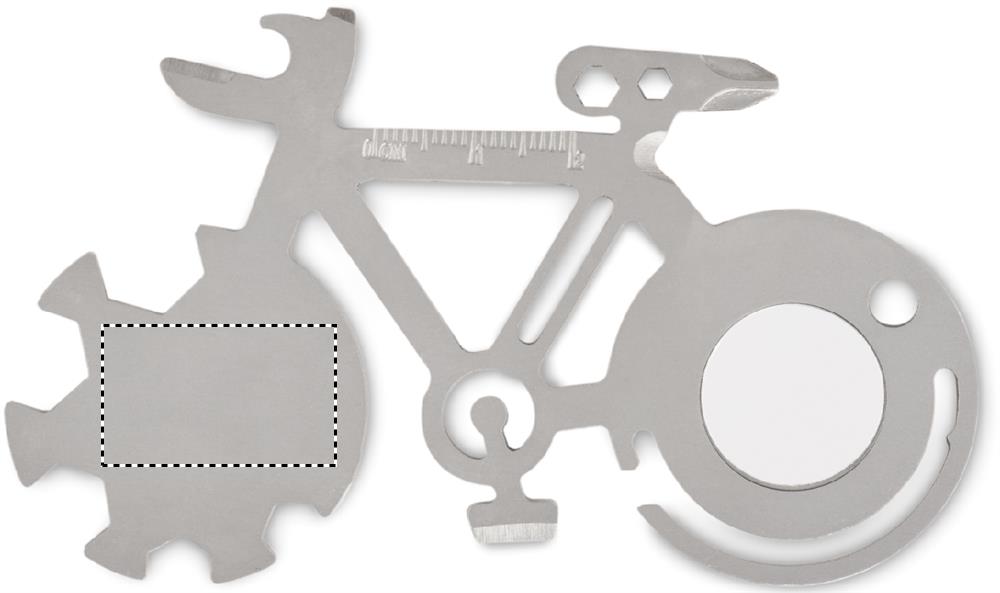 Multifunktionswerkzeug aus Edelstahl mit 11 Funktionen in Optik eines Fahrrades. Bietet u.a. folgende Funktionen: Kapselheber, Messer, Lineal und Kreuzschlitzschraubendreher.