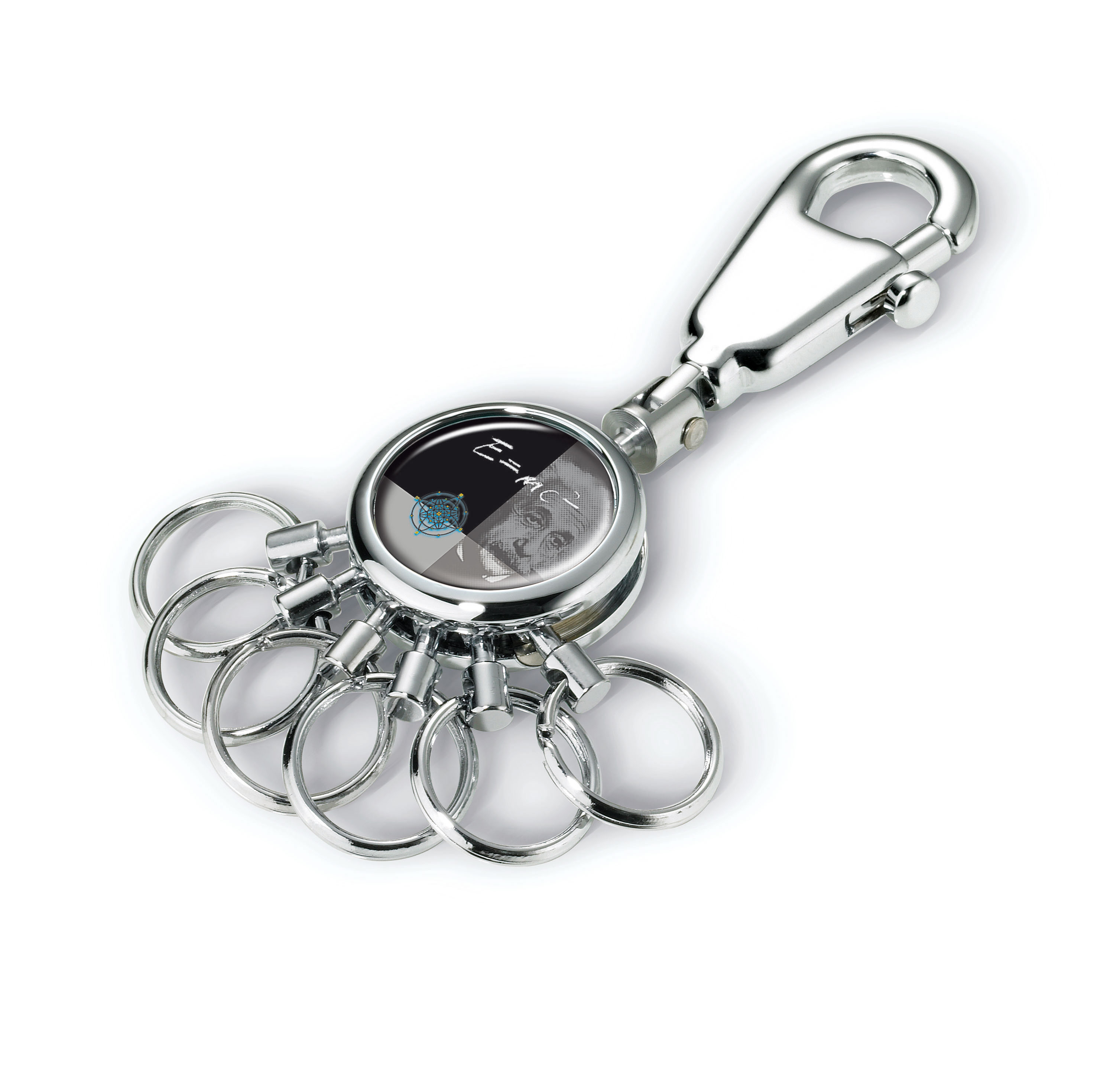 Schlüsselanhänger mit Karabinerhaken, Motiv: RELATIV, 6 auswechselbare Ringe, Metall, verchromt, glänzend, mehrfarbig Hängt euch rein, Schlüssel! Mit einer Hand und Fingernagel-sicher wird der Federverschluss geöffnet, schon kann man Schlüssel ein- und aushängen. PATENT ist einfach, sicher und schnell. Alles ist relativ. Außer diesem Dekor... RELATIV mit Einstein's genialer Formel.