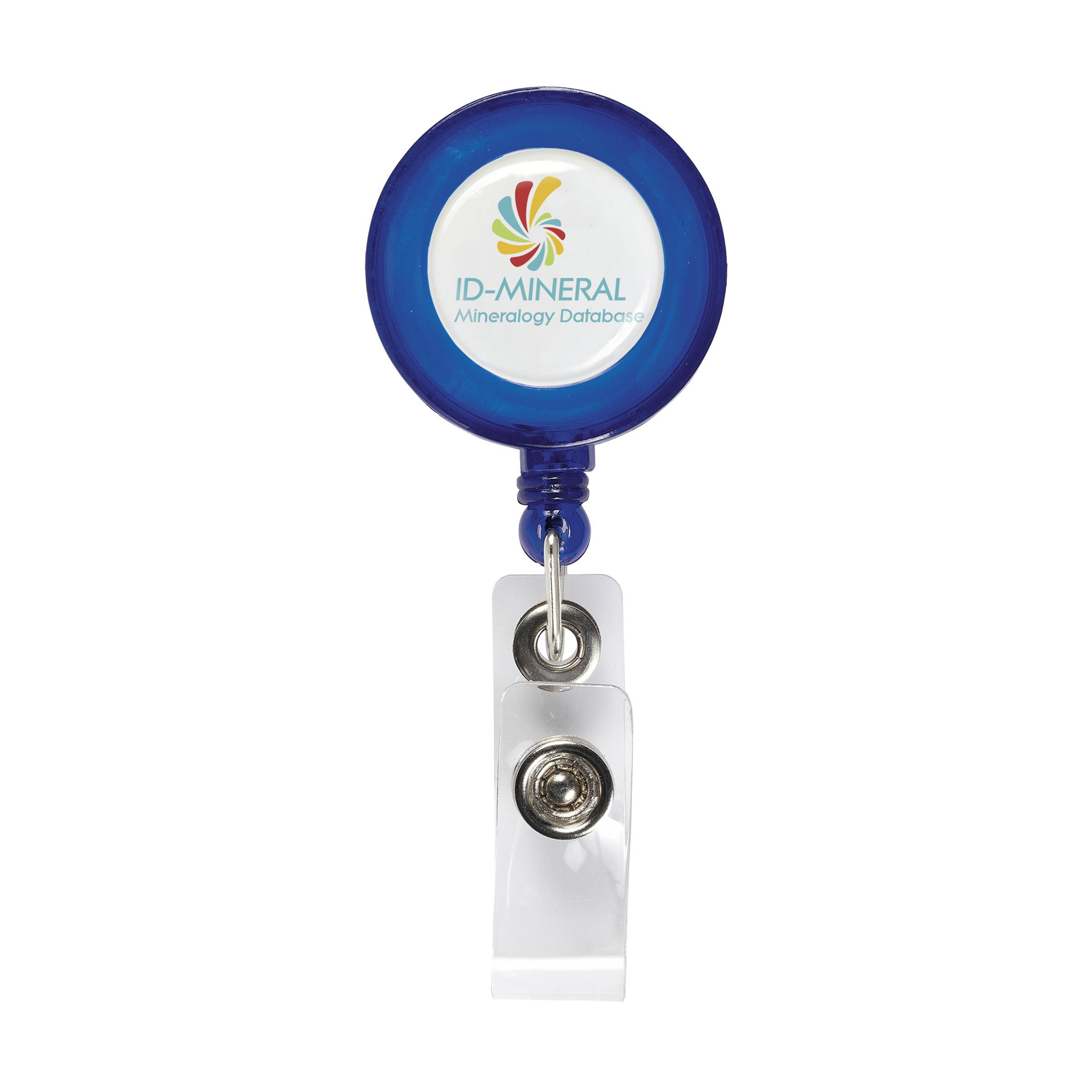 Badgehalter mit metallenem Befestigungsclip, aufrollbarem Nylonband und Badgeclip mit Druckknopf.