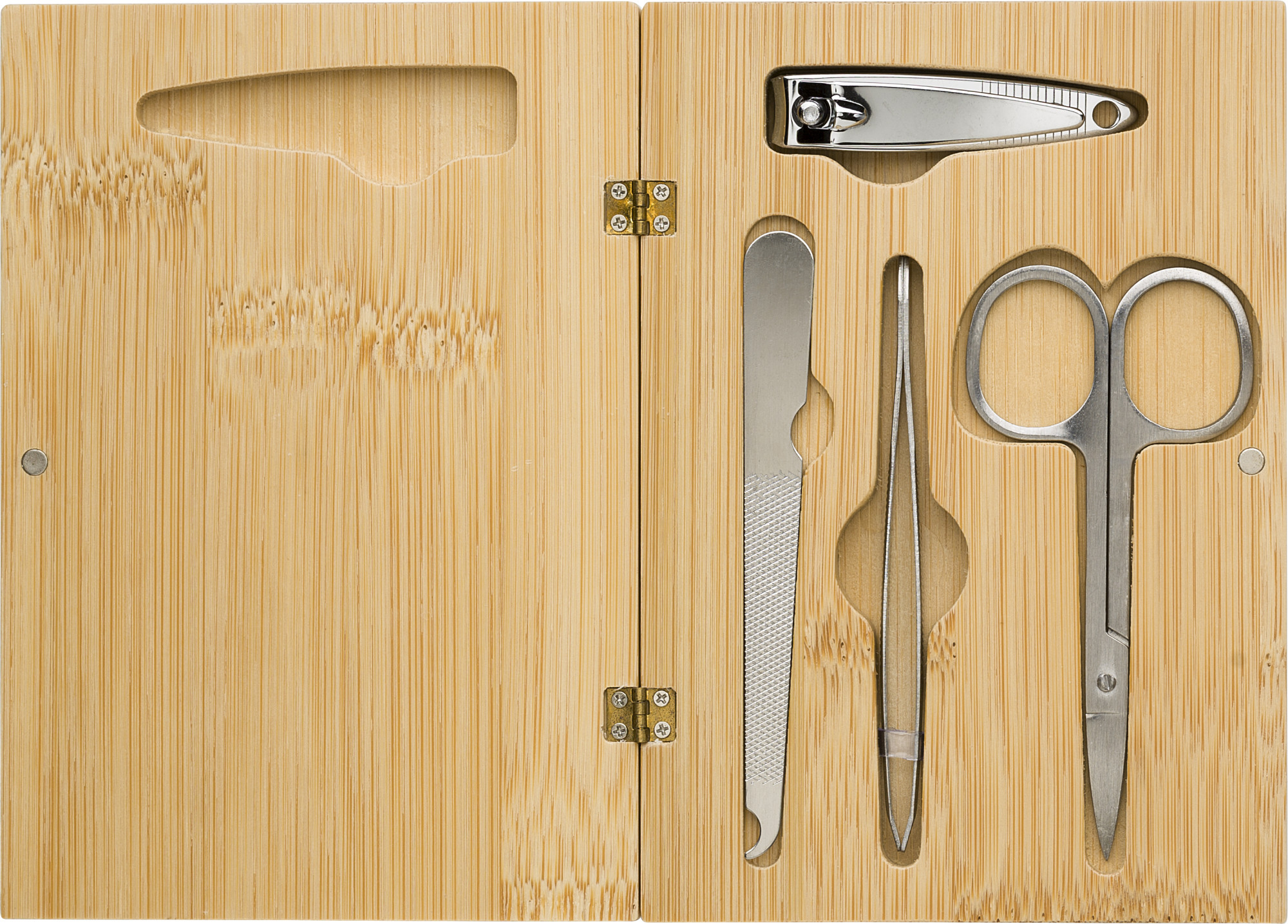 Bambus-Maniküreset mit 4 Teilen (Nagelknipser, Pinzette und Feile). Einzeln verpackt in einer braunen Kartonbox.