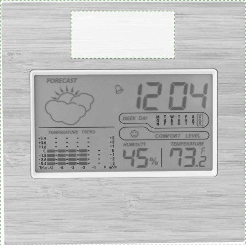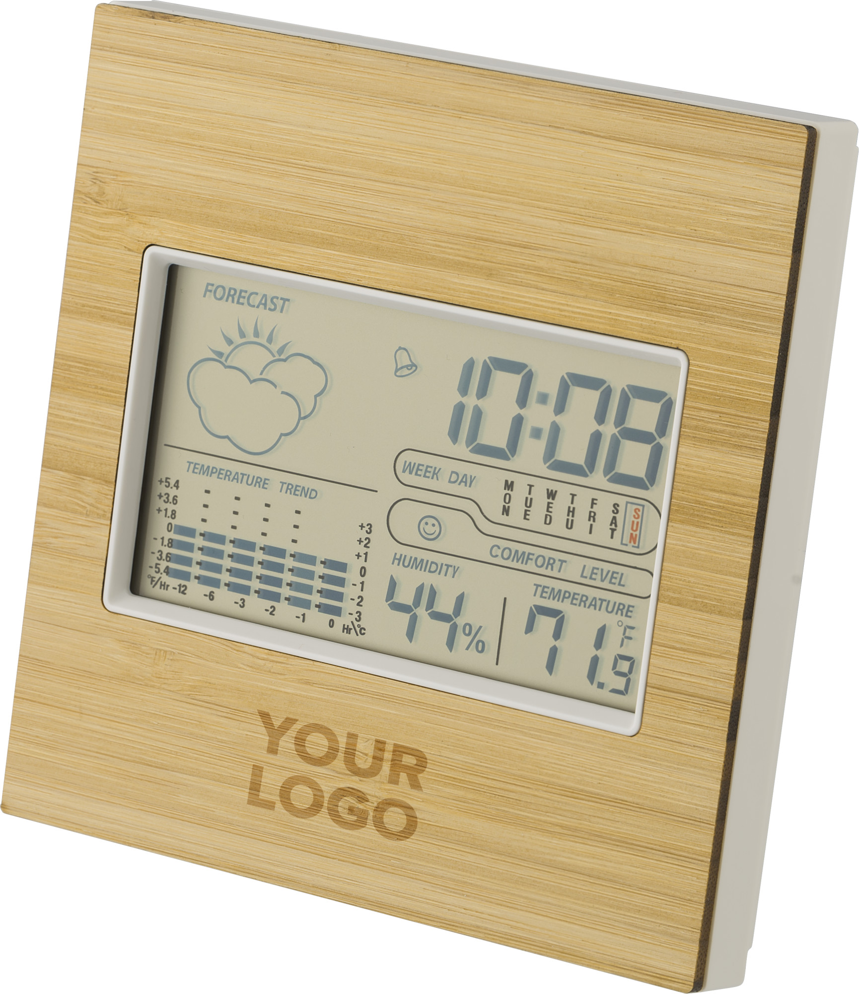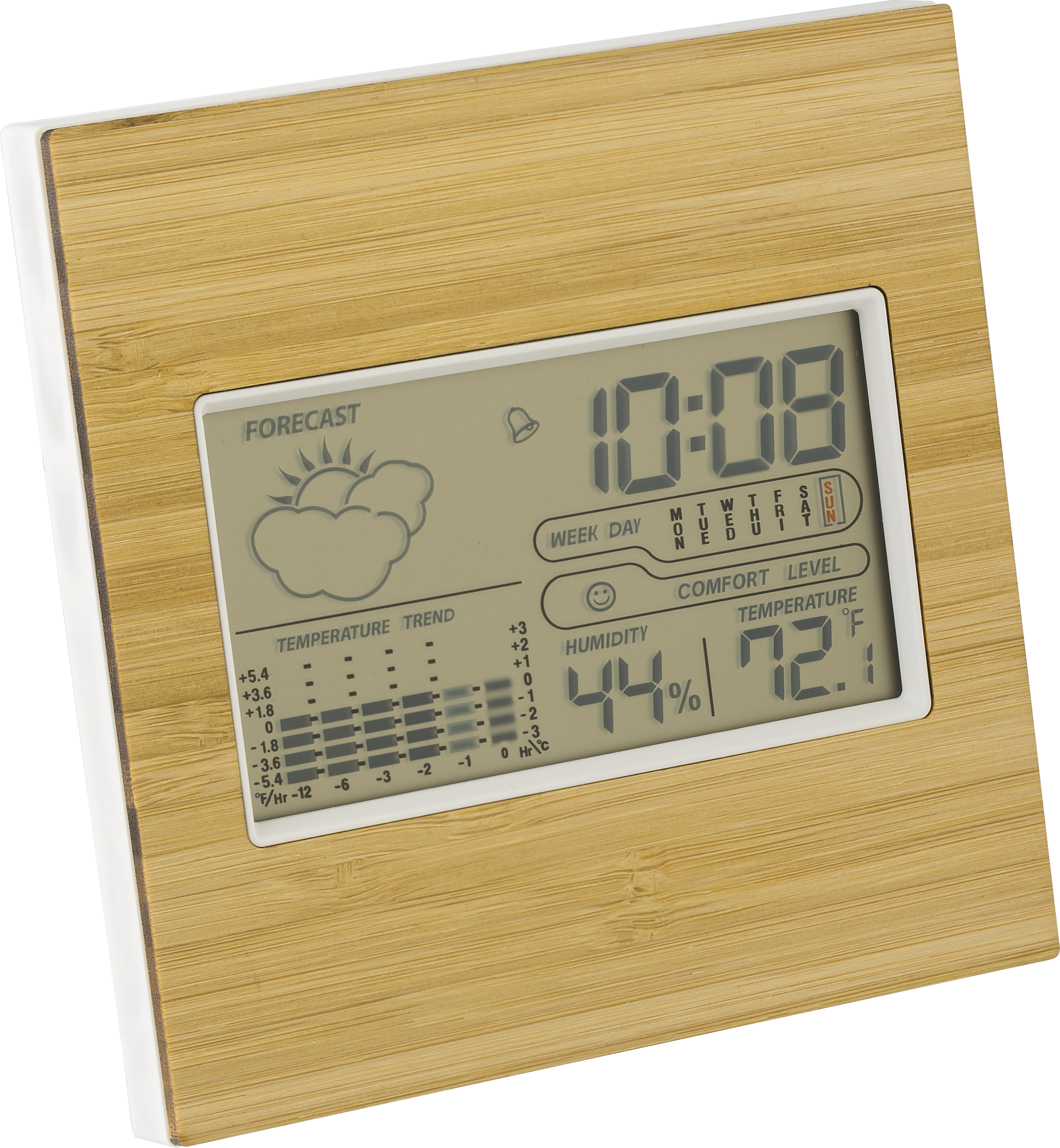 Wetterstation aus Bambus, ABS und Glas mit einstellbarem Ständer. Funktionen: Uhrzeit, Kalender, Wochenübersicht, Alarm und Schlummerfunktion, Temperatur, Luftfeuchtigkeit und Wetterinformationen. Inklusive Batterien.