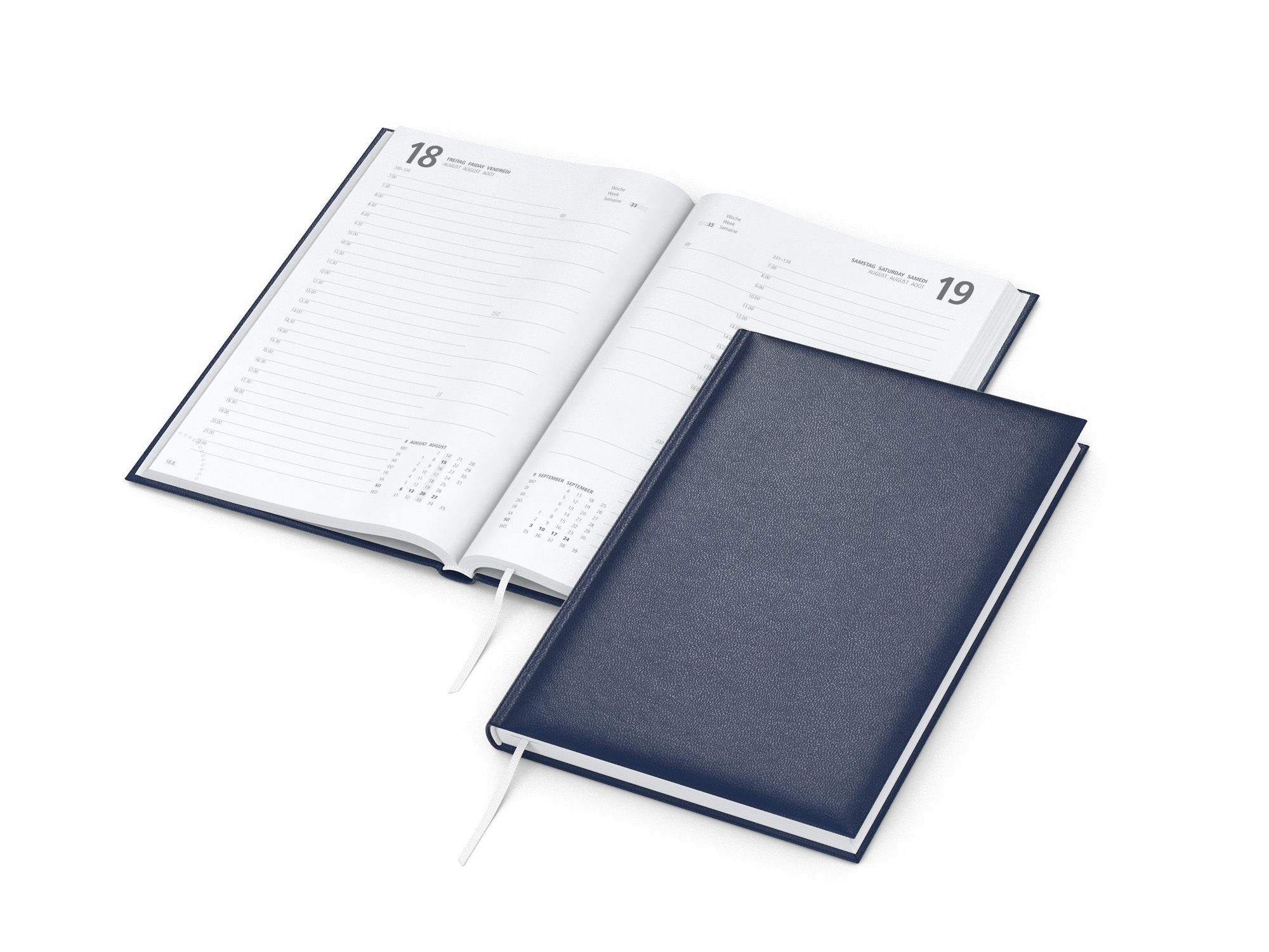 Format: 148 x 210 mm gesamt (DIN A5); 142 x 205 mm Kalenderblock; Kalendarium: Deutsch 3sprachig D/GB/F; je Tag eine Seite; Samstag und Sonntag zusammengefasst; Halbstunden-Einteilung von 7 bis 22 Uhr; Informationsteil; Umfang: 320 Seiten; Verarbeitung: Hardcover mit wattierter Buchdecke ; Eckenperforation ; Lesezeichen ; Kapitalband ; runder Rücken; Einband: Balacron dunkelblau, schwarz; Druck: Silberprägung inklusive; Verpackung: Wellpapp-Verpackung weiß:; Nr. 23 — 285 x 200 mm; Werbefläche: 100 x 50 mm;