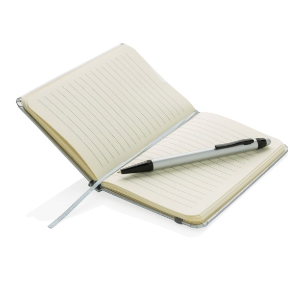Liniertes Hardcover Notizbuch A6 mit Seitentrenner und elastischem Verschlussband, inkl. Stylus-Stift aus Aluminium. 160 Seiten, 70g/m² - creme-farbene Seiten. In Geschenkverpackung