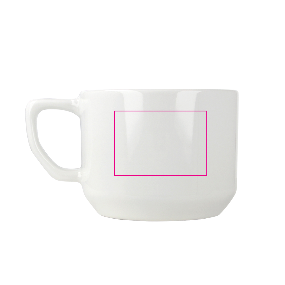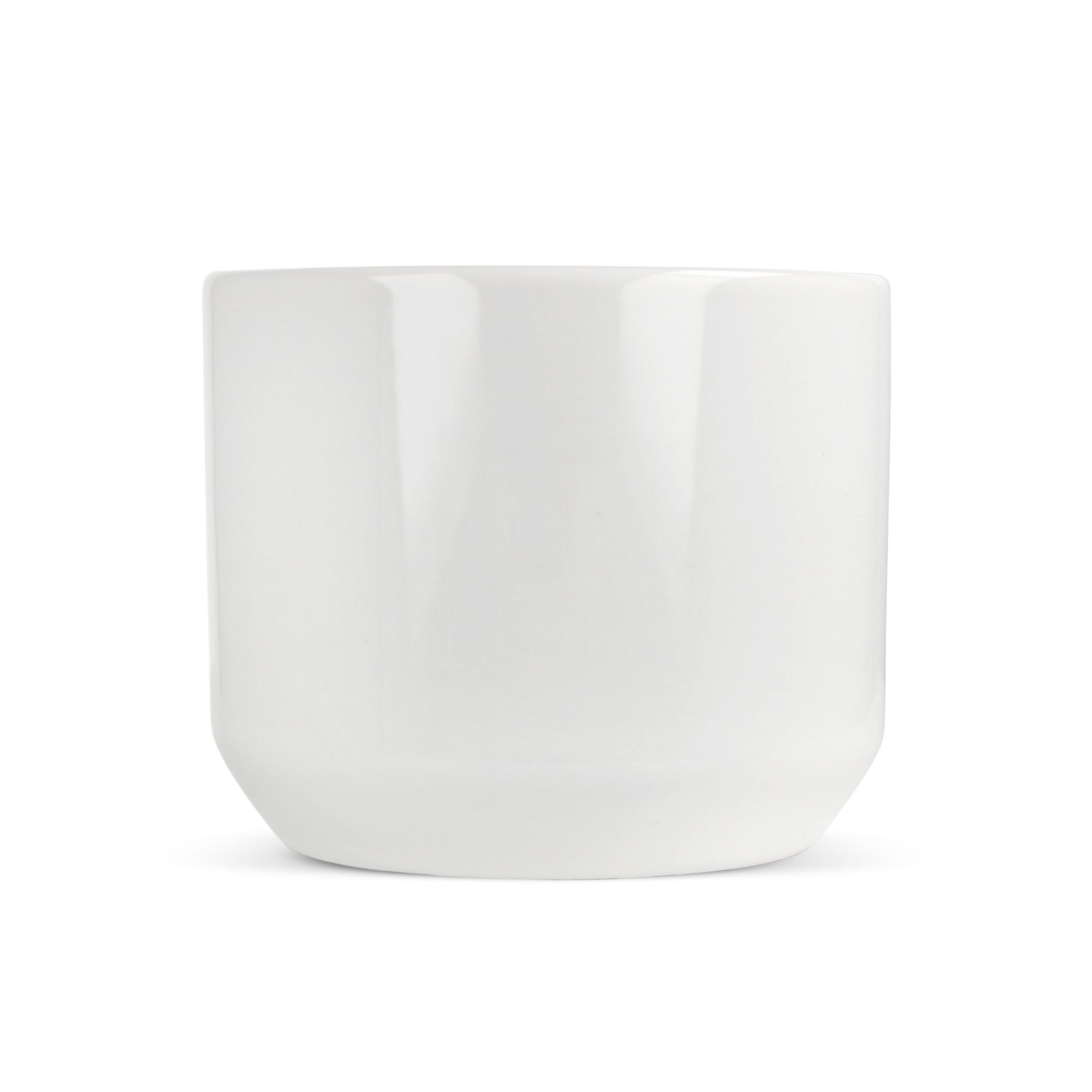 Weißer Becher aus Porzellan. Schlichter Stil mit kompaktem Henkel.