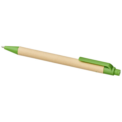 Umweltfreundlicher Kugelschreiber mit Klickmechanismus, einem Schaft aus biologisch abbaubarem Papiermaterial und Verzierungen aus Mais-Kunststoff in verschiedenen Farben. Die Farbe des Recyclingkartons kann variieren.