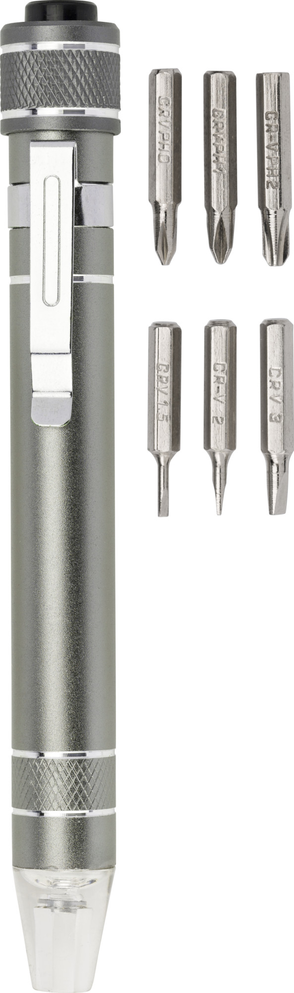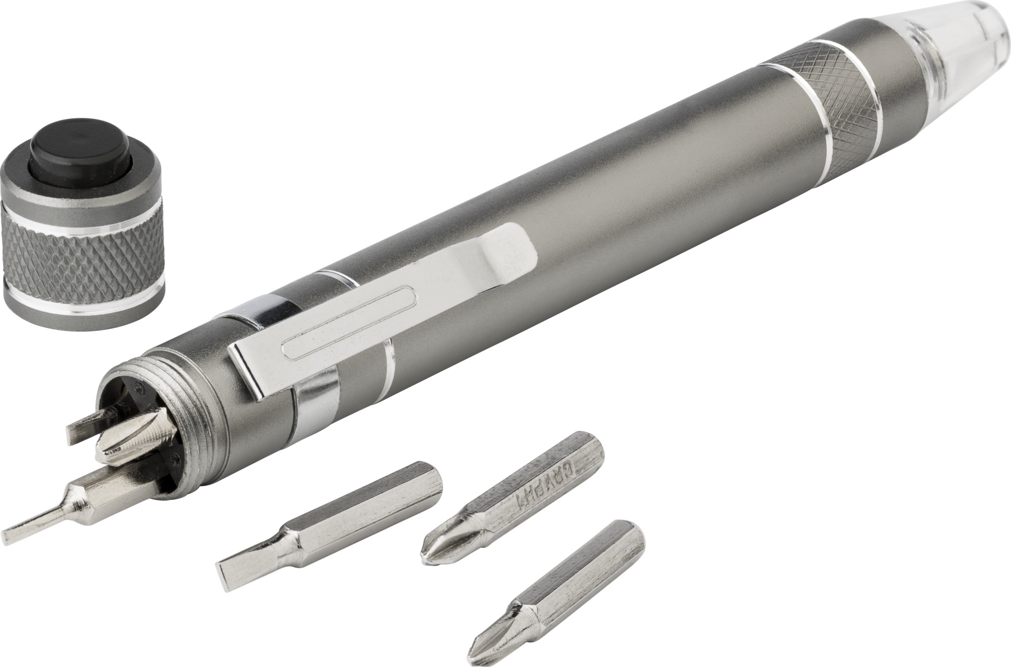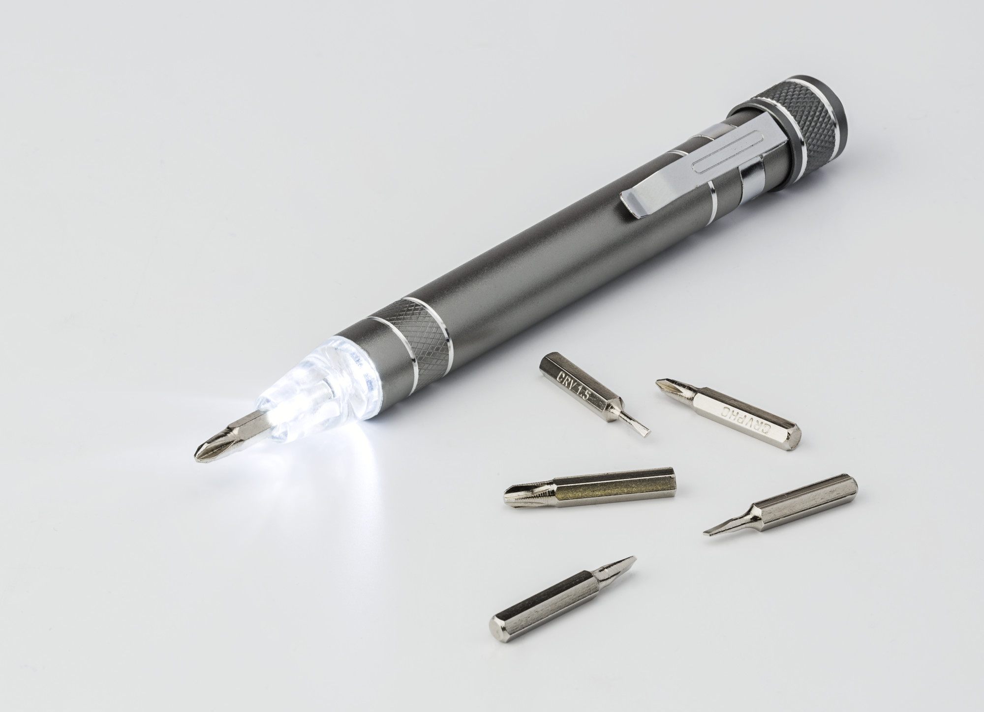 Bit-Set aus Aluminium mit 6 Biteinsätzen und LED-Lampe.
