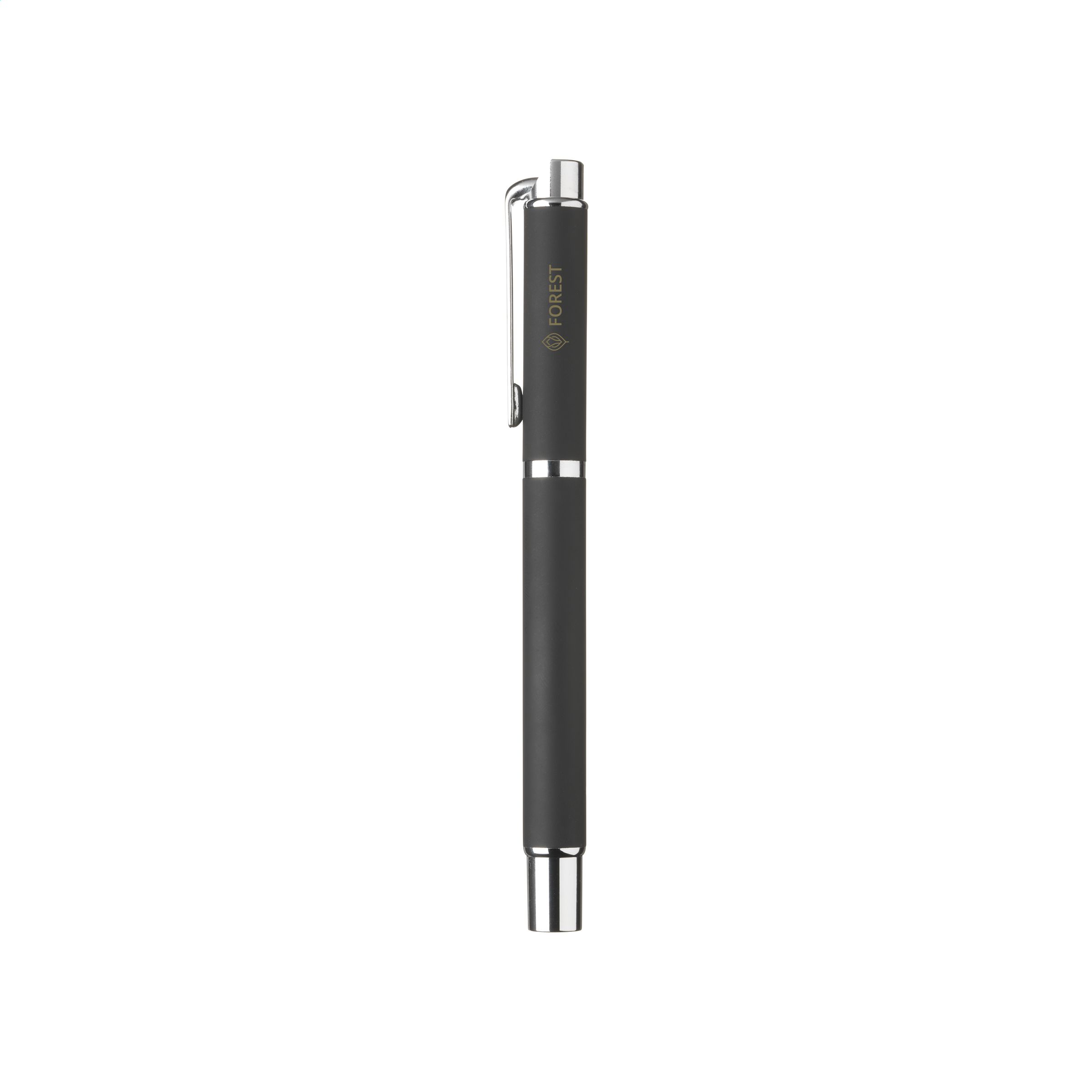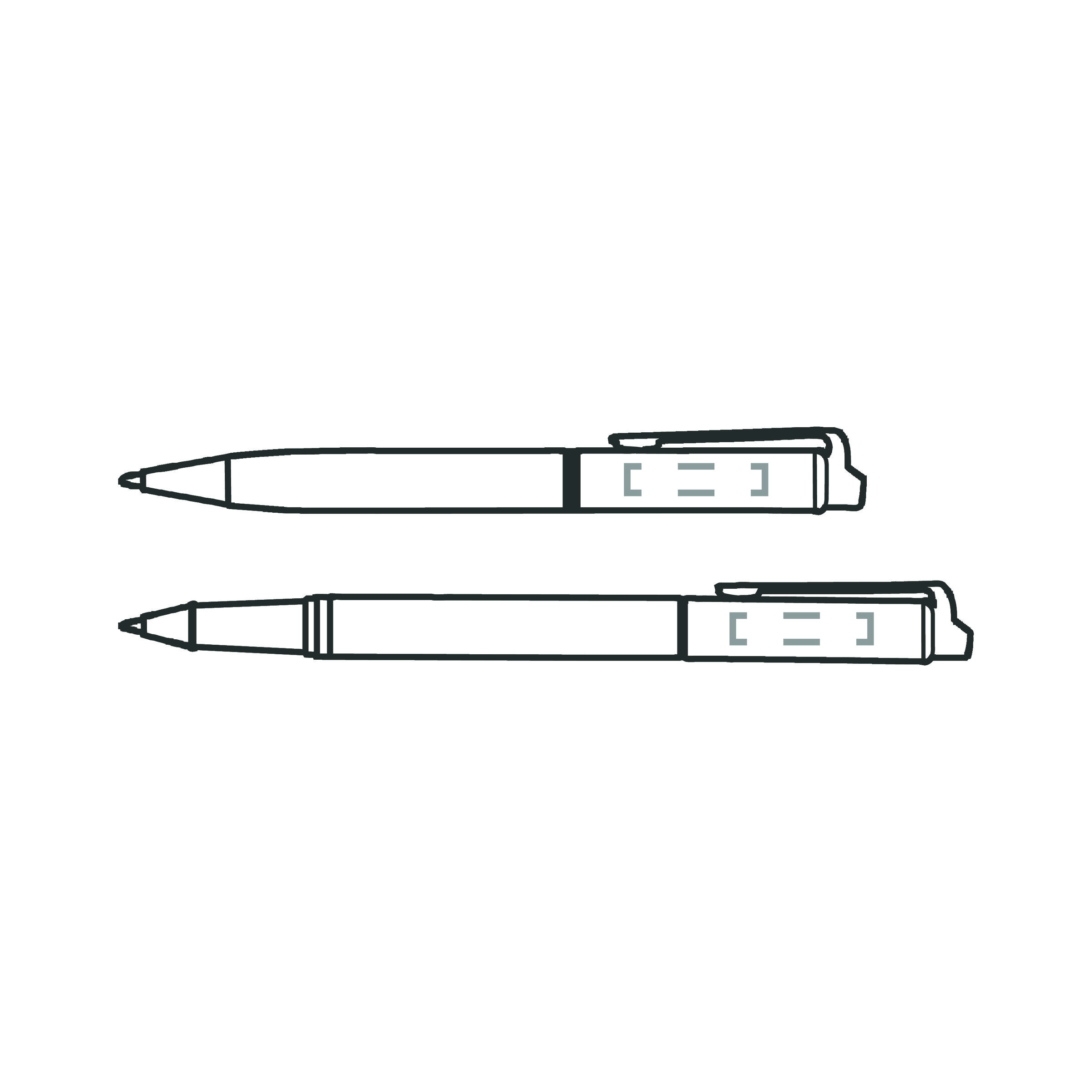 Schickes, metallenes Schreibset: Blauschreibender Kugelschreiber und Fineliner mit schnelltrocknender blauer Tinte. Beides mit stylischem gummierten Abschluss, Clip und hochglänzenden Akzenten. Pro Set in einer Verpackung.