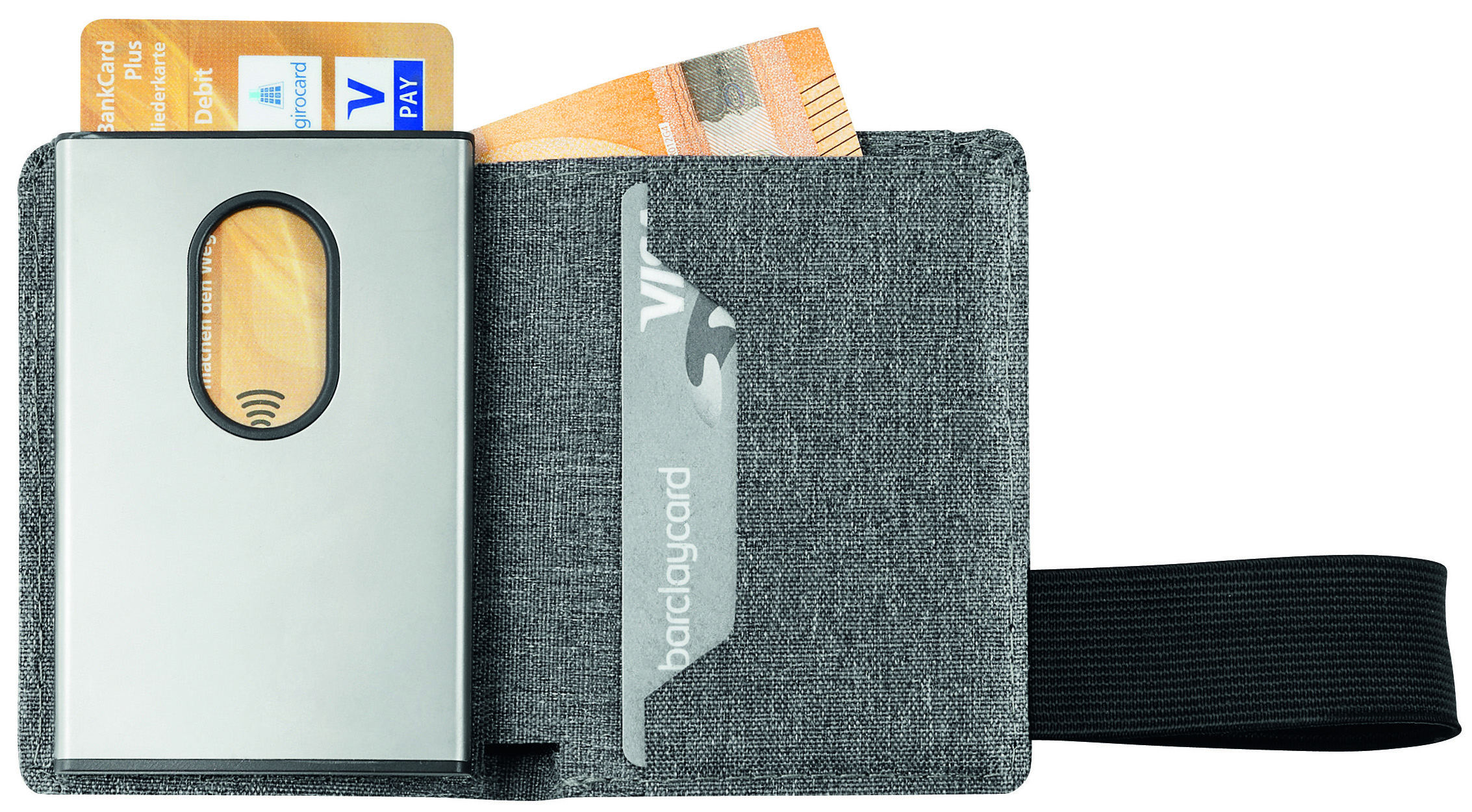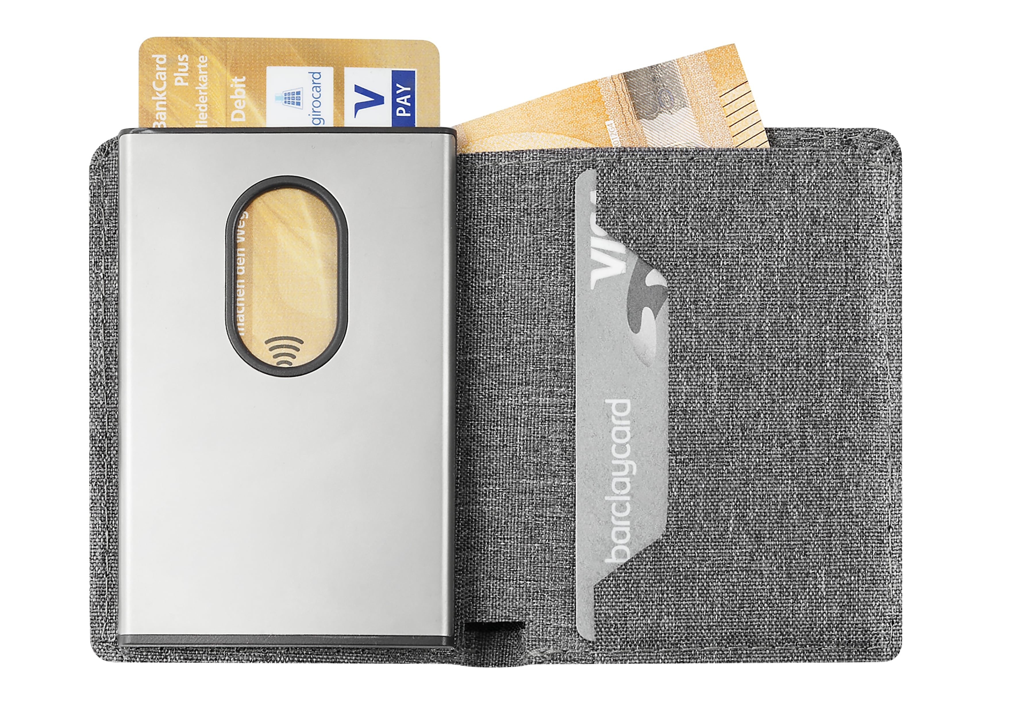 Kompakte Geldbörse in schöner Materialkombination mit Aluminium-Karten-Safe. Für bis zu 5 Karten, RFID geschützt, VPE 100. 3 Kartenfächer, Münzfach