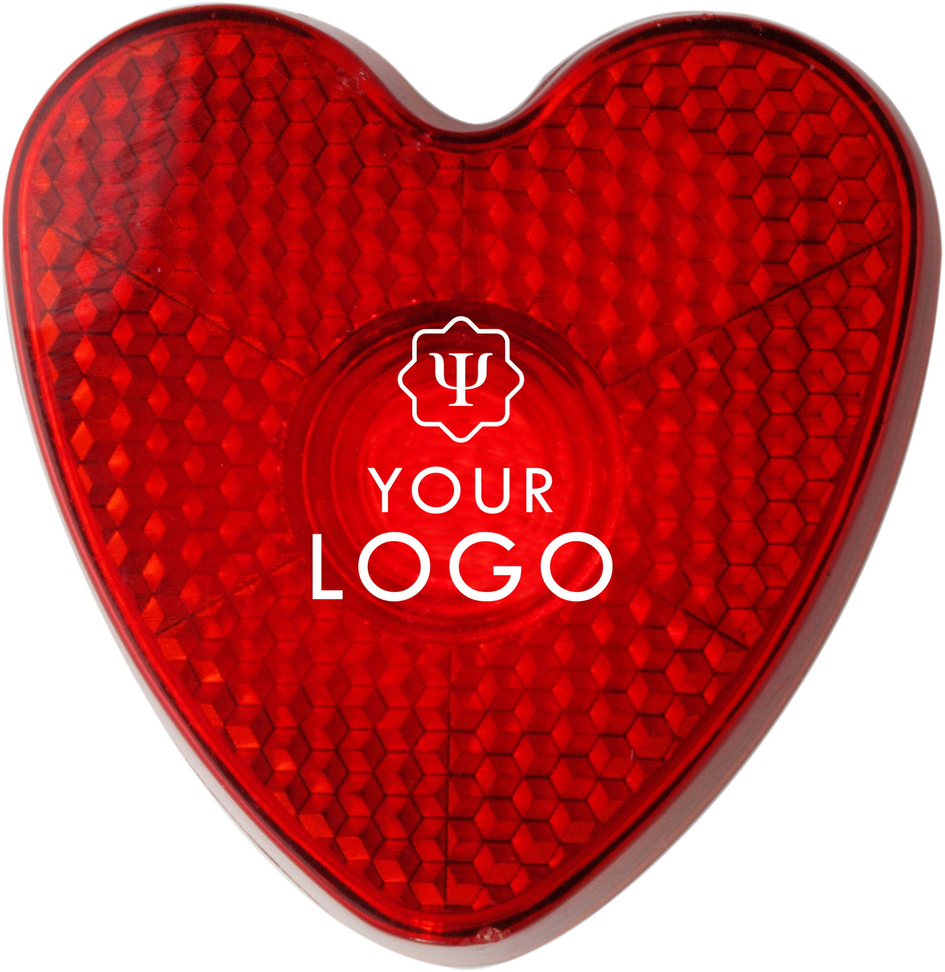 Blinkleuchte aus Kunststoff in Herzform, mit Befestigungsclip für die Anbringung an Fahrradspeichen.