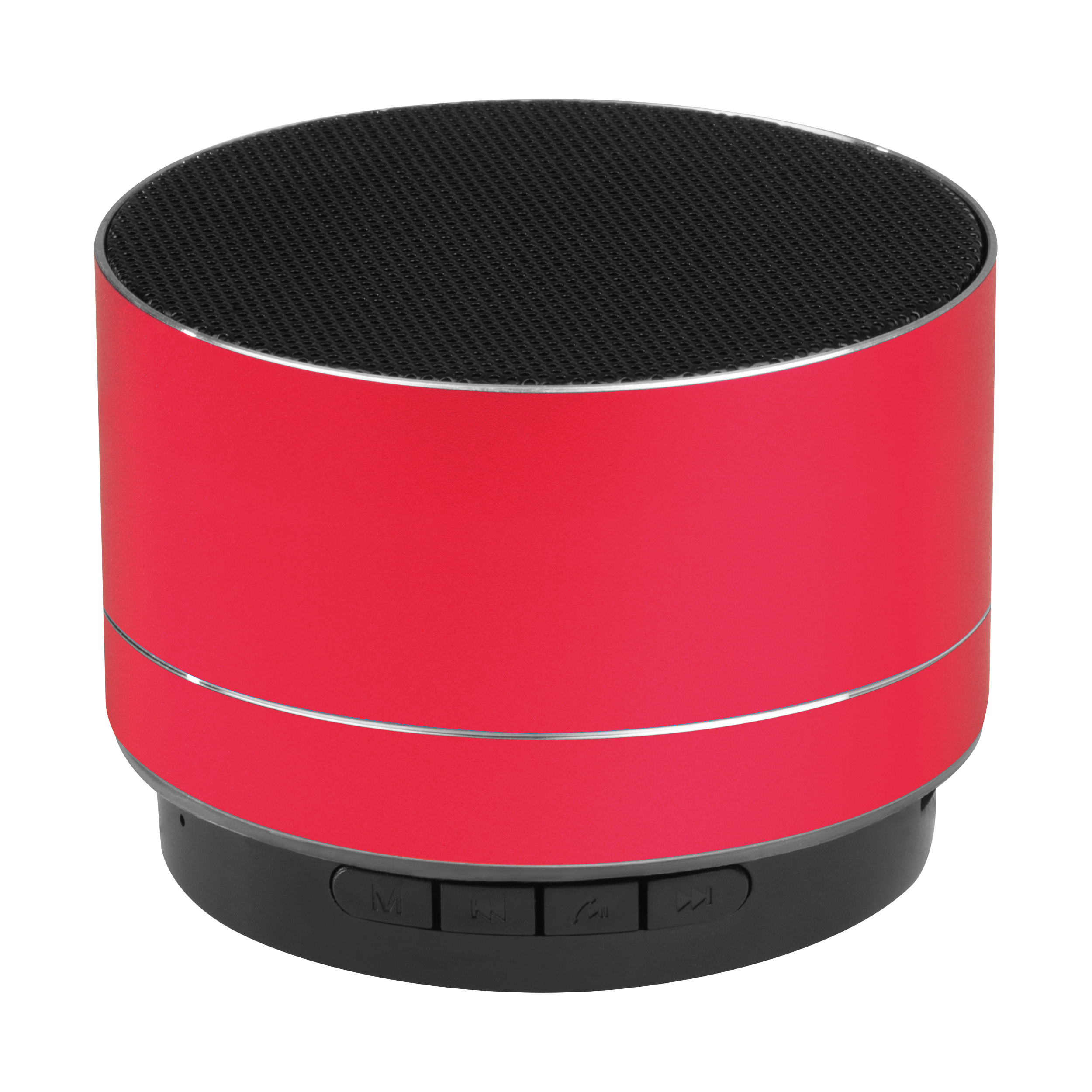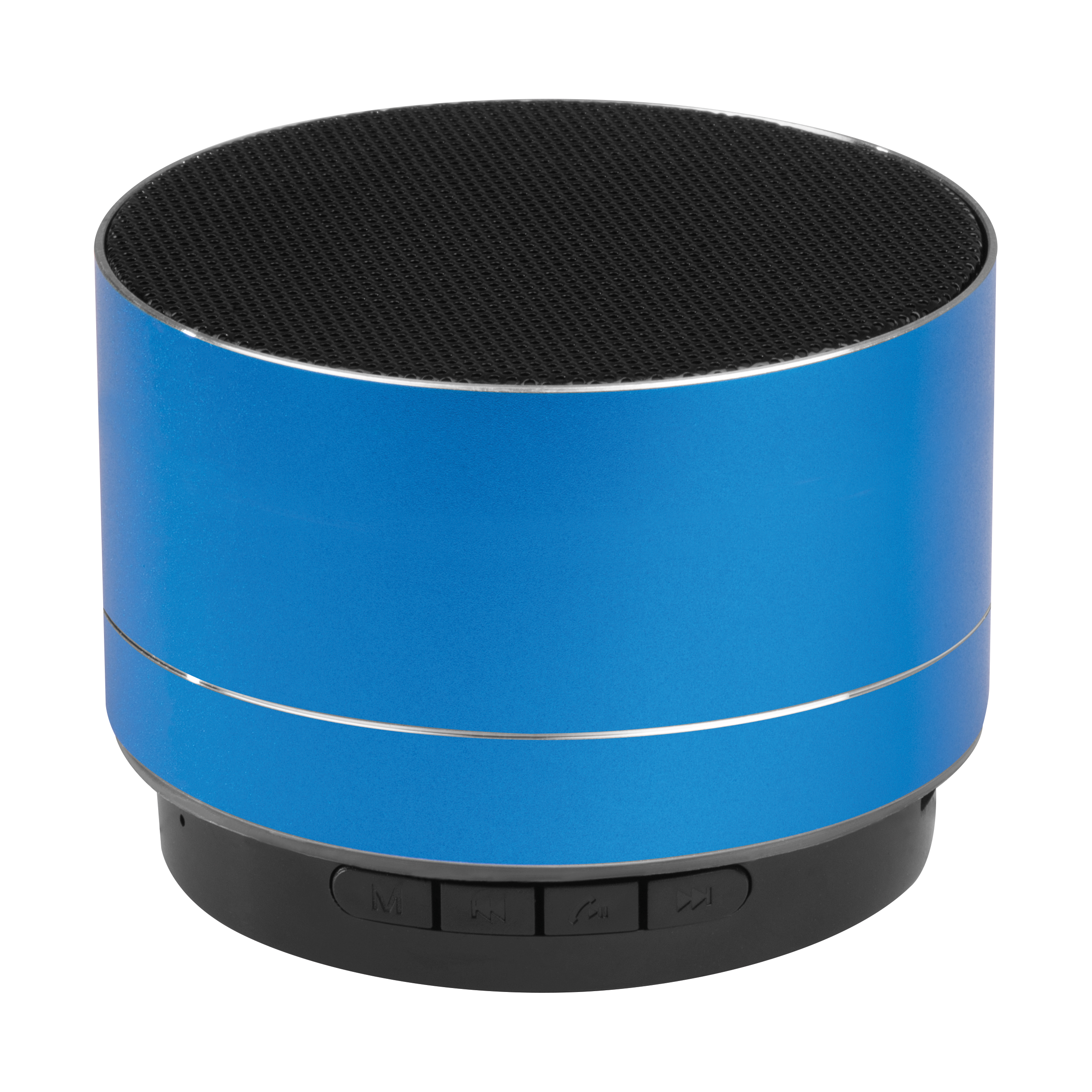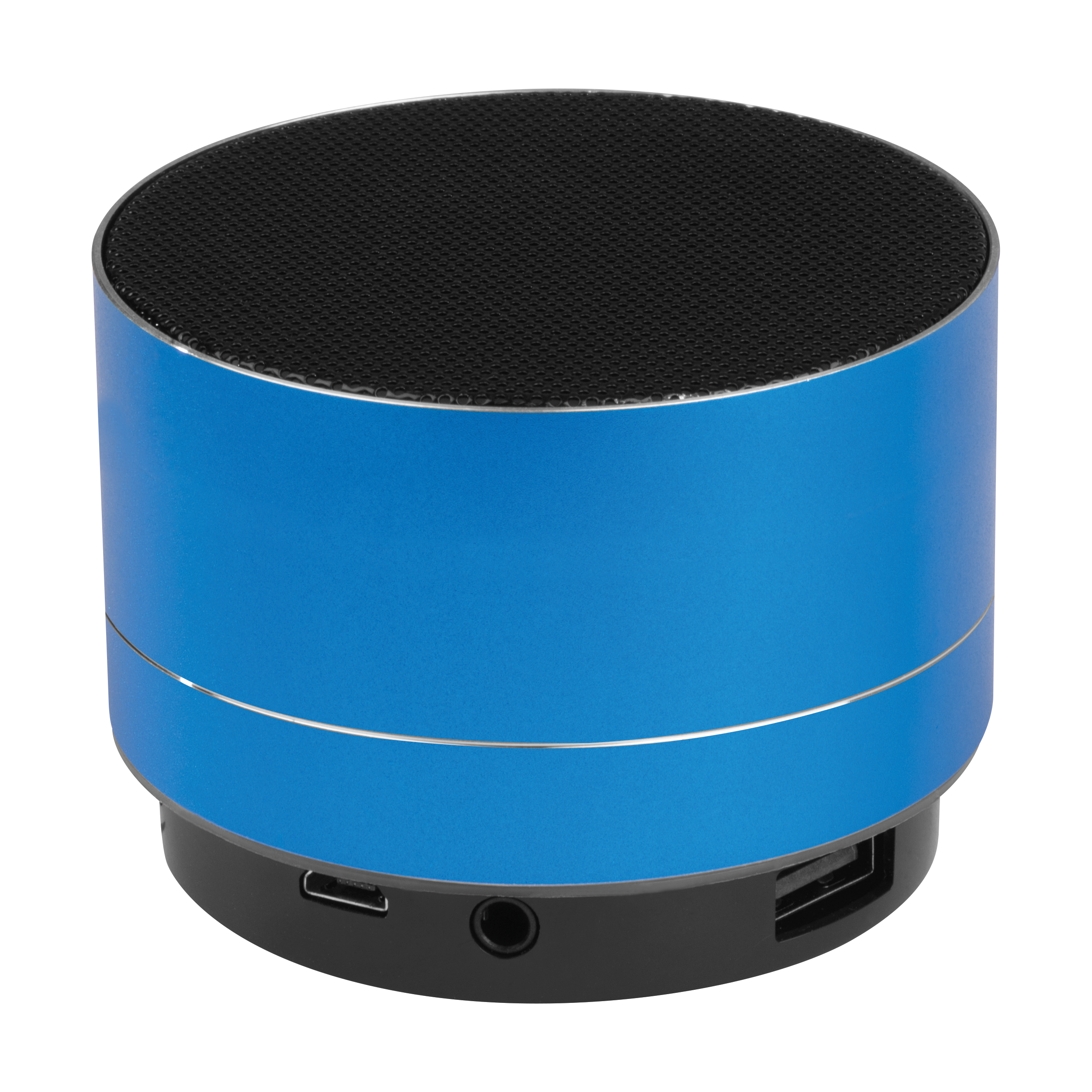 Runder Aluminium Bluetooth Lautsprecher mit eingebautem Akku, integriertem Radio, Slot für eine TF Karte und blinkendem LED Licht auf der Unterseite. Das Micro-USB Ladekabel ist inklusive. Ihre Werbung wird außen auf den Lautsprecher gelasert.