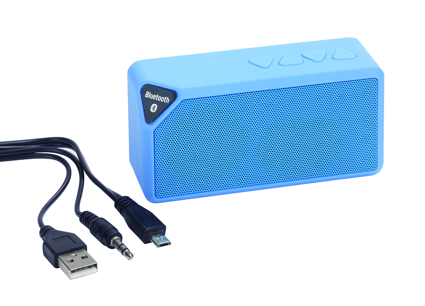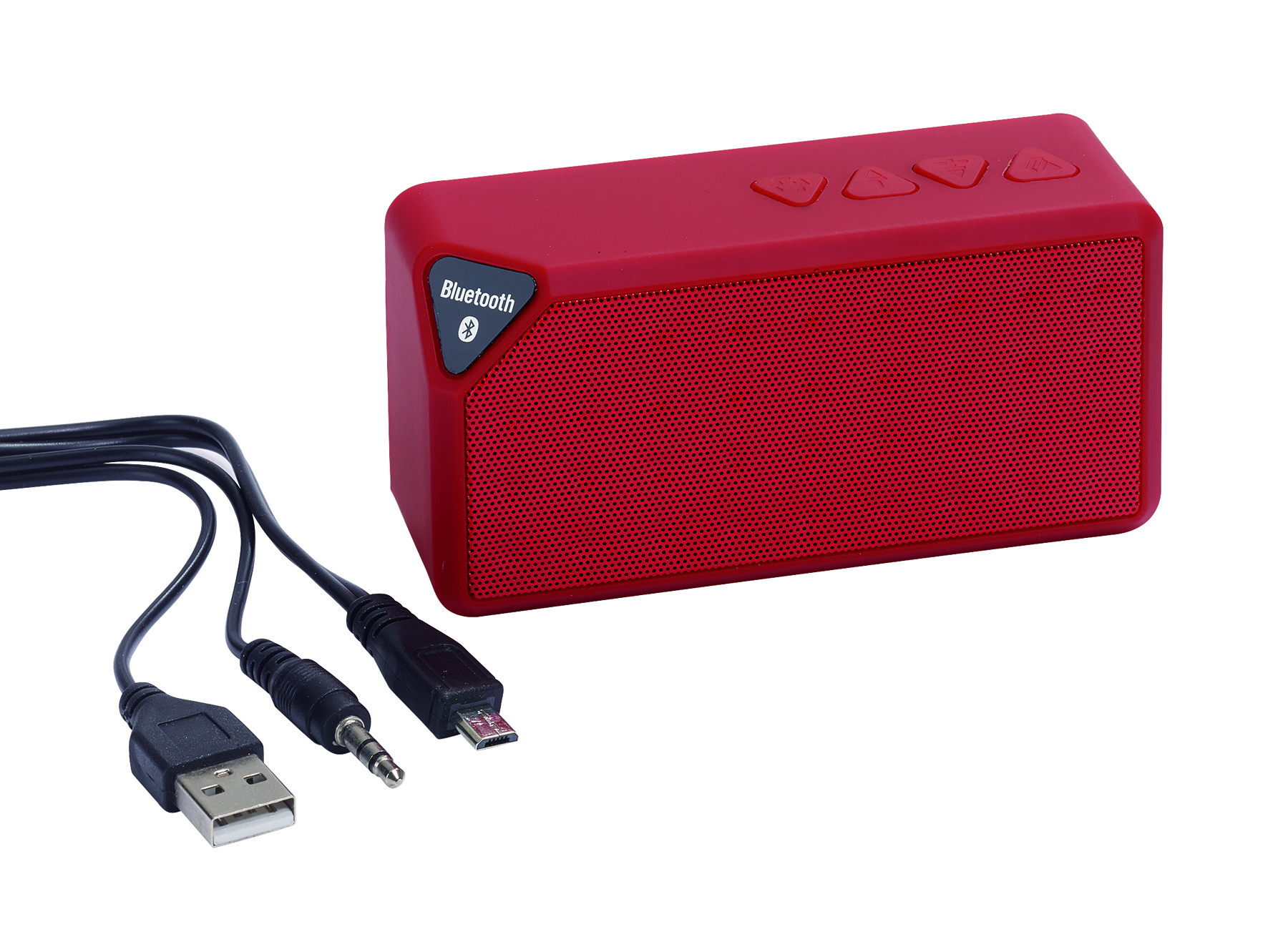 Bluetooth-Lautsprecher CUBOID : Musikleistung: 3 Watt, mit Bluetooth-Version 3.0, zur Koppelung mit Handy, Bluetooth-MP3-Player, Tablet etc., auch an externe Geräte anschließbar über Line-In-Anschluss 3,5 mm Klinke (Kabellänge: ca. 50 cm), Slot für Micro SD Karte, spielt MP3 ab, mit FM-Radio und Freisprechfunktion, max. Reichweite: ca. 10 m, leistungsstarker Akku, Kapazität: 300 mAh, USB-Aufladekabel mit Micro-USB-Stecker (Länge: ca. 50 cm) inkl., Laufzeit: ca. 2-3 h, Aufladezeit: ca. 1 h, Bedientasten oben, An- und Ausschalter auf der Rückseite, rutschfeste Bodenfüße und farbig-gummiertes Gehäuse Geschenkbox