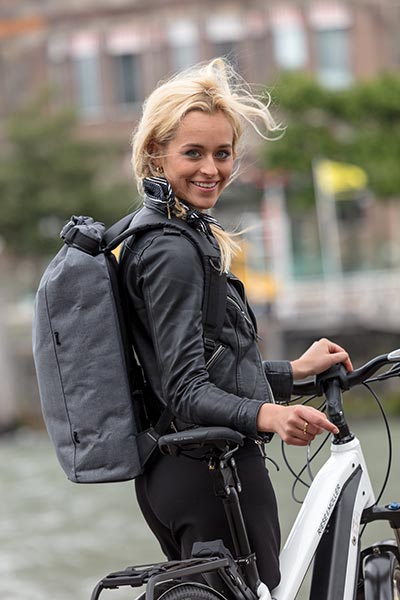 Stylischer Rucksack mit reflektierenden Elementen am Rucksack und an den Tragegurten, sorgen für die ultimative Sicherheit im Dunkeln. Die glatt beschichtete Oberfläche des verwendeten Materials, das Rolltop und der verschweißte Reißverschluss, machen den Rucksack wasserabweisend (IPX1). Das Rückenteil und die Schultergurte sind gepolstert für mehr Tragekomfort. Qualität: 900D