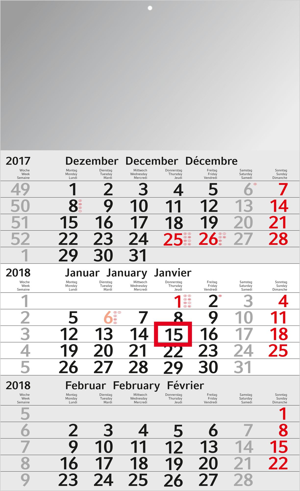 Kalendarium: Deutsch 3sprachig D/GB/F; hellgrau; Ausstattung: Datumsschieber rot; Format: 300 x 490 mm gesamt; 300 x 350 mm Kalendarium; Druck: 4C-Quality Digital inklusive; Verpackung: Wellpapp-Versandtasche weiß:; Nr. 41 – 495 x 328 mm; Werbefläche: 300 x 150 mm am Kopf;