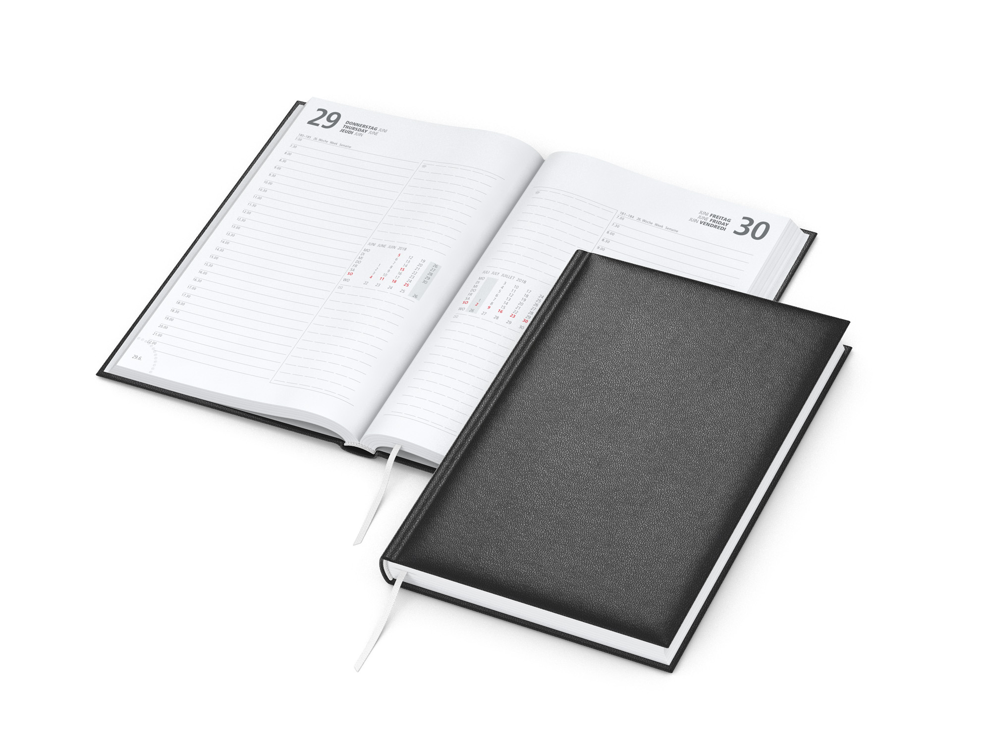 Format: 148 x 210 mm gesamt (DIN A5); 142 x 205 mm Kalenderblock; Kalendarium: Deutsch 3sprachig D/GB/F; je Tag eine Seite; Samstag und Sonntag zusammengefasst; Halbstunden-Einteilung von 7 bis 22 Uhr; Informationsteil; Umfang: 320 Seiten; Verarbeitung: Hardcover mit wattierter Buchdecke ; Eckenperforation ; Lesezeichen ; Kapitalband ; runder Rücken; Einband: Balacron dunkelblau, schwarz; Druck: Silberprägung inklusive; Verpackung: Wellpapp-Verpackung weiß:; Nr. 23 — 285 x 200 mm; Werbefläche: 100 x 50 mm;