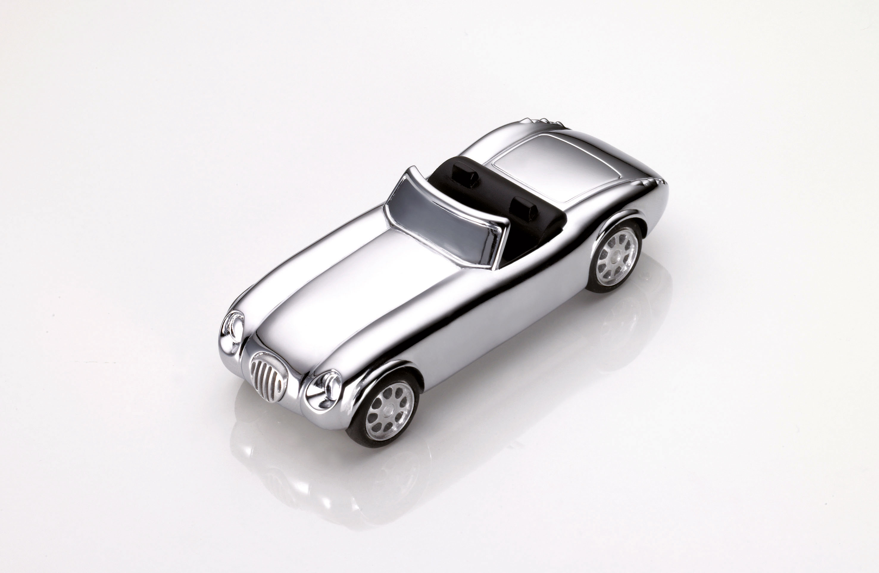 Büroklammernhalter und Briefbeschwerer, Roadster, 50er Jahre Stil, Rückziehmotor, Magnet für Büroklammern, inkl. 5 Büroklammern, Metallguss, verchromt, glänzend, silber/schwarz Open Air ROAD "STAR" - das 50's Tisch-Cabrio mit Stil und Rückziehmotor. Inkl. Magnet und 5 Klammern. Ein echter Goldtimer ist ROAD "STAR", das rasante Cabrio für alle, die auch am Schreibtisch Vollgas geben. Einfach Rückziehmotor aufziehen und schon schnurrt ROAD "STAR" los. Der unsichtbare Magnet hält Büroklammern auch in der Kurve sicher fest.